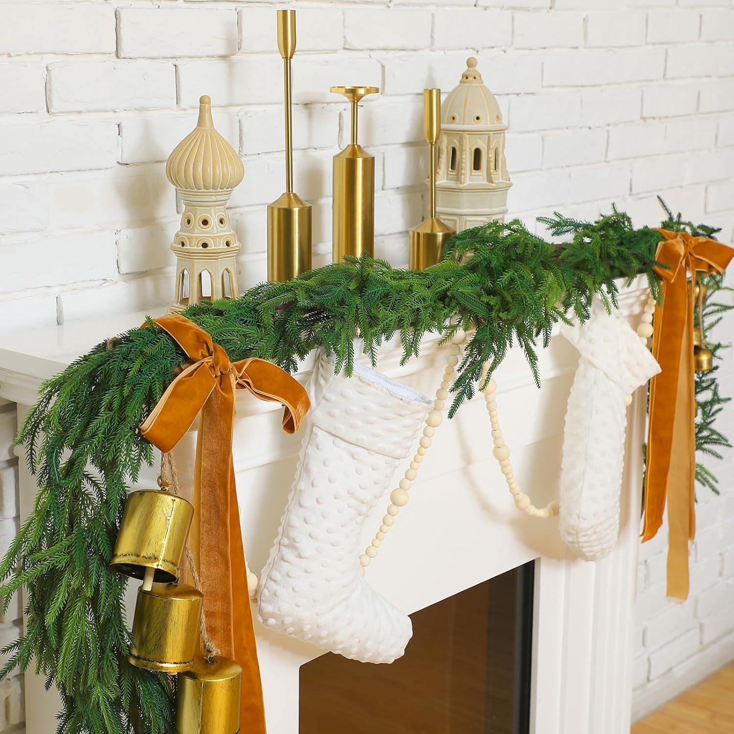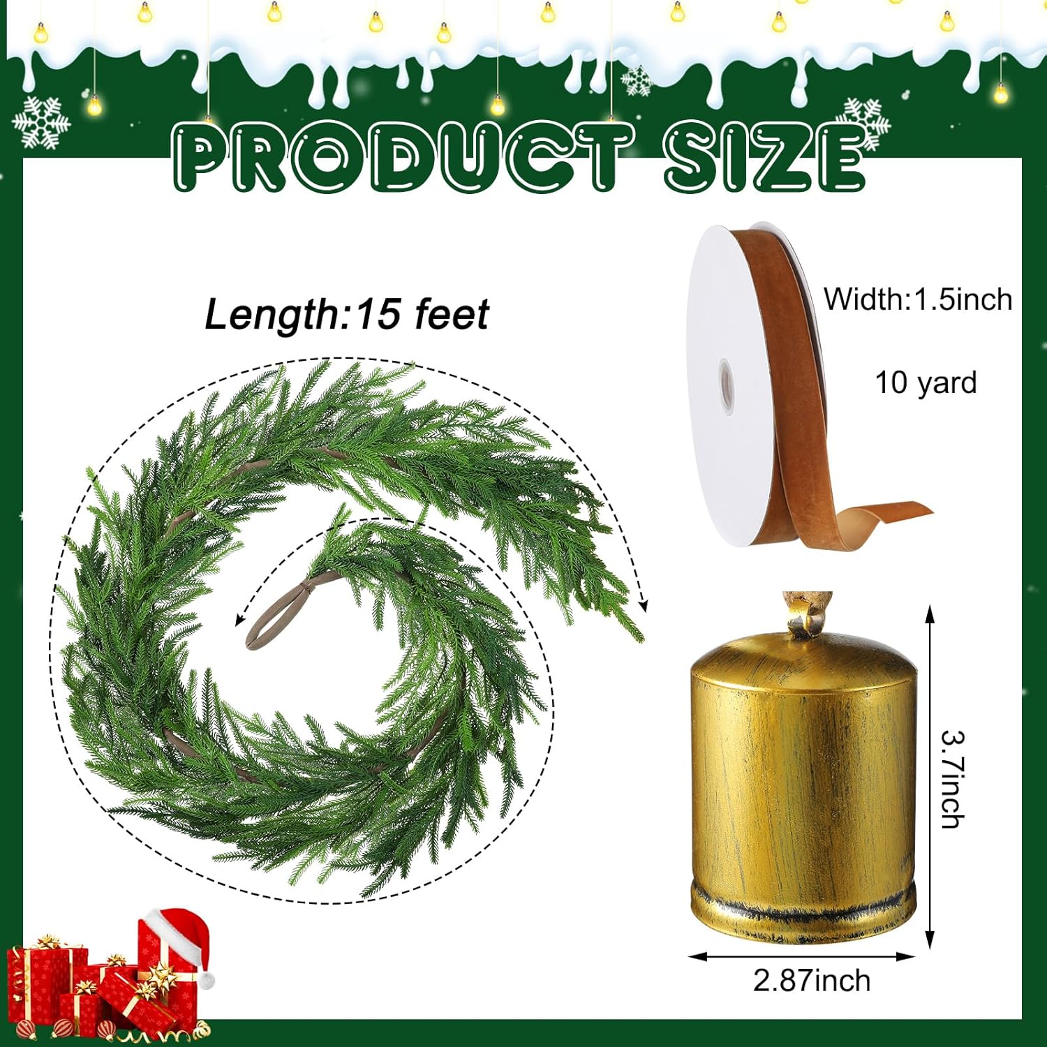 1 Pcs Norfolk Pine Garland with 1 Pc Khaki Velvet Ribbon 3 Pcs Rustic Iron Wrought Bell for Christmas Home Decor(15 Ft)