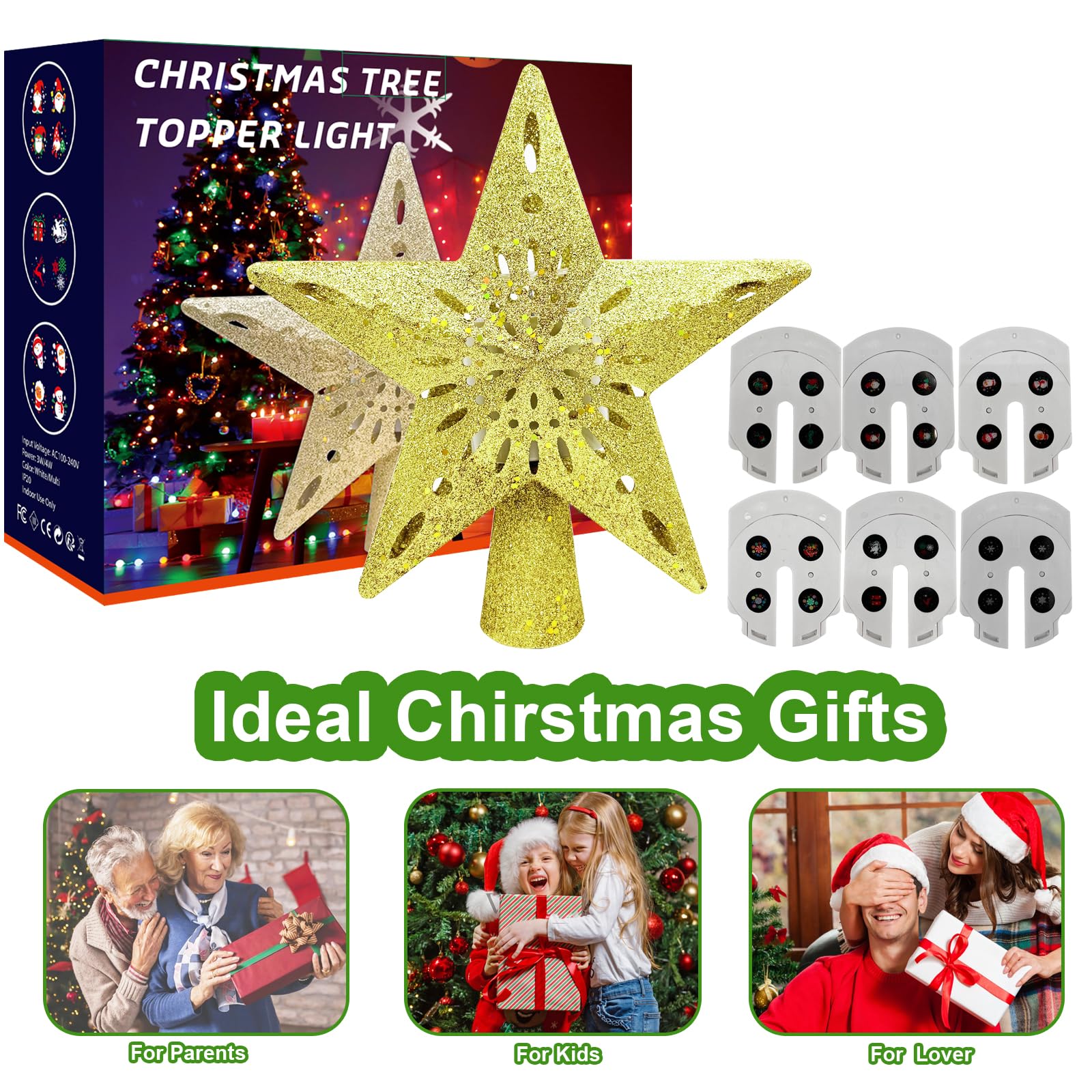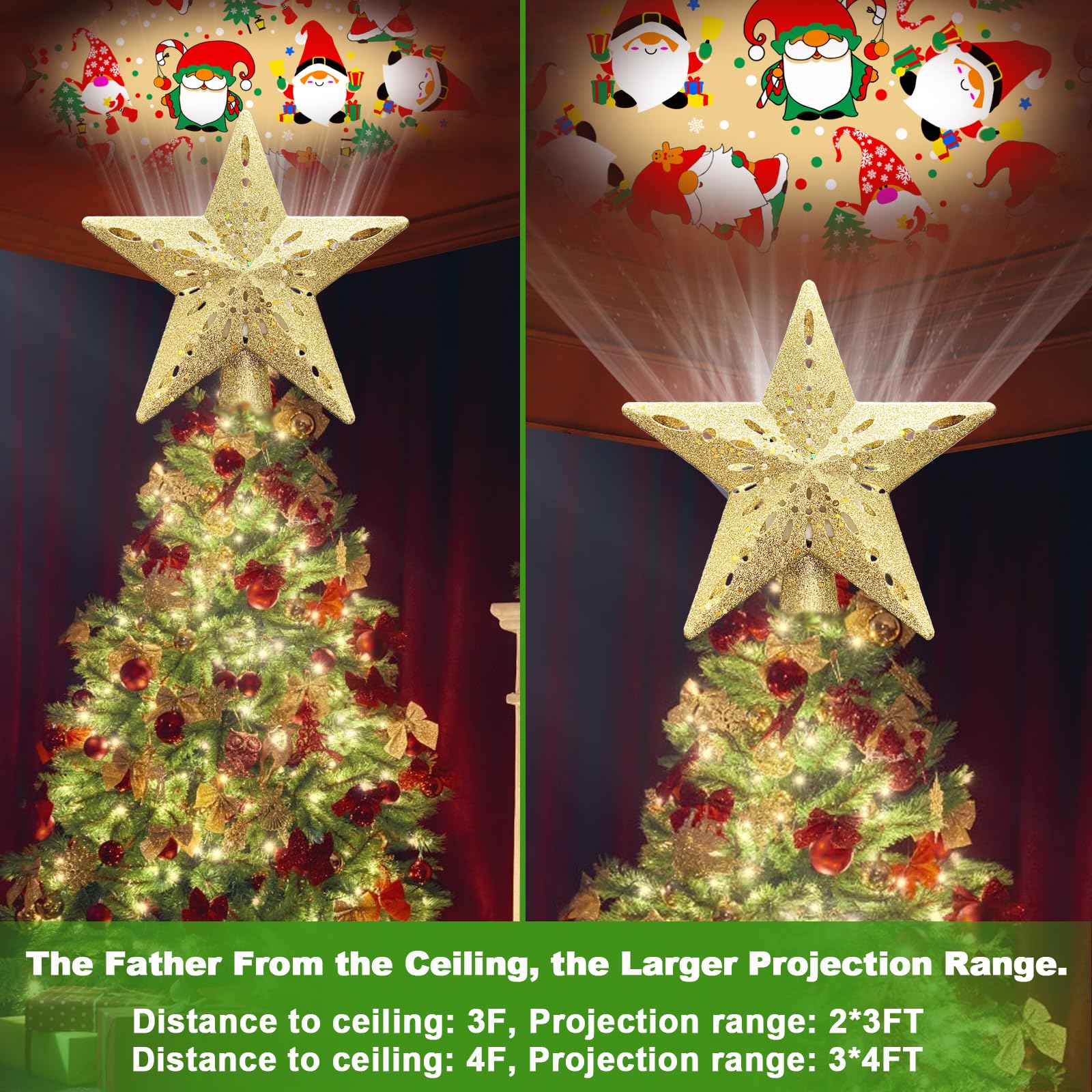 6 Dynamic Projection Patterns - Our Christmas tree topper comes with 6 different pattern cards: Grinch, Candy, Christmas Gnome, Santa Claus and snowman, reindeer and , and snowflake. Just insert the projection cards to the slot, plug in the AC power, it will light up and project the high definition pattern moving on the ceiling above to present a wonderful light show. Magic 3D Rotating Projector - The Christmas tree topper star is 3D hollow design, built-in 360° rotating LED projector, can project the patterns swirling and dancing across the ceiling. The farther from the ceiling, the larger projection range. We recommend to keep 3-7ft distance from the ceiling for a best projection effect, and it's recommended to work well with 5-7FT tall Christmas trees.