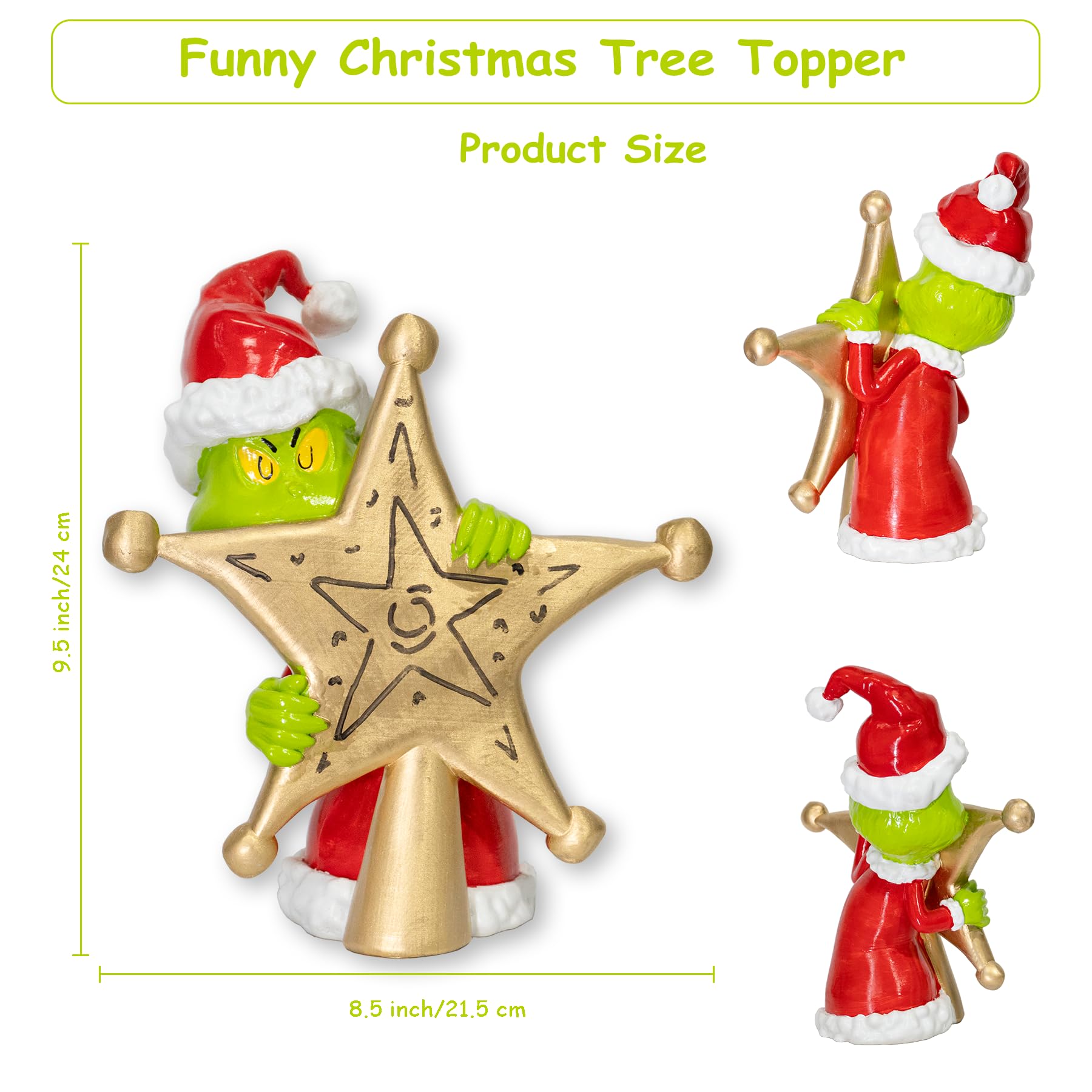 10 inch Christmas Tree Topper, Cute and Funny Christmas Thief Hiding Behind Gold Star Sculpted Tree Topper, Hand-Painted Unique Red Green Xmas Monster Decorations for Table Shelves Home Indoor