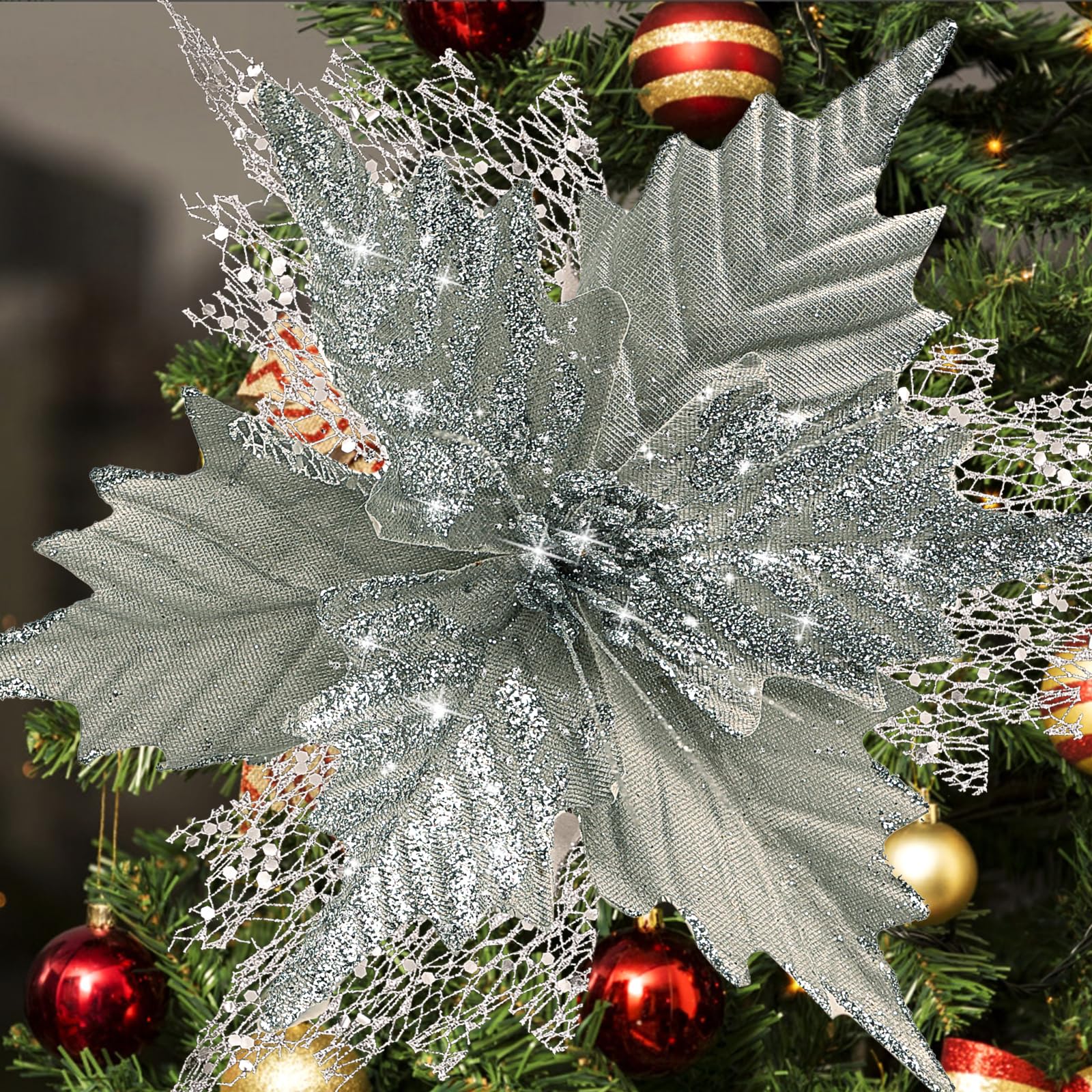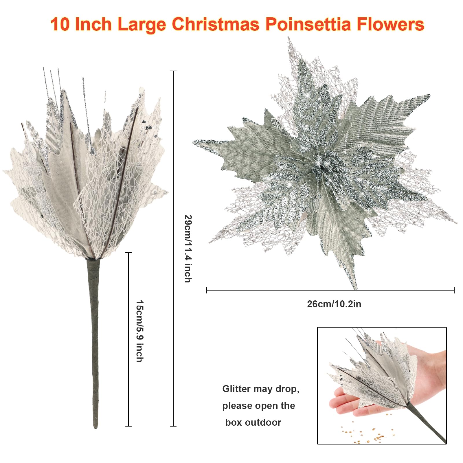 Beautiful Christmas Tree Decorations: 10 inches large Christmas poinsettia flower is made of high quality silk, plastic and glitter, not easy to fade, can be reused for the next year, 8 colors for you to choose (gold, white, red, silver, champagne , pink, blue, lake blue). Glitter petals make the Christmas tree more eye-catching and add festive atmosphere Perfect Large Size: Set of 10 pcs large poinsettia Christmas decorations, the petal diameter is 26cm/10 inch, the length of the flower stem is 15cm/5.9 inch the large size is more suitable for decorating the Christmas tree or Christmas wreaths, making your Christmas tree or Christmas wreath look richer and fuller