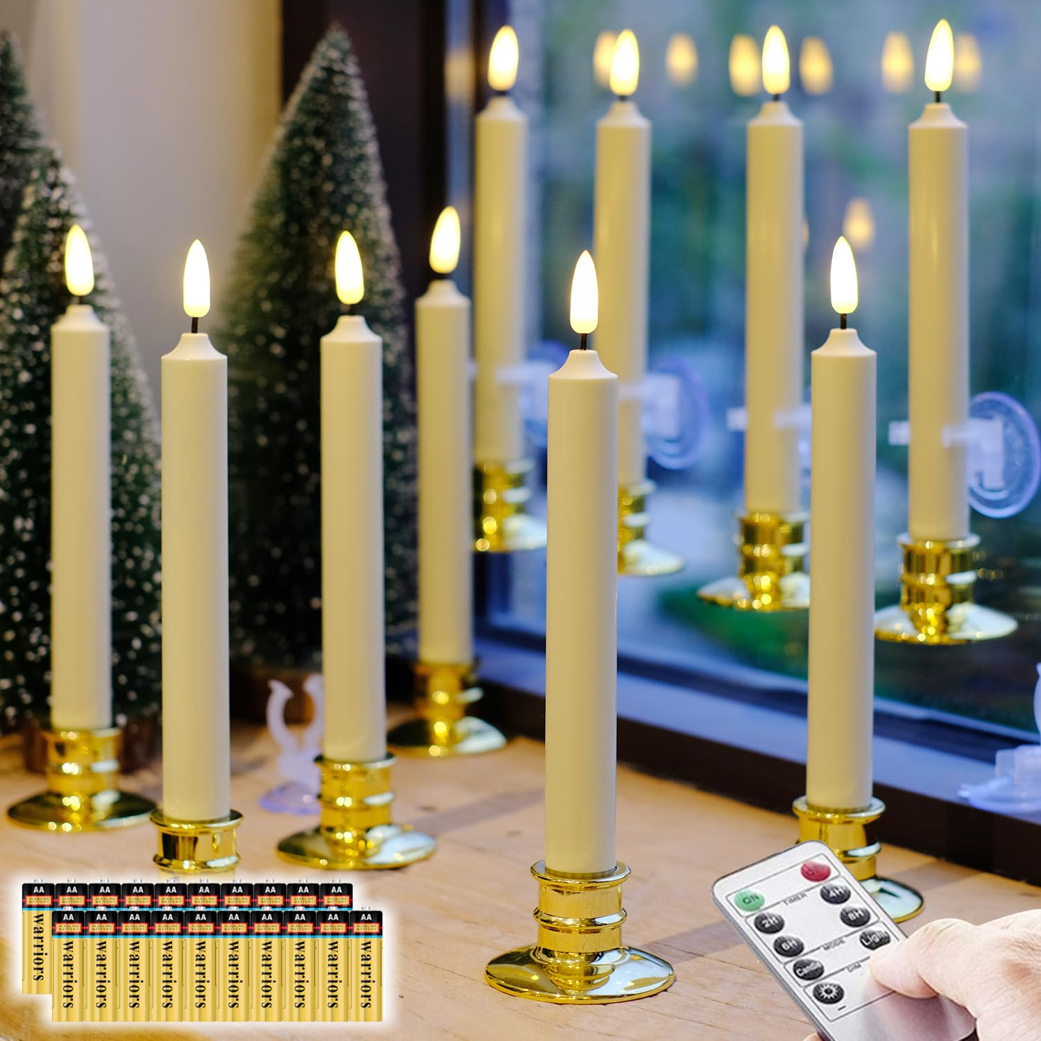 10 Pack Window Candles +20 AA Batteries(Include,Run More Than 400 Hours) + Candleholders + Suction Cups+ 2 Remote. 8'' Tall. IVORY LED Battery Powered Candle. 3D Flickering Wick, Timer Function