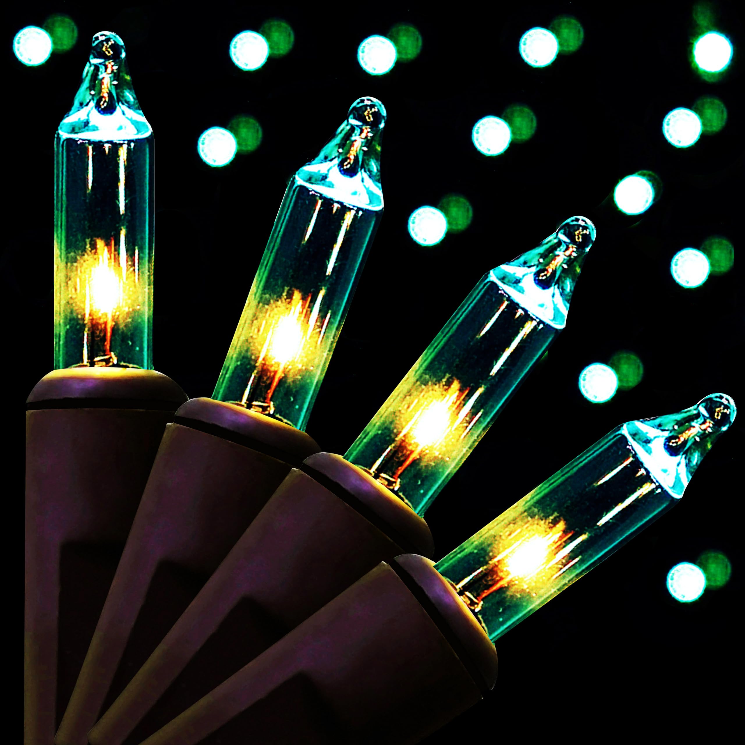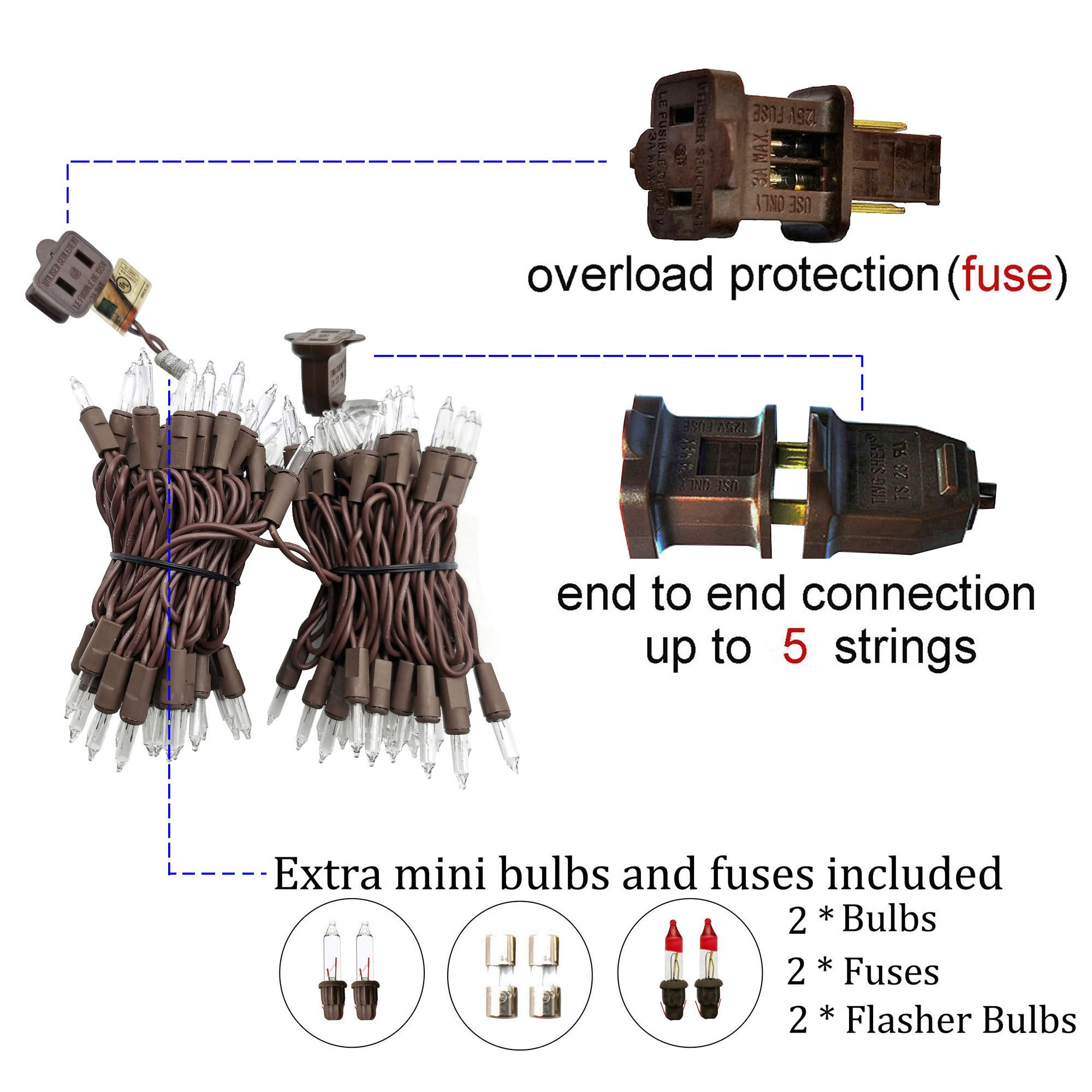 Total 23Feet, lead cord 23 Inches, tail cord 4 Inches, 2.5 Inches distance between each bulb, use brown cord, 100 count clear incandescent mini bulb, super bright, warm and romantic. It can be replaced by a 2.5 Volt 0.41 Watts bulb. UL Approved brown Christmas Lights use UL plug, the male plug adopts overload protection by 2pcs fuses, very safety. On the lead cord, there is an accessory kit, included 2pcs fuses, 2pcs mini bulbs, 2pcs flasher bulbs and an instruction sheet. You can replace the fuses or mini bulbs according to the instruction sheet, when necessary.