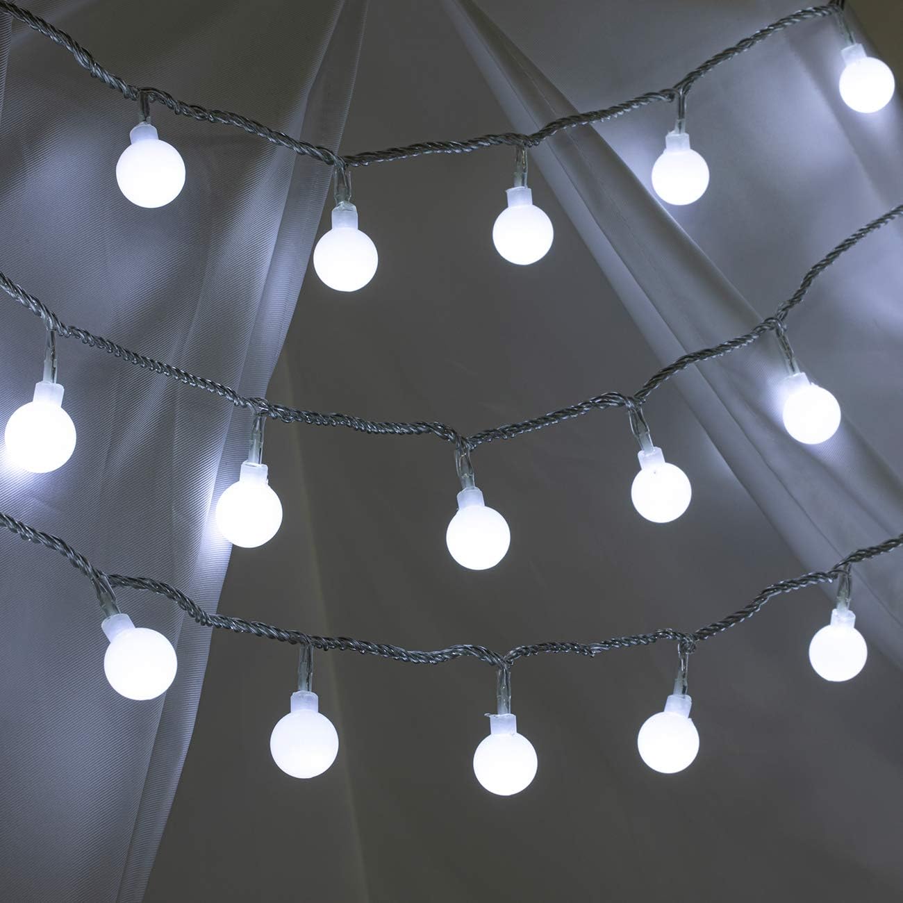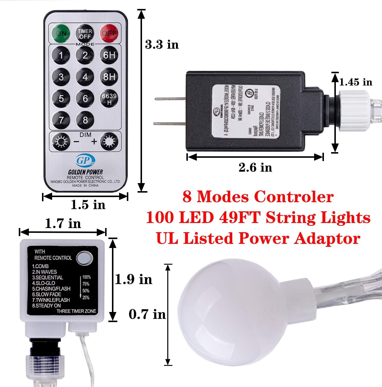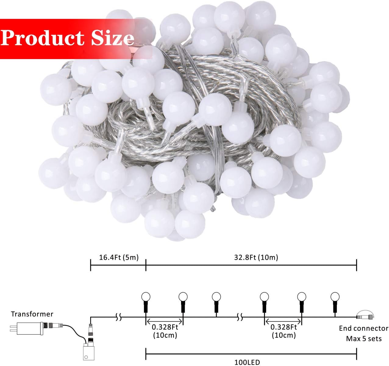 High Quality: 100 LED 49 FT globe ball shaped string lights with solid construction plastic material, adapter powered. 29V low voltage string lights with UL 588 for safety use. Diameter of the bulb is 0.7''. Length between lights : 4 Inches, power line: 16.4ft. light string: 32.8ft, length totally: 49ft approx. 8 Modes: 8 Functions to fit different occasions, moods, feelings, holidays, festivals, anniversaries, etc. Satisfied different requirement. (Combination, In waves, Sequential, Slow Glow, Chasing/Flash, Slow fade, Twinkle/Flash, Steady on).
