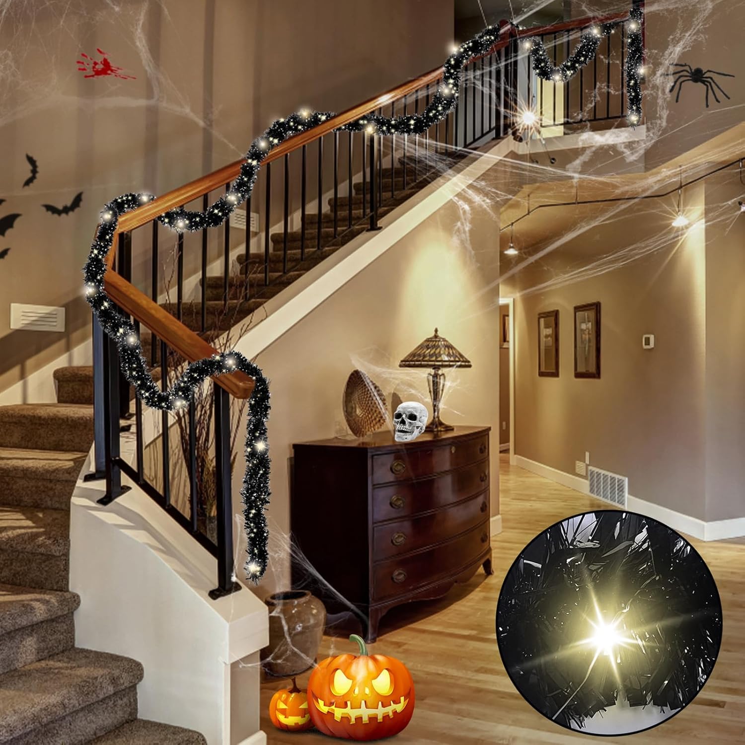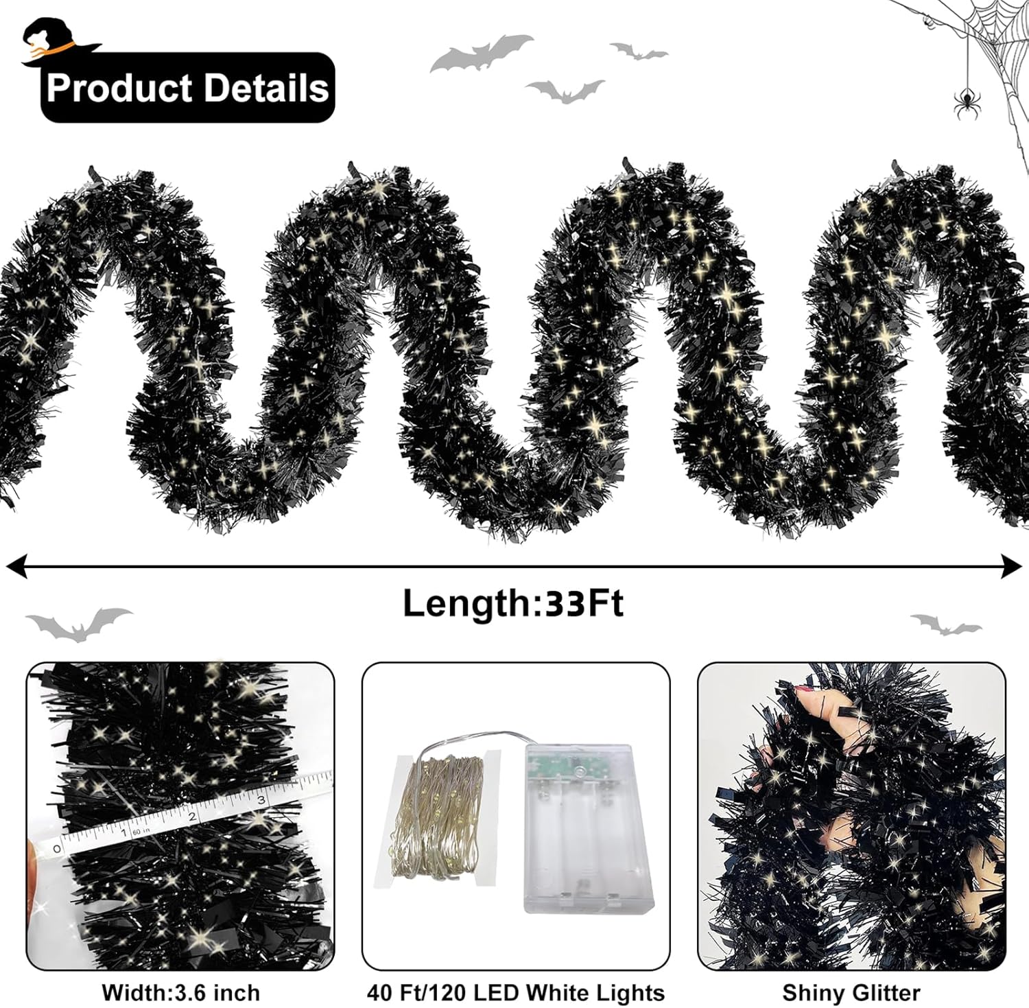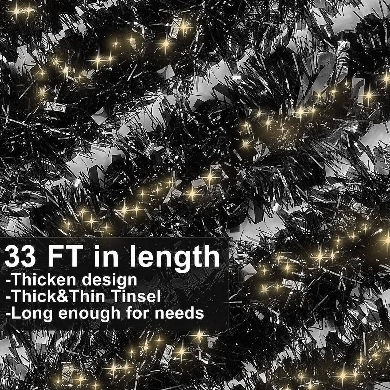 100 LED Lights TURNMEON 33 Ft Long Black Christmas Prelit Black Tinsel Garland Decorations Thick Thin Shiny Metallic Tinsel Twist Garland for Christmas Tree Decorations Home Indoor Outdoor Party