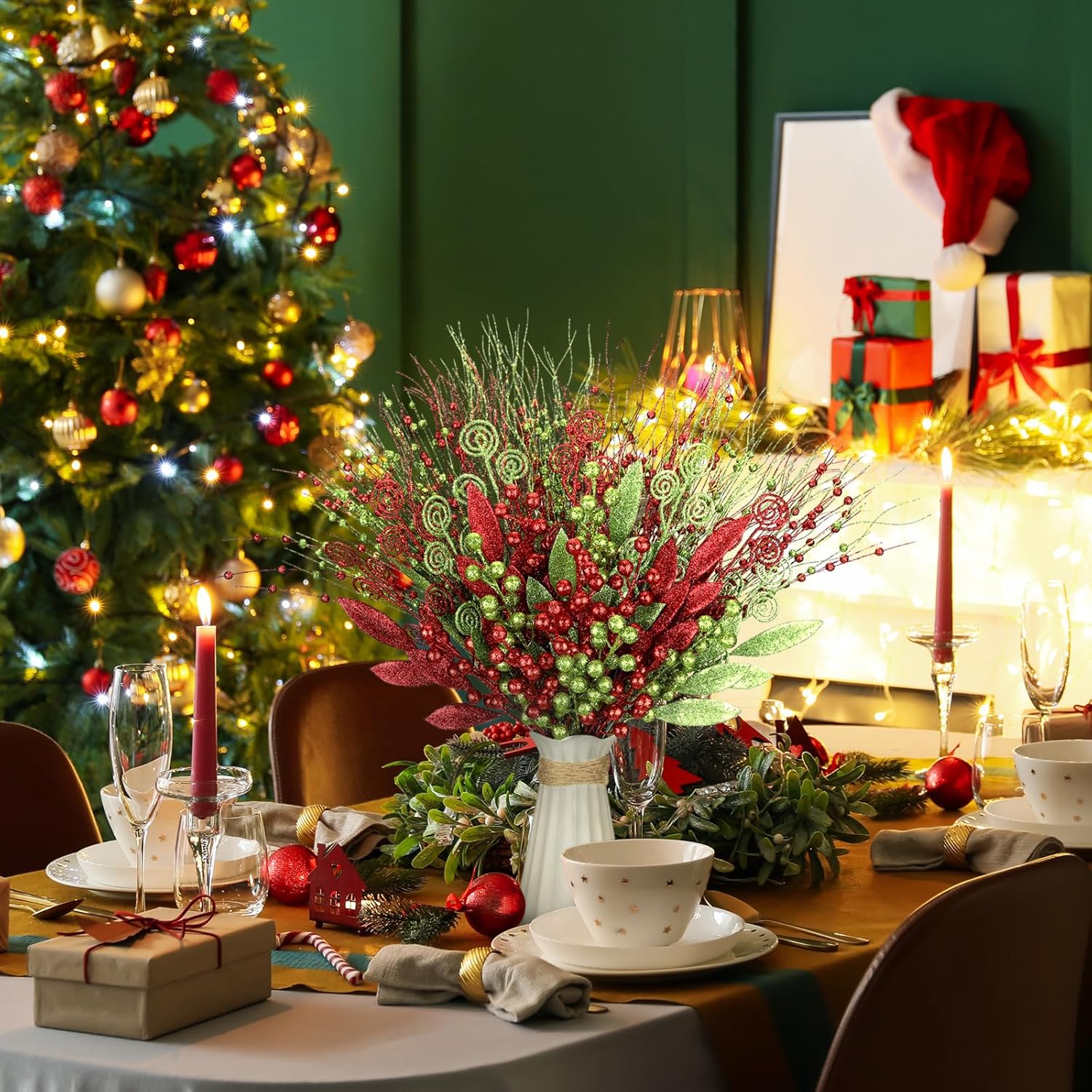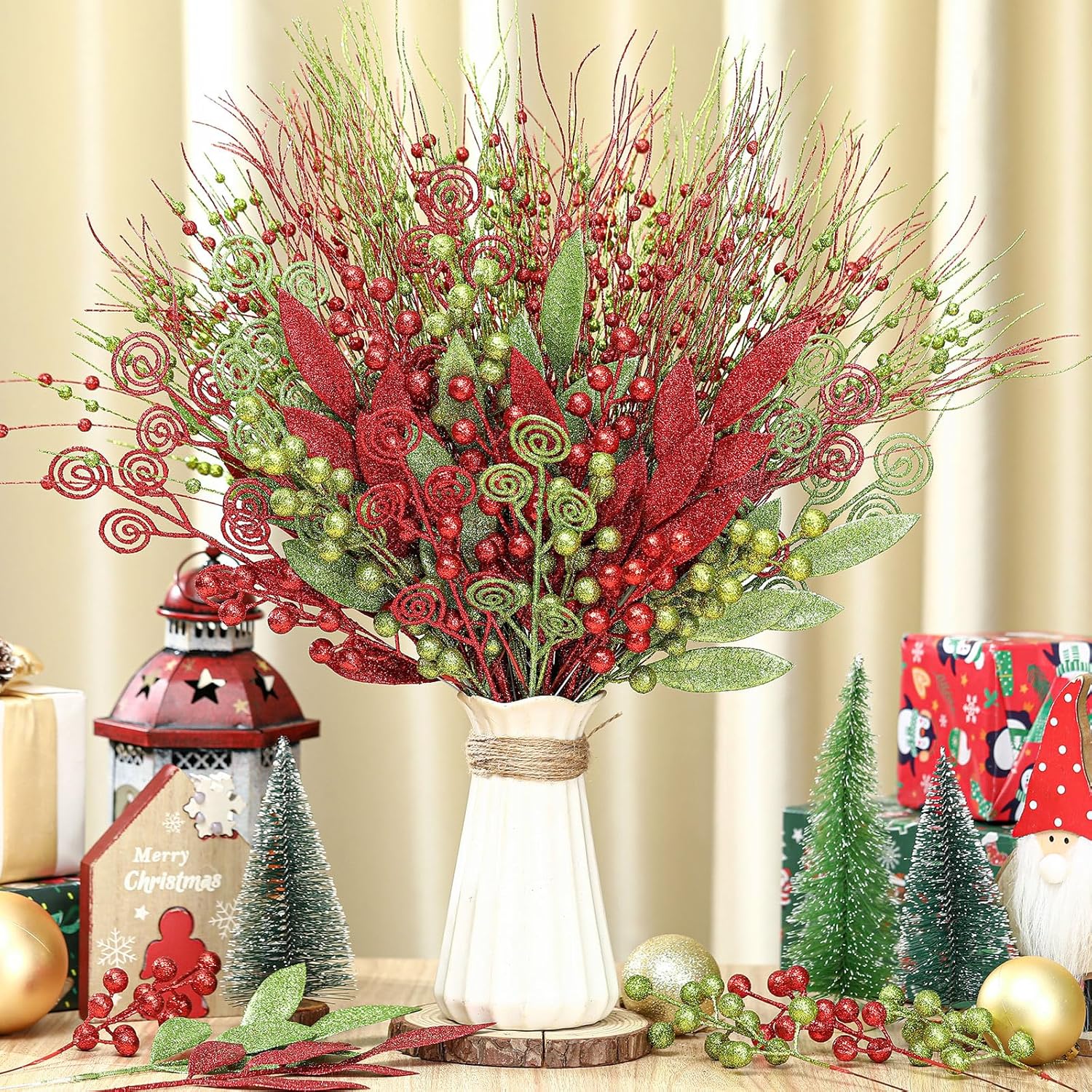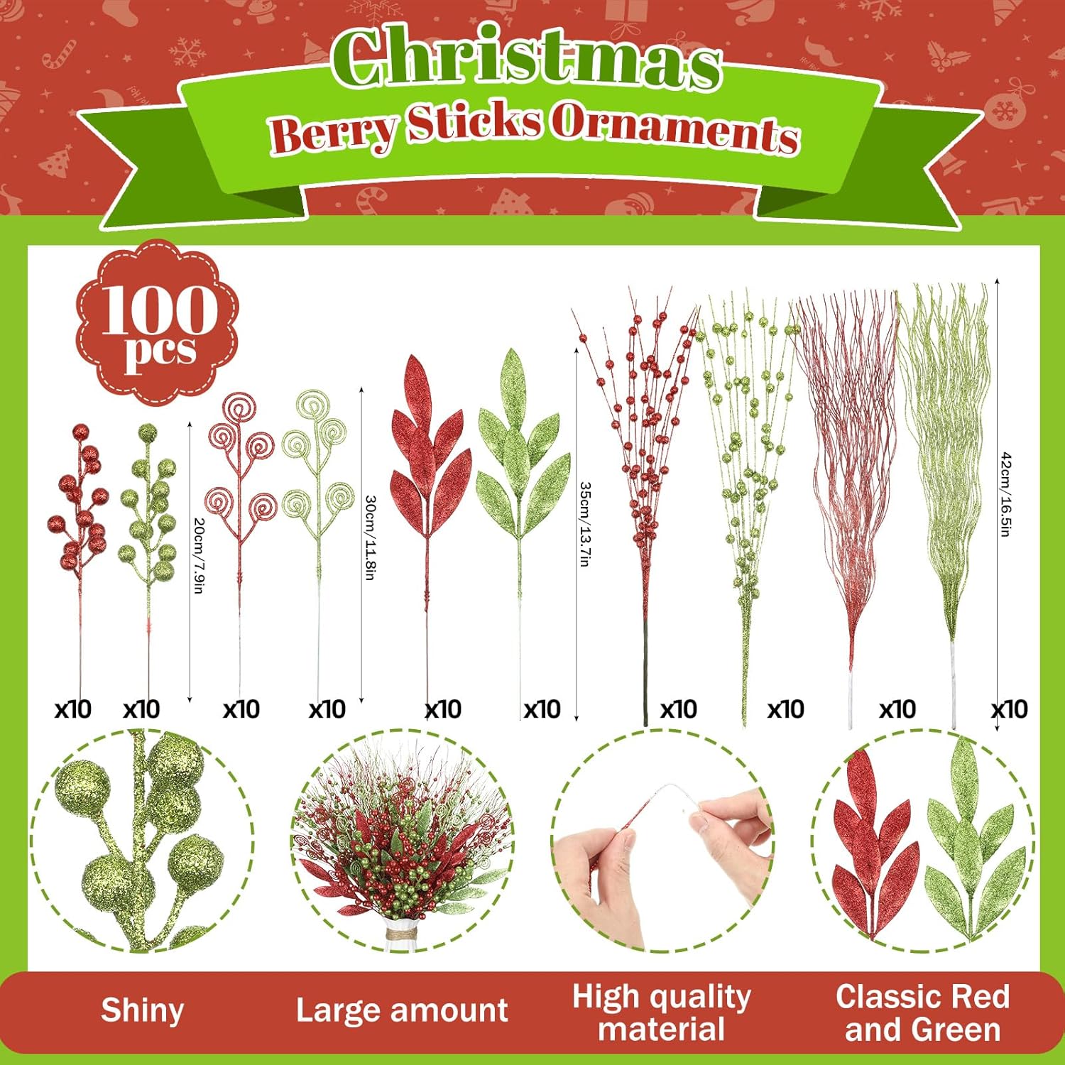 100 Pcs 17'' 12'' Red Green Christmas Berry Stems Ornaments Artificial Glitter Curly Christmas Picks Sprays Fake Christmas Sticks Decorations for Xmas Tree Wreath Crafts Vase Filler Home