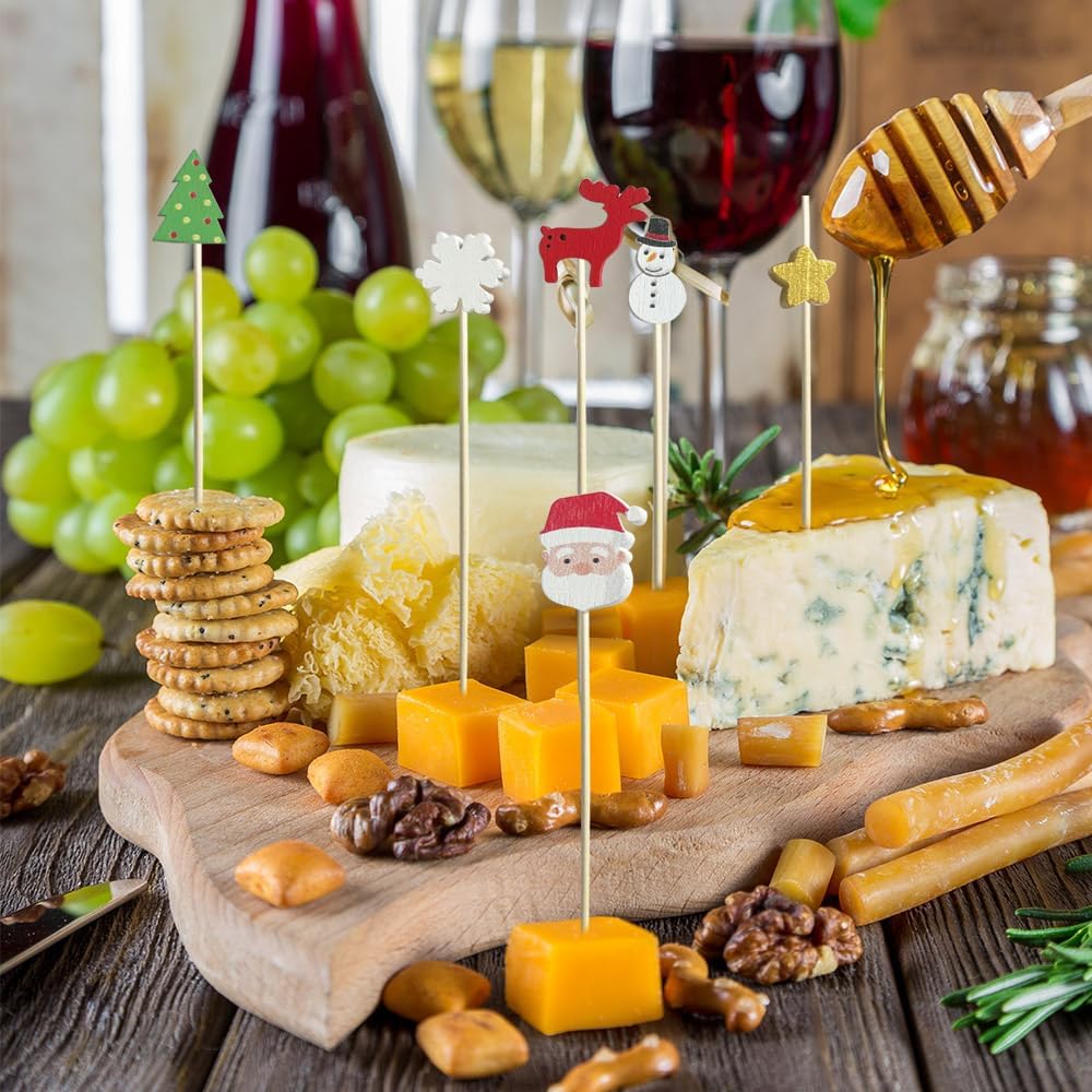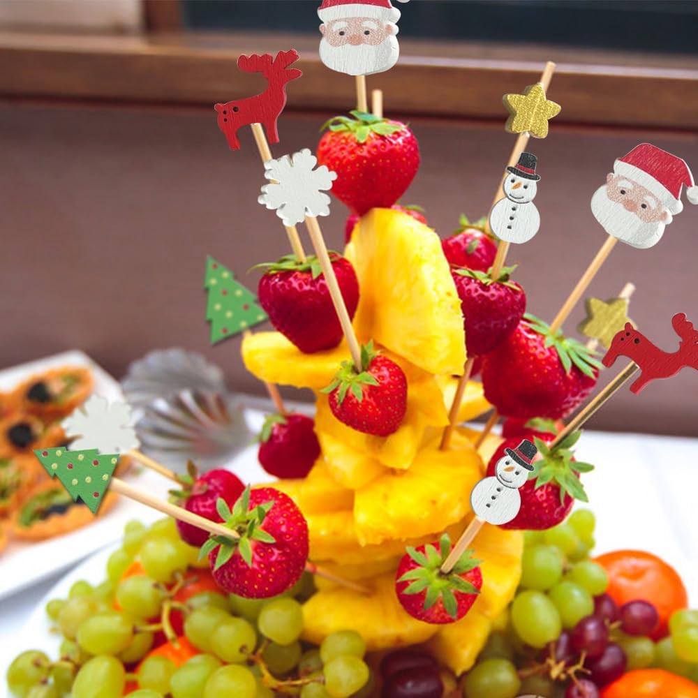 100 Pcs Christmas Cocktail Picks Santa Snowman Elk Xmas Tree Bamboo ToothPicks Appetizer Bamboo Toothpicks for Christmas Holiday Home Party Cake Food Decoration