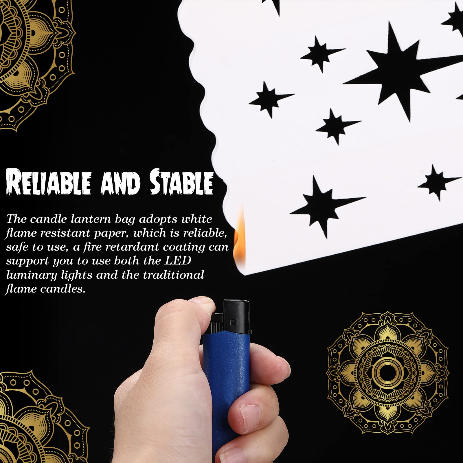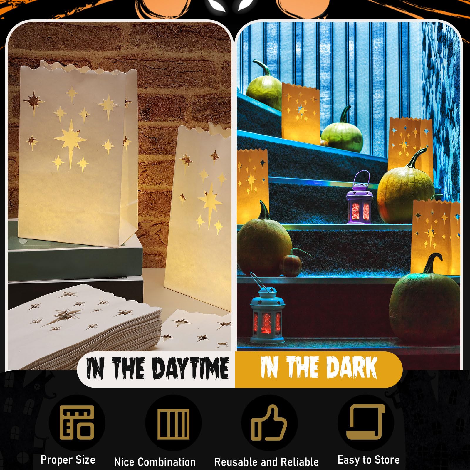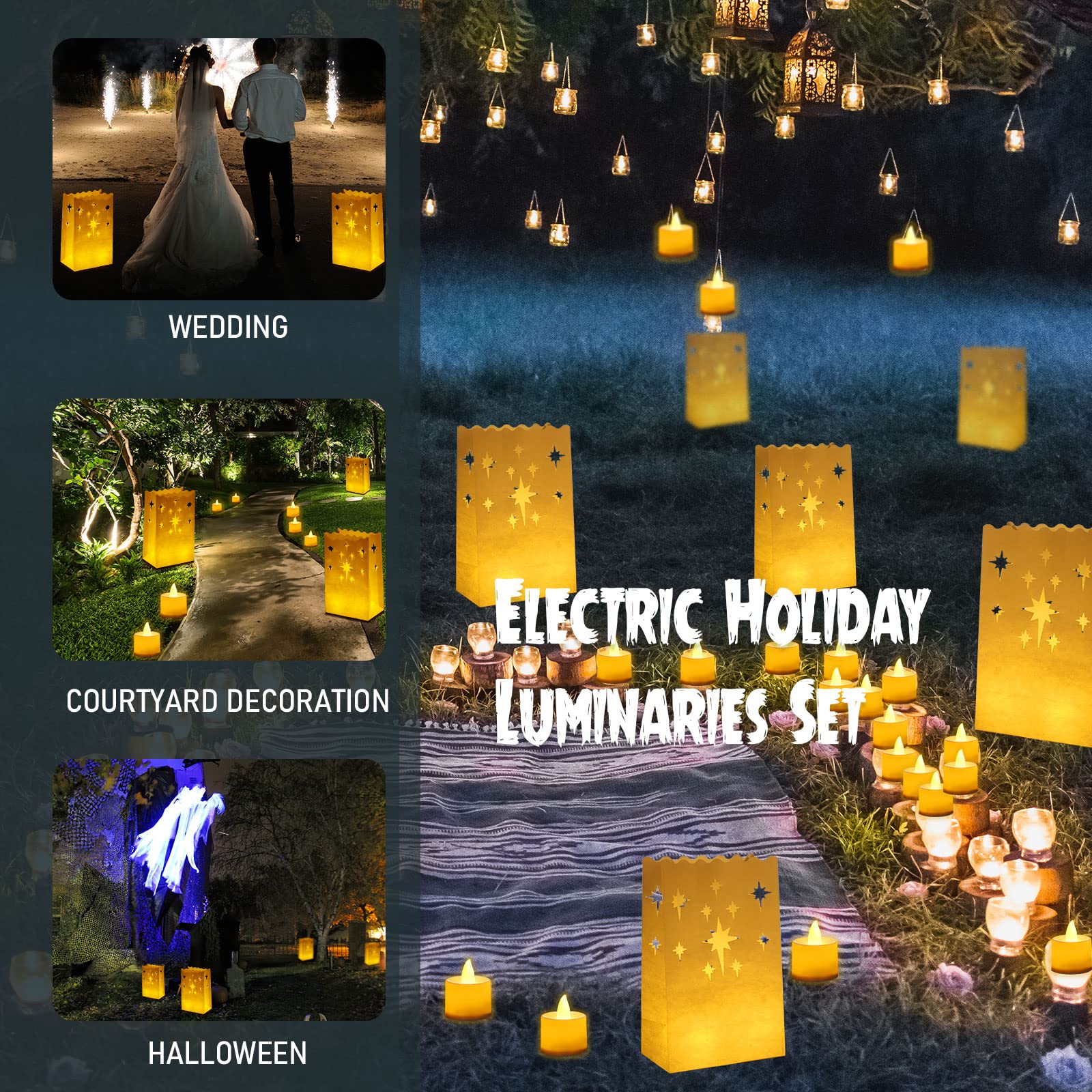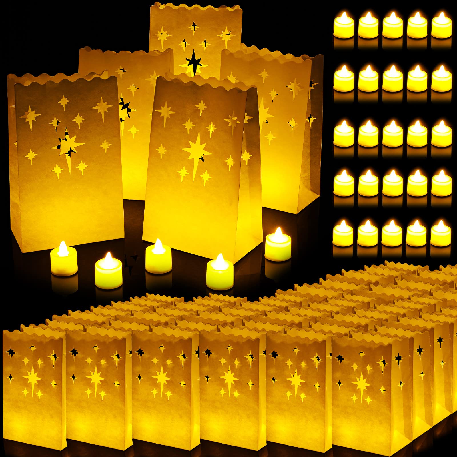 100 Set Luminary Paper Bags with Flameless Tea Lights Christmas Flameless Candle with Luminaries Candle Bag LED Tea Light for Birthday Wedding Halloween Christmas Thanksgiving Party Decor (Firework)