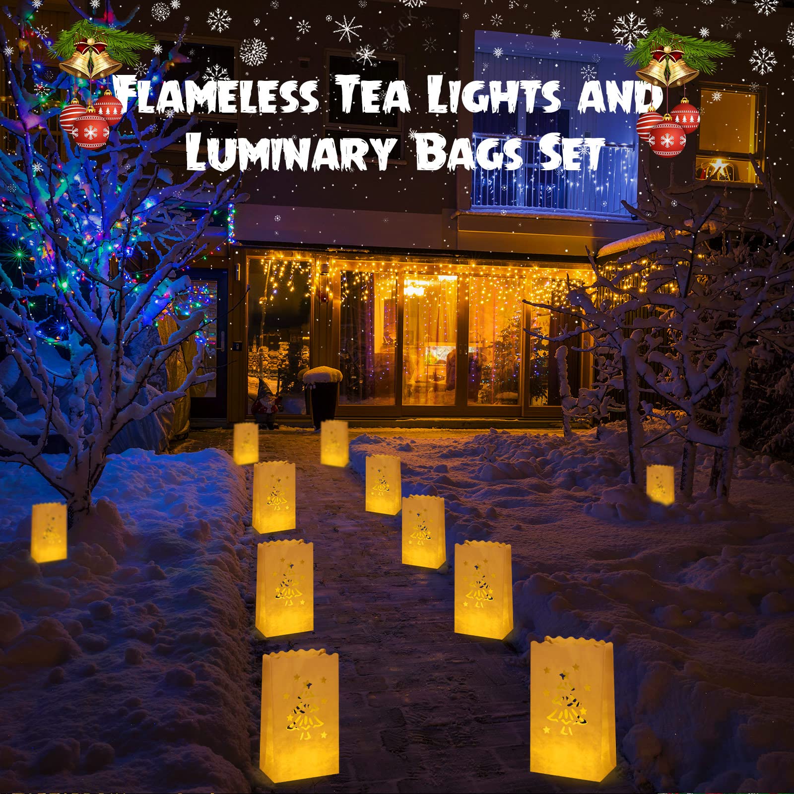 100 Set Luminary Paper Bags with Flameless Tea Lights Christmas Flameless Candle with Luminaries Candle Bag LED Tea Light for Birthday Wedding Halloween Christmas Thanksgiving Party Decor (Tree)