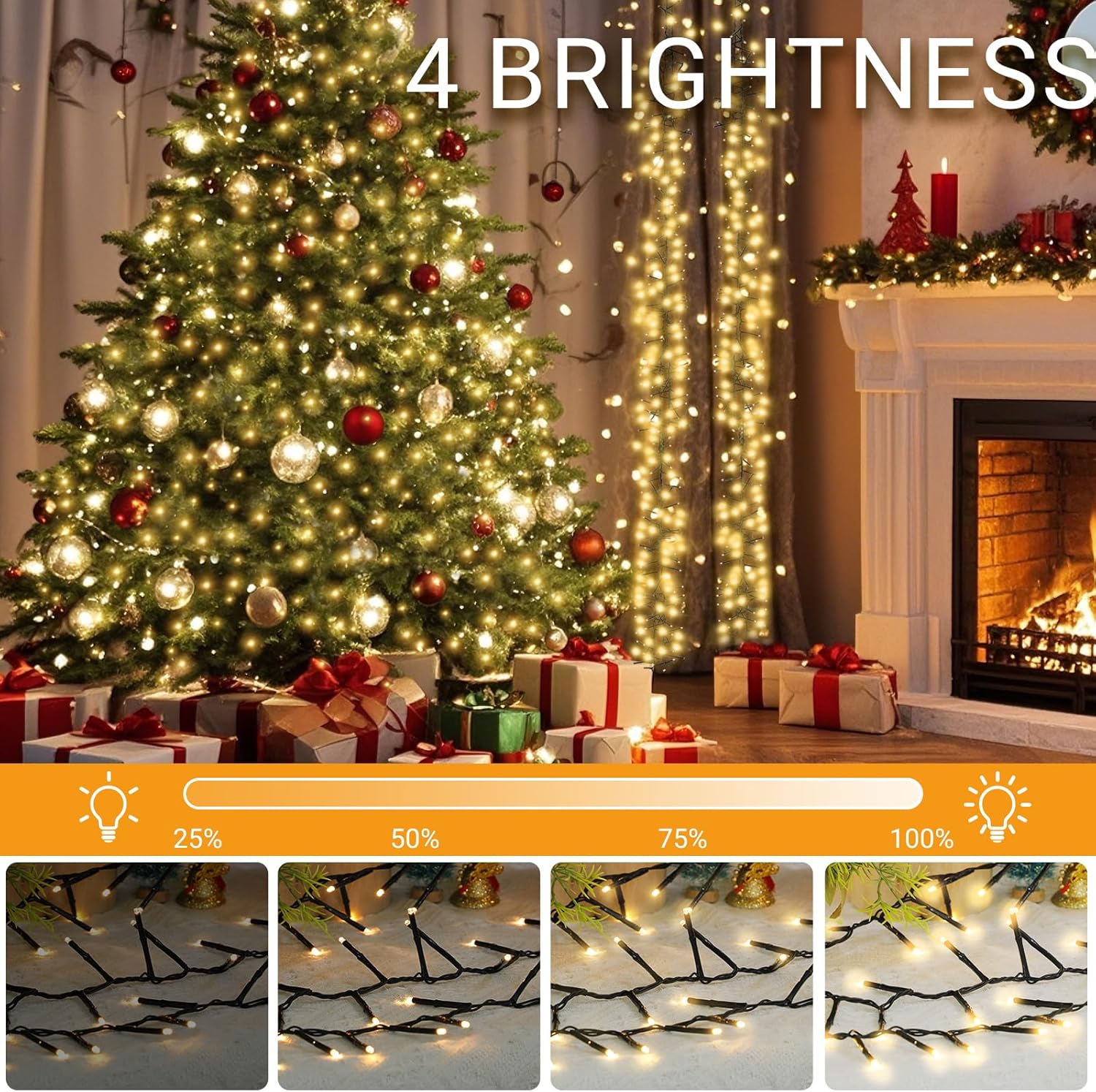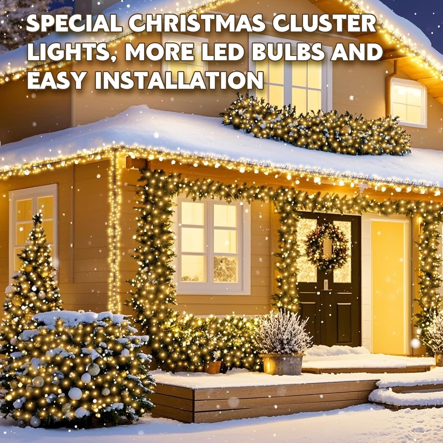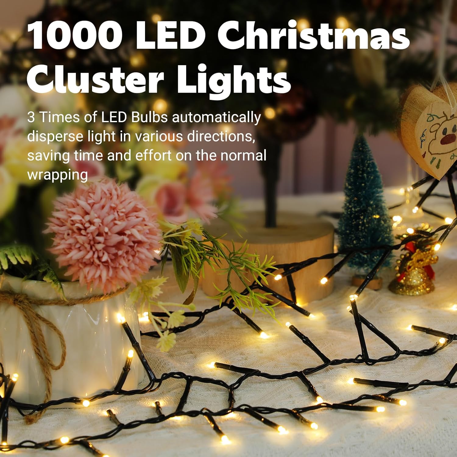 [ High Brightness Cluster Christmas Light ] - Total 116.5 ft (100ft light string & 16.5ft lead wire; NOT-Connectable), Our 100ft Christmas cluster tree lights feature 1000 LED bulbs. This Firecracker string lights deliver ample lighting, and add stunning lighting effect to Christmas tree, wreaths, garlands, trees, mantelpieces, bushes, fences, gutters, for Christmas, Halloween, Thanksgiving, New Year[ Easier Installation ] - Our cluster lights feature 3 times as many LED bulbs as traditional Christmas string lights of the same length. With 1000 longer LED bulbs that automatically disperse light in different directions, you will save time and effort on the normal wrapping in and out branch by branch