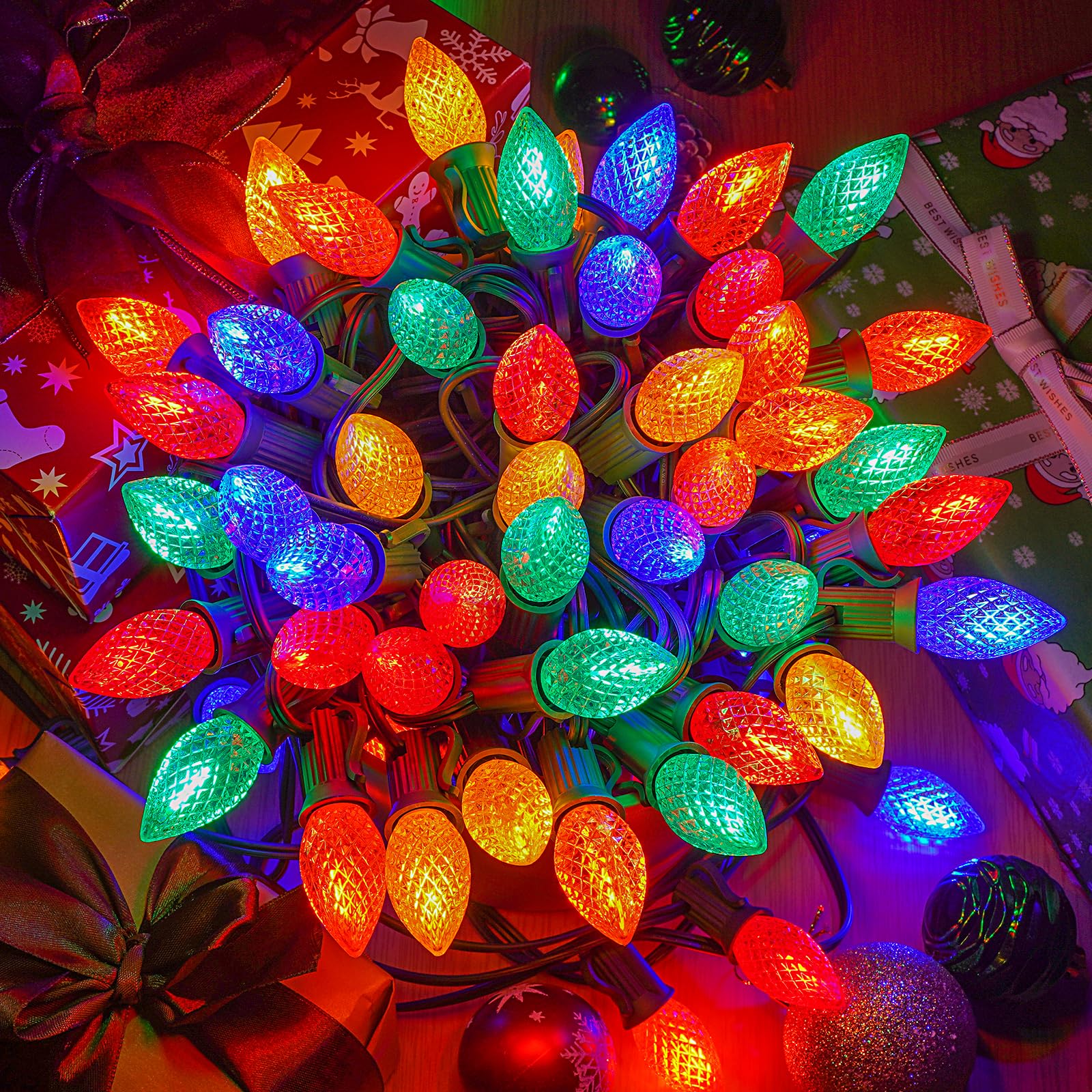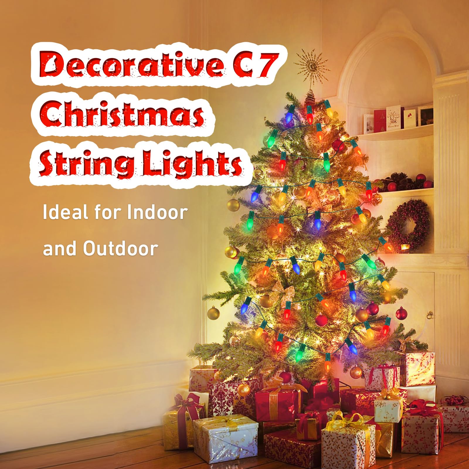 • Connectable Outdoor String Lights: These C7 Christmas hanging lights support end to end connection up to 6 packs, you can link multiple sets to achieve a perfect length for any installation. Indoor Christmas lights 100ft with 66 sockets, included 1 spare bulbs. Each bulb works individually, if one broken or removed the rest will keep staying on