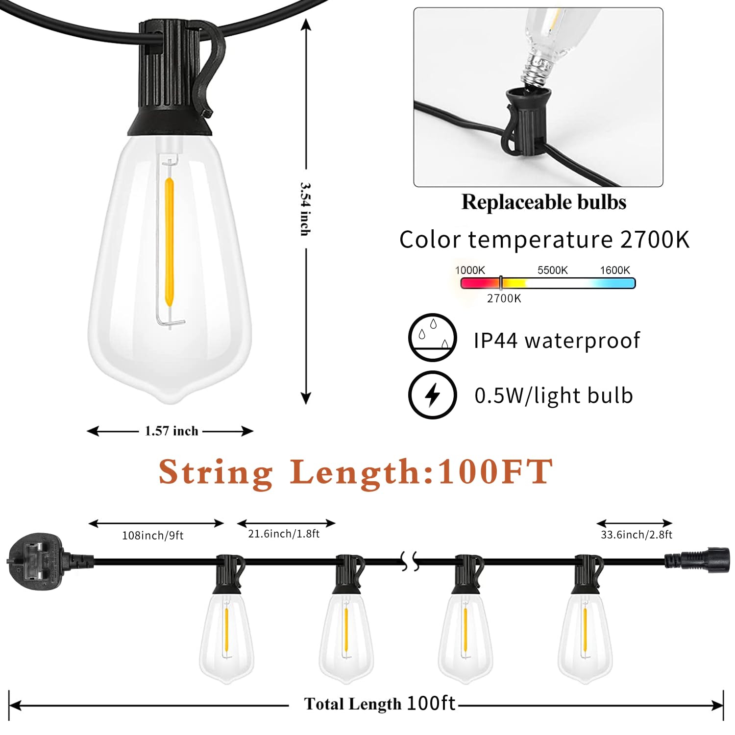 【Higher Quality and Lower Costs】100ft long-lasting outdoor string lights are equipped with our heavy-duty wires and 52 shatterproof bulbs, which can be connected up to 15 strands easily. You can place them anywhere without worrying about frequent replacements. With a lifespan of over 30,000 hours, energy-saving string lights not only provide brighter lighting but also save 90% on electricity bills compared to incandescent lights. 【Weatherproof and Safer】With our weatherproof technology, durable outdoor string lights can withstand rain, wind, snow, and extreme temperatures up to 158 degrees Fahrenheit, letting you feel confident leaving them outdoors year-round. In addition, the bulb shell is made of hard anti-fall plastic, protecting you and your family when hanging waterproof backyard string lights, no longer worry about sudden broken glass shards.