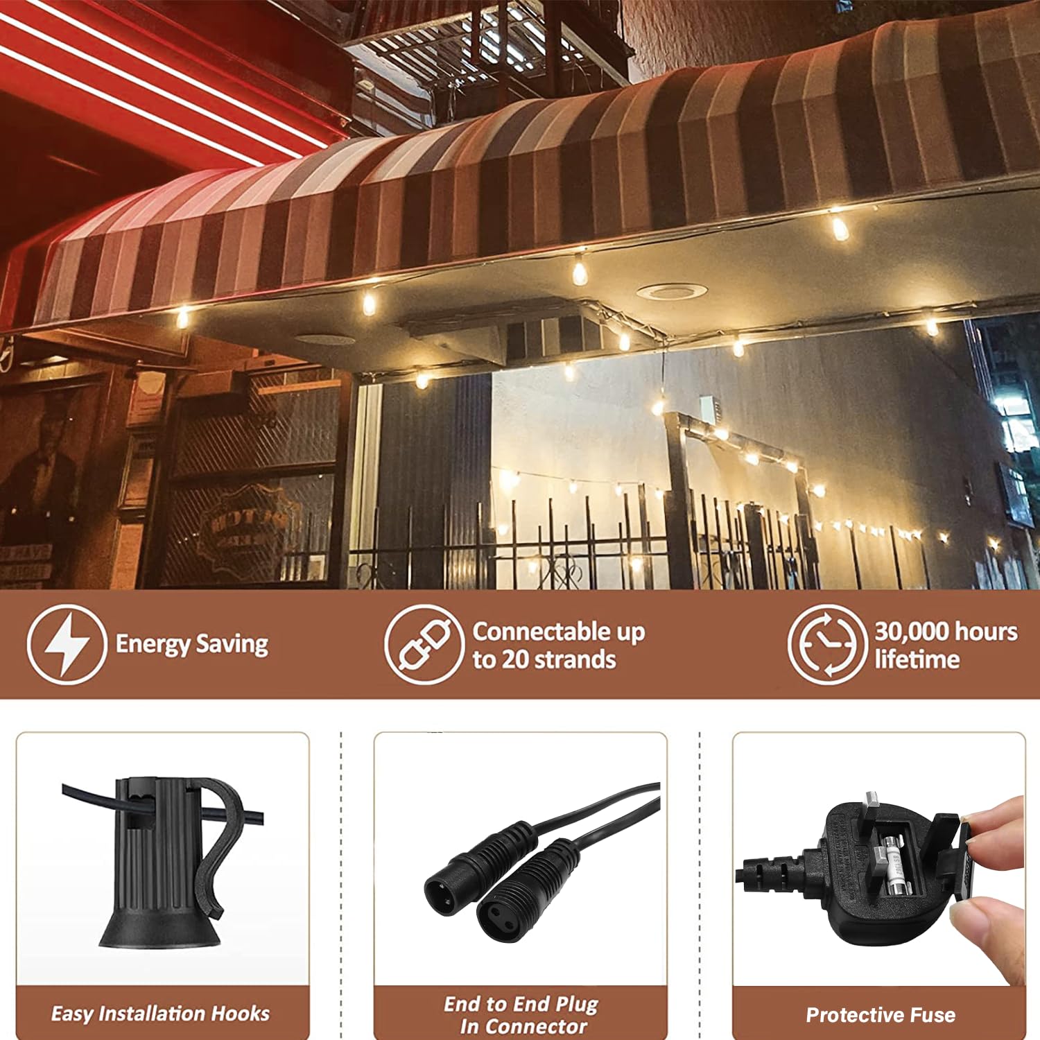 • 【Super Convenient and Widely used】Built-in hooks make hanging LED string lights a breeze, and we've even improved the hooks, sockets, and cords so you can use our string lights without having to deal with sudden breakage. These easy to use party outdoor string lights are a great decoration for your garden, bistro, balcony, patio, pergola, pavilion, tent, pool umbrella, cafe, bedroom, living room, market, wedding, birthday, Christmas party or other scenes.