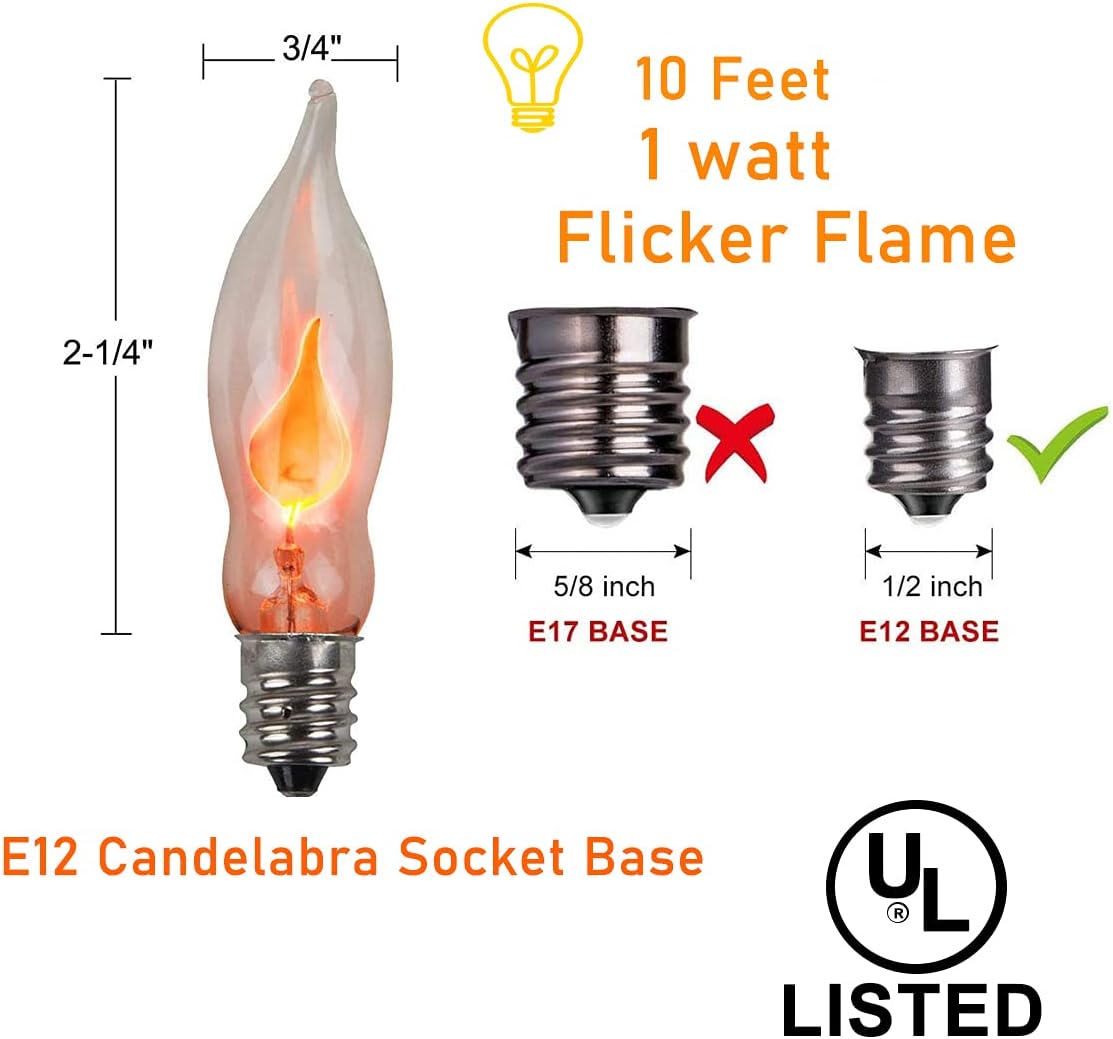 Each 10 string of lights has an end-to-end connection in parallel, connect up to 43 strands to cover a large area. (Total length: 10 feet. Bulb spacing: 1-inch. Voltage: 120 volts. Wattage: 1w, 10w/set) E12 candlestick base, 10ft, 10 flame glass bulbs, realistic flickering flame. Nickel base for extra protection from outdoor weather corrosion