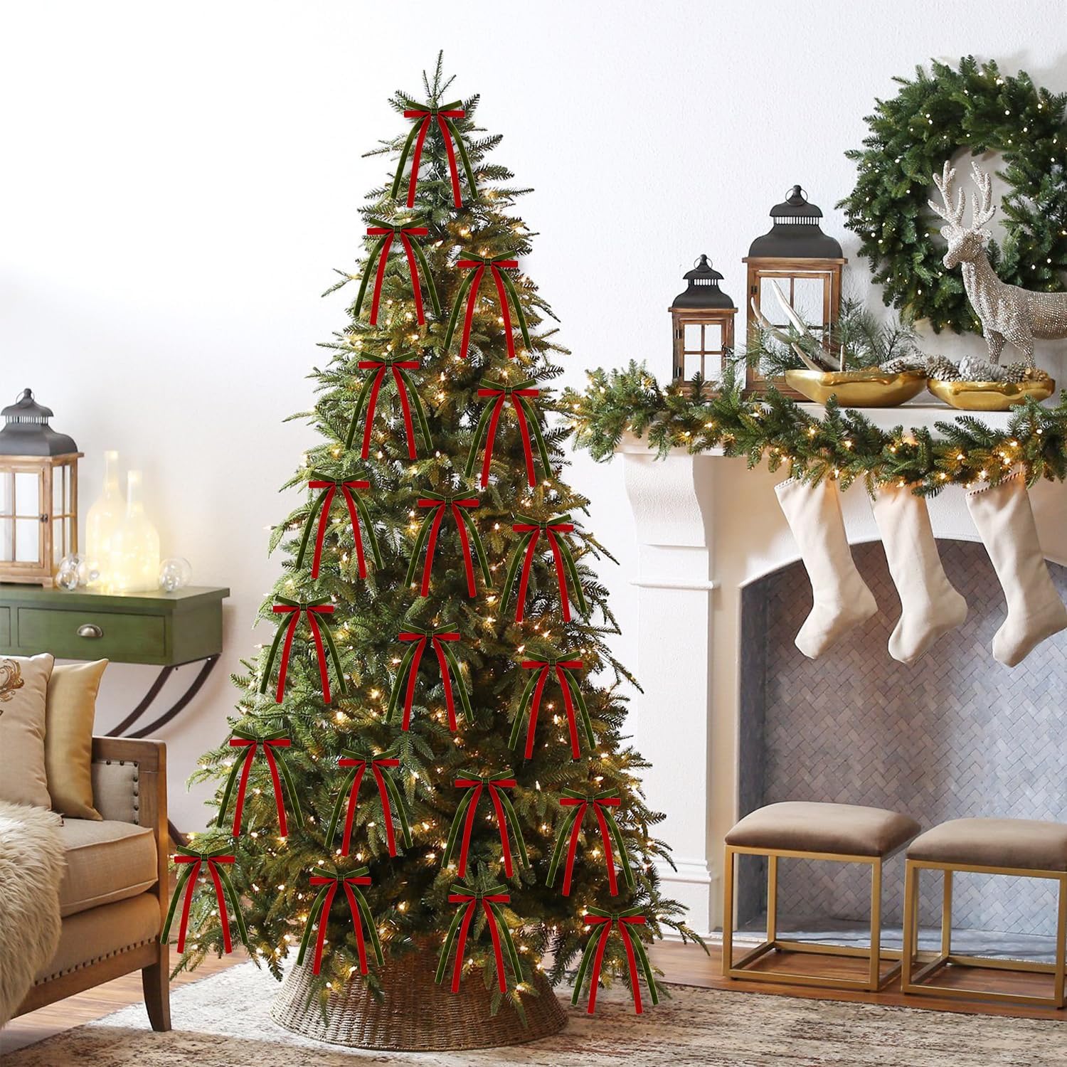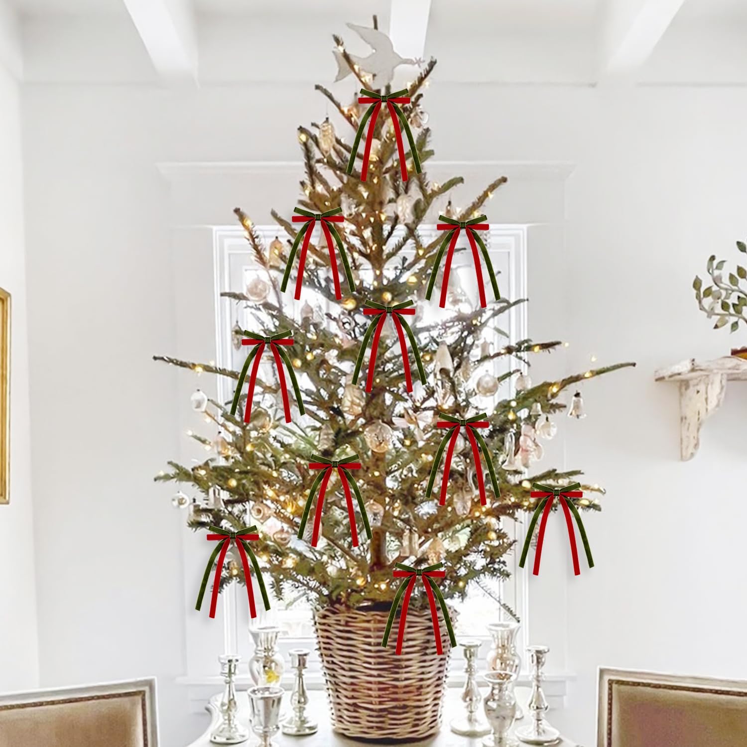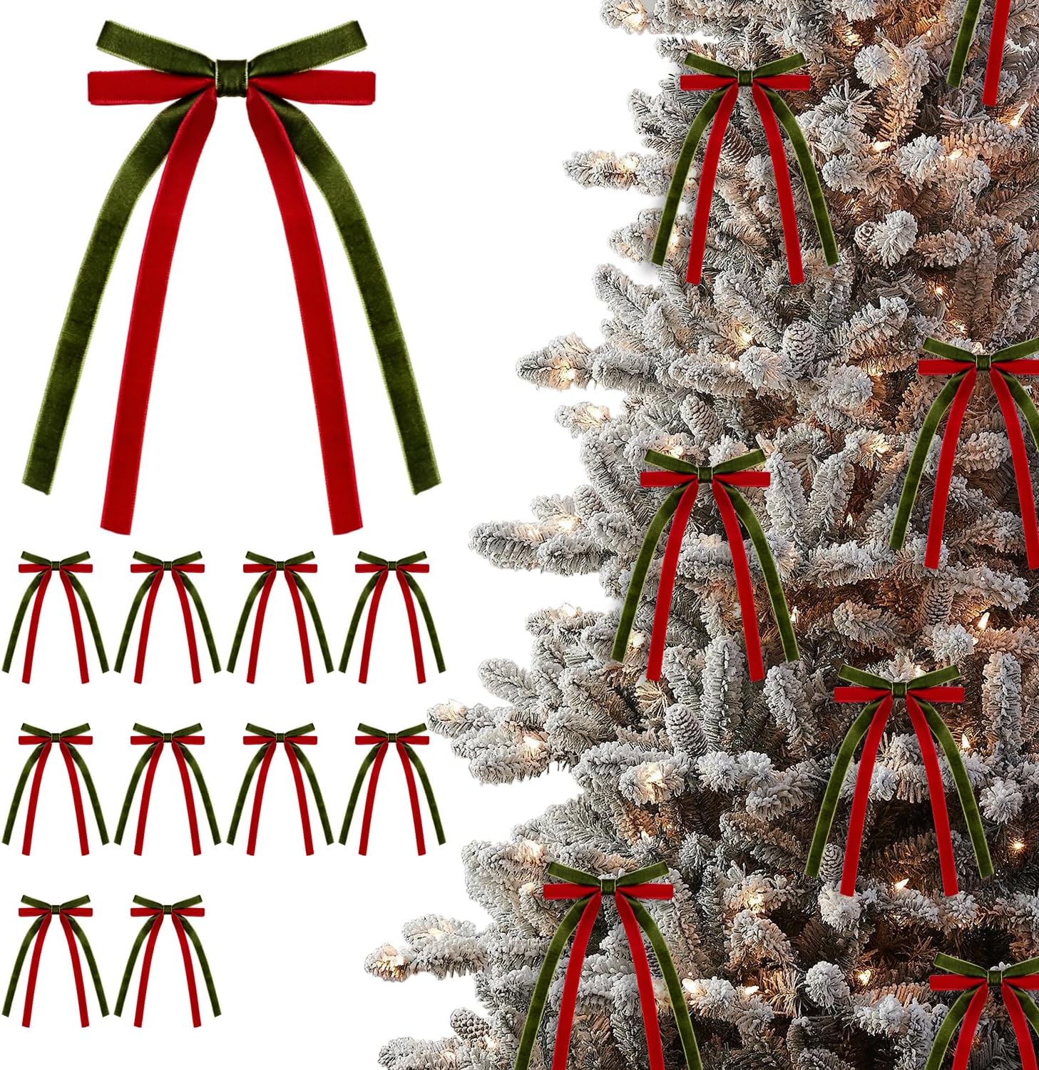 10Pcs Christmas Bows Decorations,5.9x4'' Two Tone Velvet Bow Christmas Wreath Bow for Christmas Tree Wreath Garland Wrapping Wedding Party Décor (Red Olive Green)