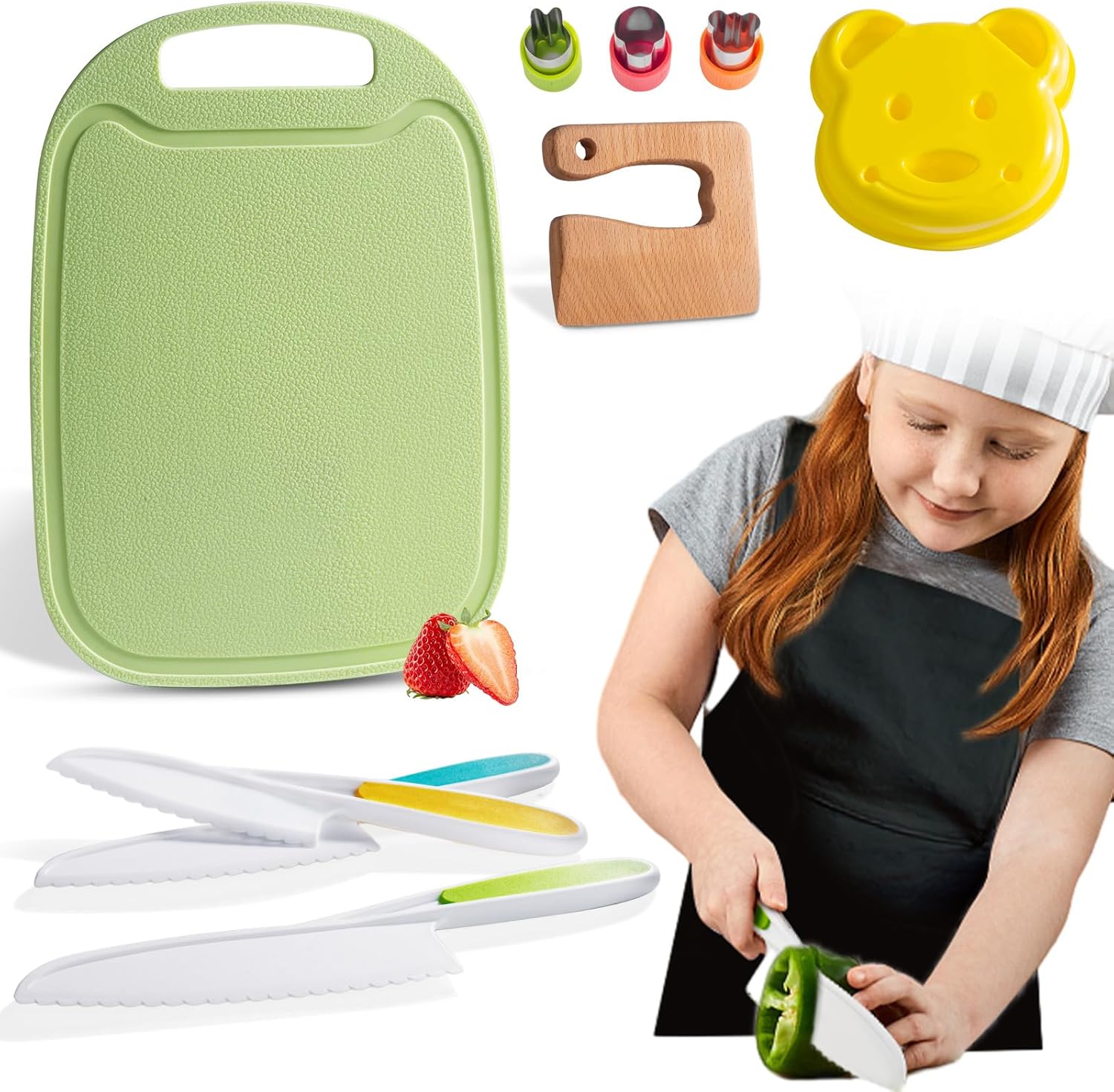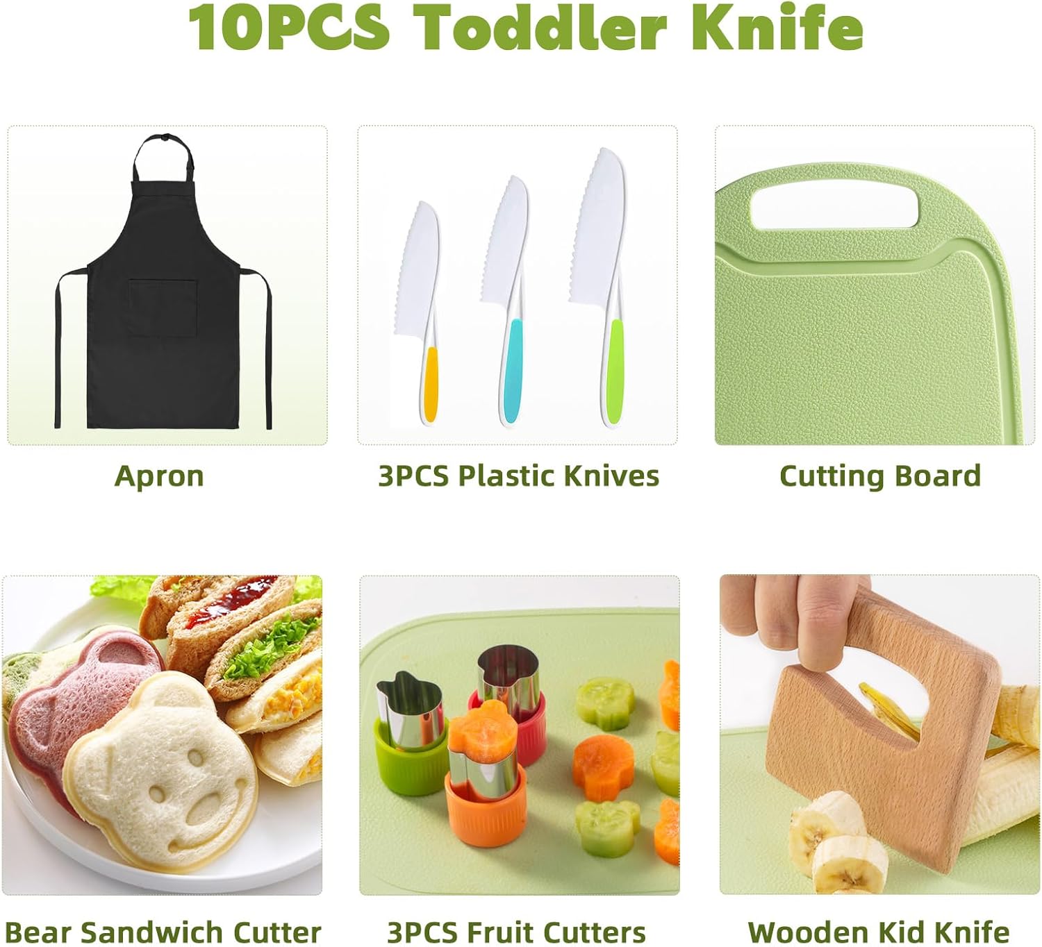 10Piece Toddler Knife Set Kids Safe Knives For Real Cooking, Montessori Kitchen Tools With Cutting Board, Apron, Sandwich Cutter