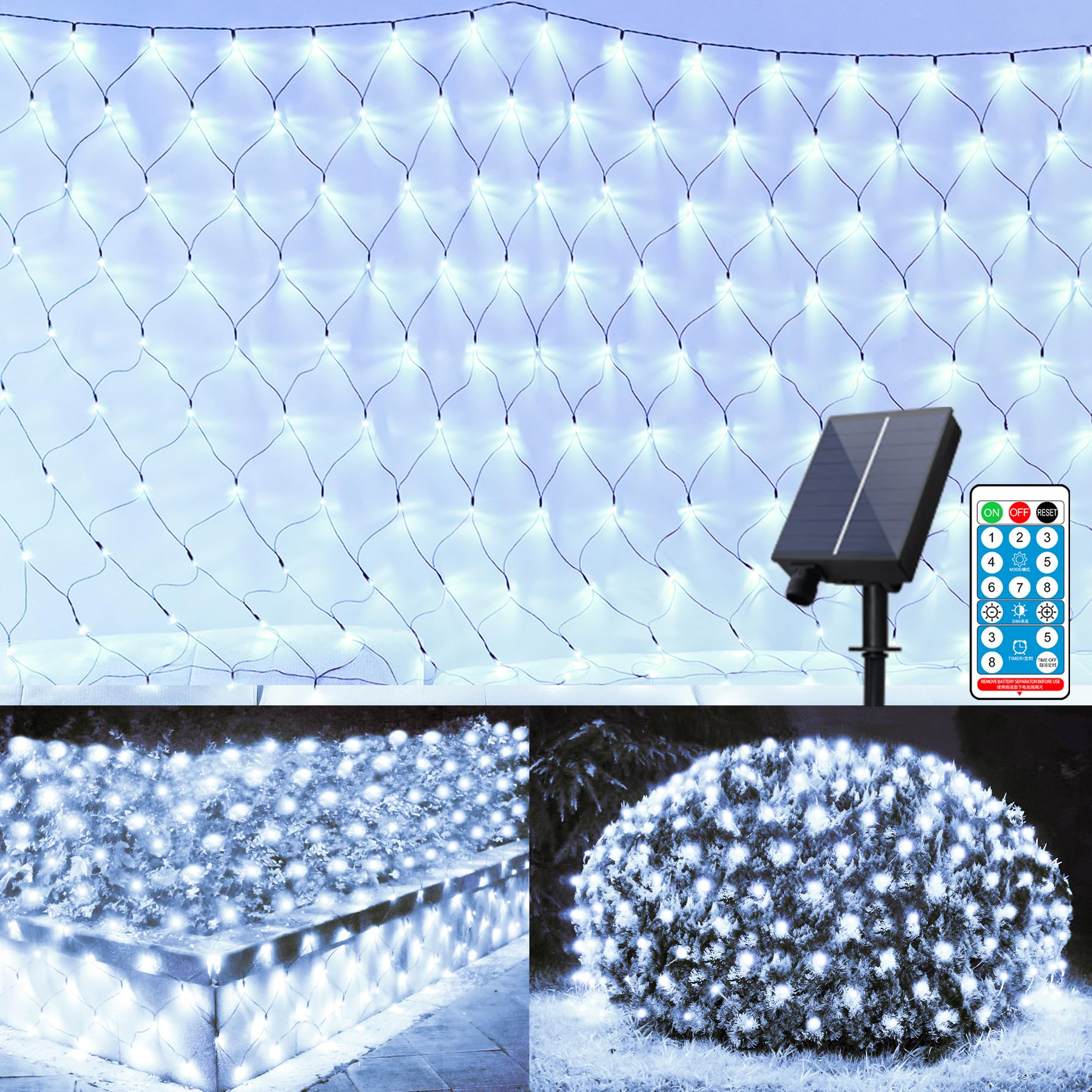 Solar Net Lights: LED net lights is solar powered, energy-efficient, just put the solar panel under the sun, the battery will be charged by direct sunshine. When it is dark, the net lights will automatically light up Waterproof Outdoor Mesh Lights: IP44 waterproof, great for both indoor outdoor decoration. Designed with green wire, it can be well in leaves, bushes or Christmas trees, great for outdoor yard, garden, balcony, outside wall, fence, patio decor