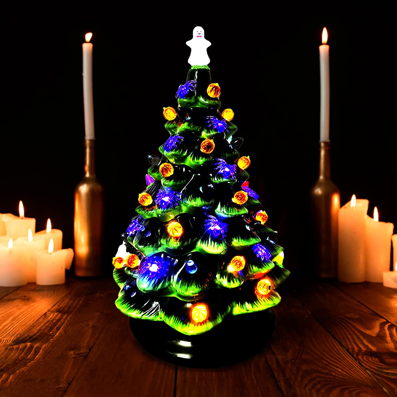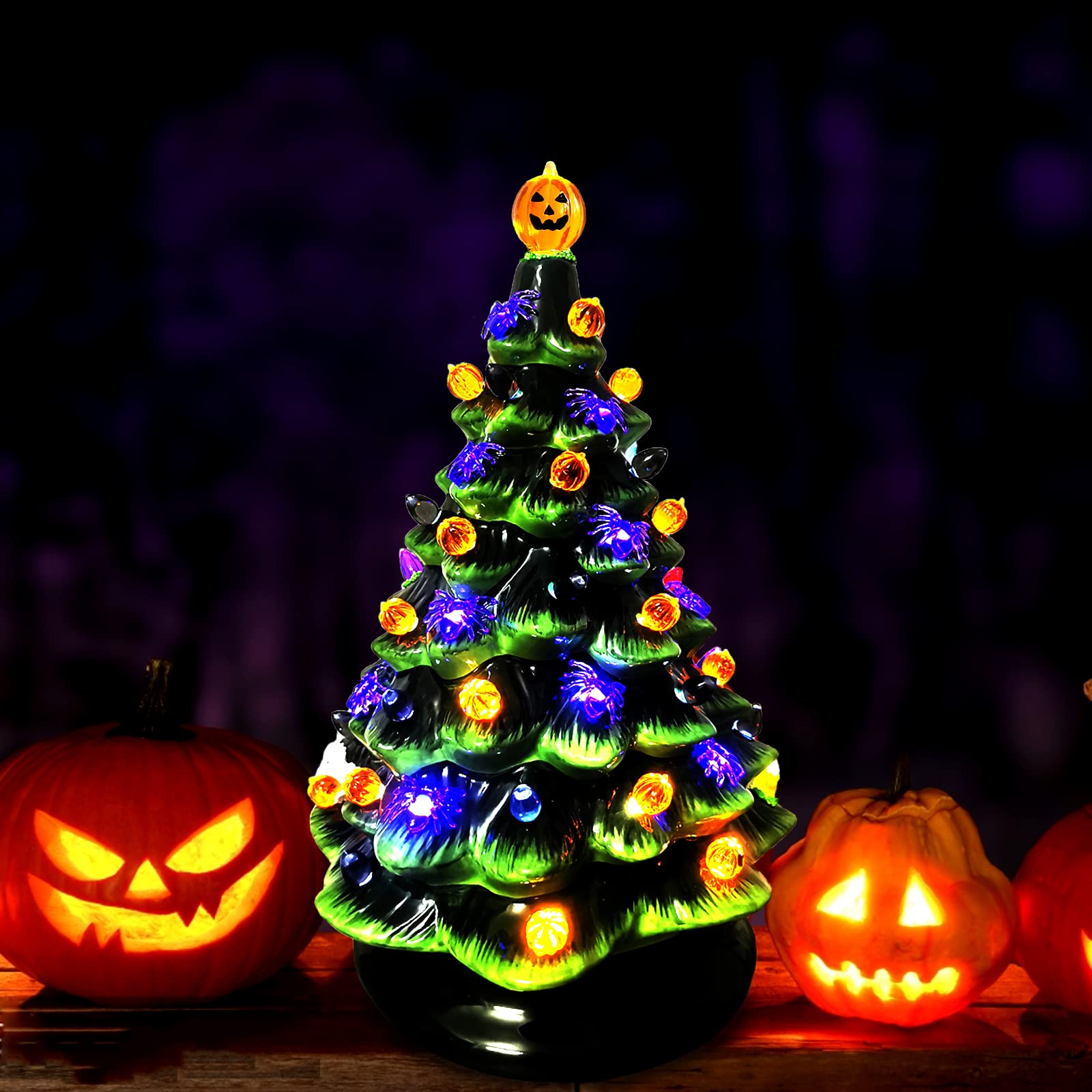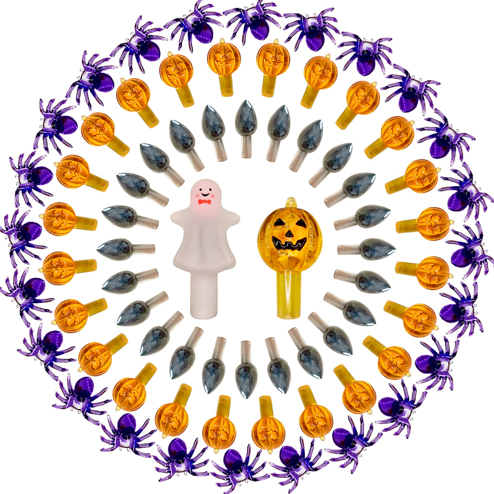 117pcs Halloween Ceramic Tree Replacement Lights Bulbs, Including Spider/Pumpkin Head/Grey Flame & 2pcs Themed Tree Tops (Including Ghost/Pumpkin King) for Decorating Holiday Trees, Etc.