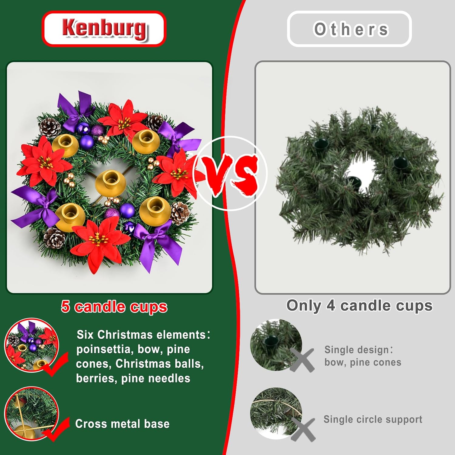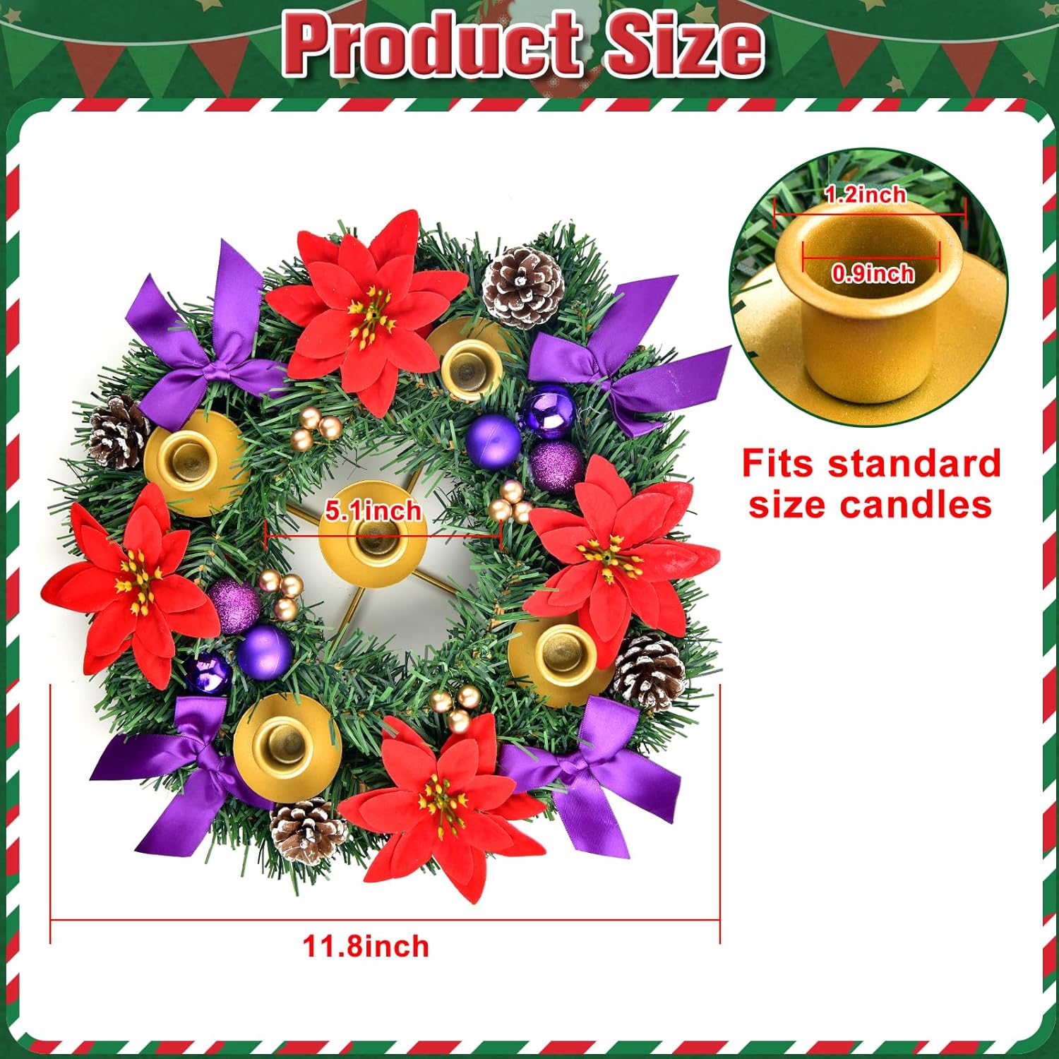 12 Inch Christmas Advent Wreath 5 Candle Holder with Metal Candle Cups for Taper Candles Fire Retardant Centerpiece Decorations for Table Indoor Home Church(No Candles)
