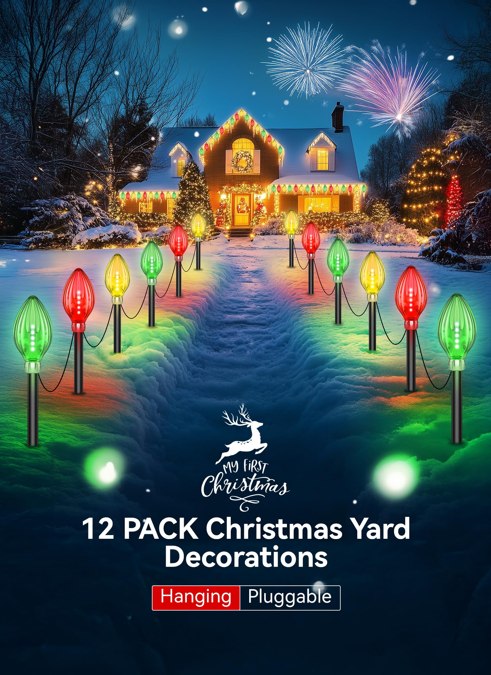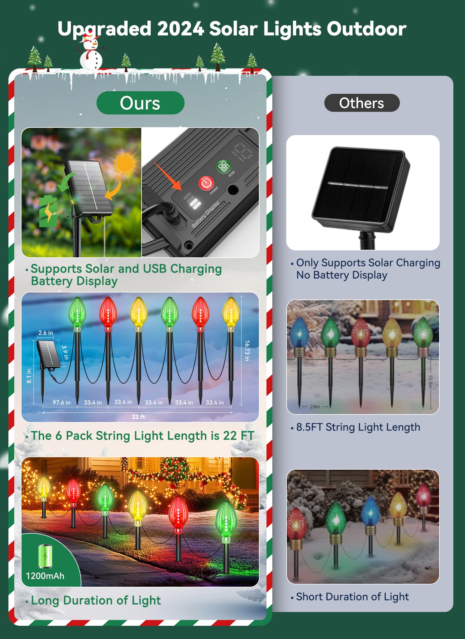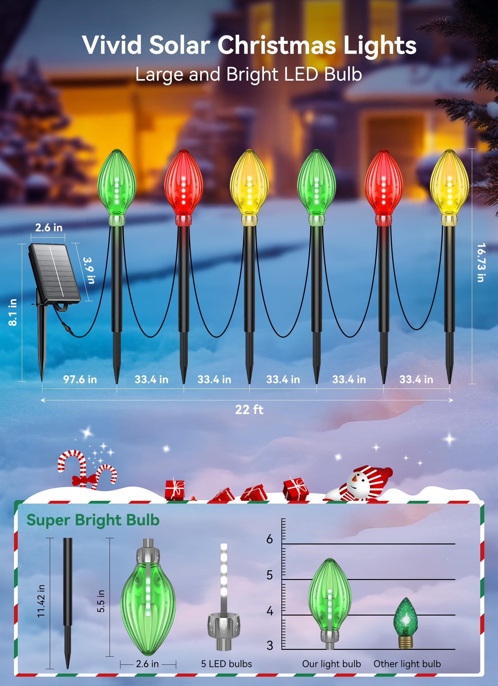 d Outdoor Christmas Lights: The jumbo C9 solar christmas lights outdoor has a total of 12 packs. Each bulb is equipped with 5 mini LEDs, totaling 60 mini LED bulbs across all the sets. These outdoor solar lights three different color: red, yellow and green. The LED bulb size: 5.5 x 2.6 inches, and each bulb is spaced 34 inches apart. The large and bright LED bulb can satisfy your diverse outdoor Christmas decoration effects 2-in-1 Decorative Solar Christmas Lights: The total length of the 12 packs of solar string lights is 44FT, and the Christmas lights outdoor with stakes are amazing for Christmas outdoor yard decoration. They can be used as a string of lights, or with stakes for outdoor landscape lighting. Our stake length is 11.4 inches, offering a sturdy and easy-to-install solution for Christmas outdoor decoration