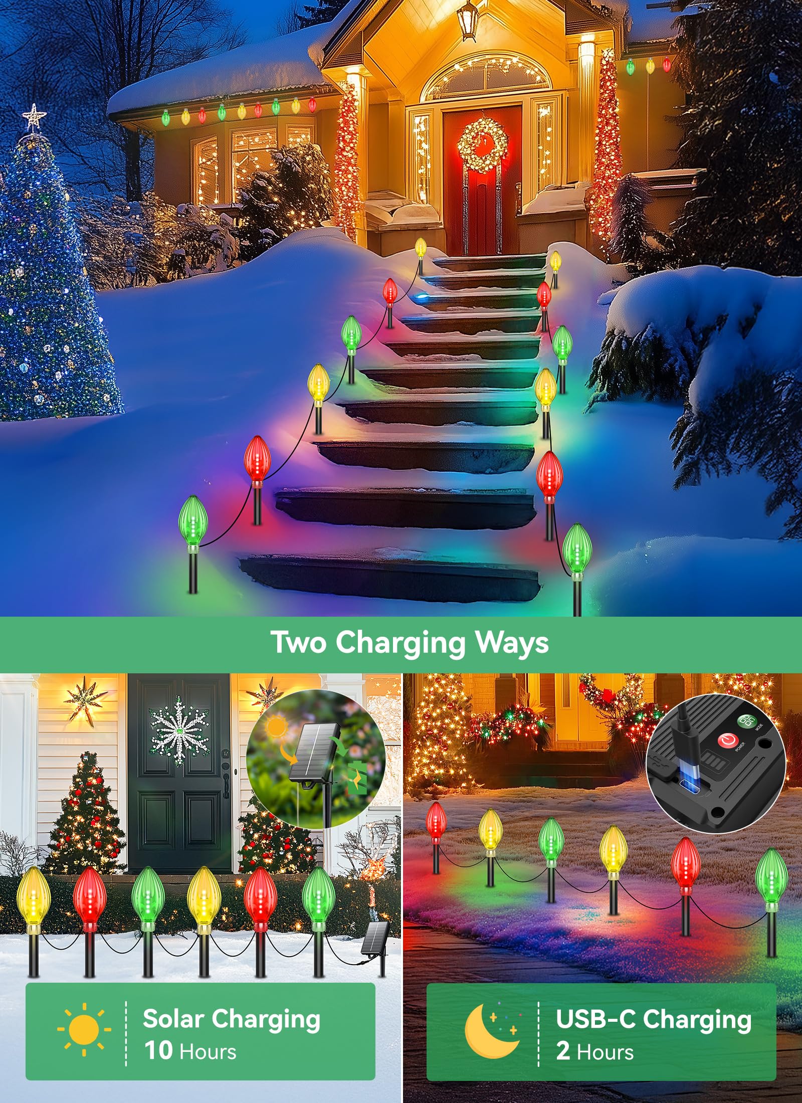 • Two Charging Ways & Auto On/Off: The solar pathway lights features solar charging and USB charging. The bigger outdoor solar panel automatically charges during the day and lights up at night. Once fully charged, the Christmas pathway lights outdoor is designed to operate for 10-12 hours. On cloudy or rainy days, you can use the USB cable to charge for 2 hours indoor, which is enough for lighting all night