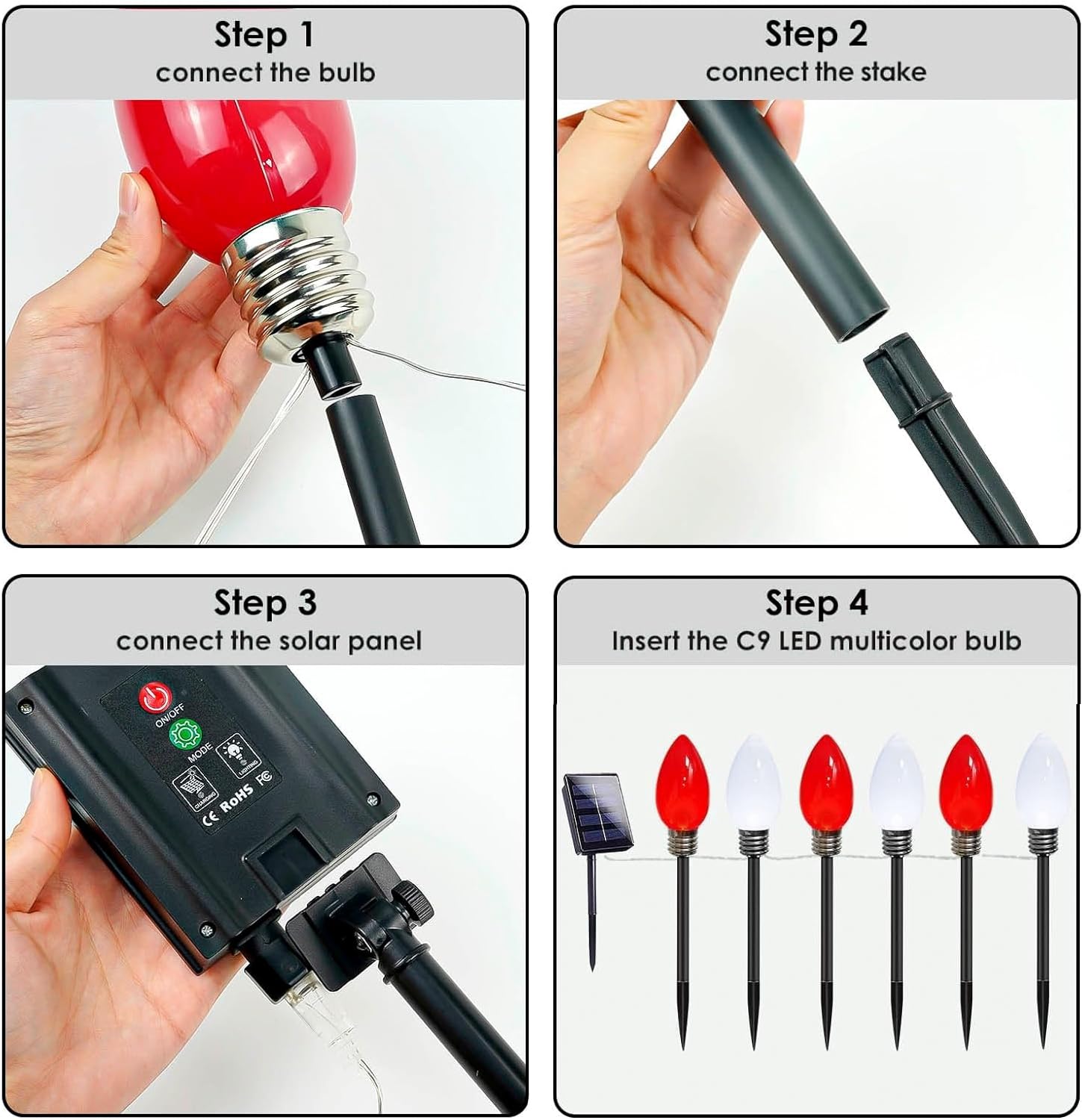 12-Pack Jumbo C9 Red White Solar Christmas Lights, d 12LED Outdoor Christmas Decorations, Solar Powered Lights Waterproof for Outside Xmas Path Garden Yard and Patio Decoration (Red and White)