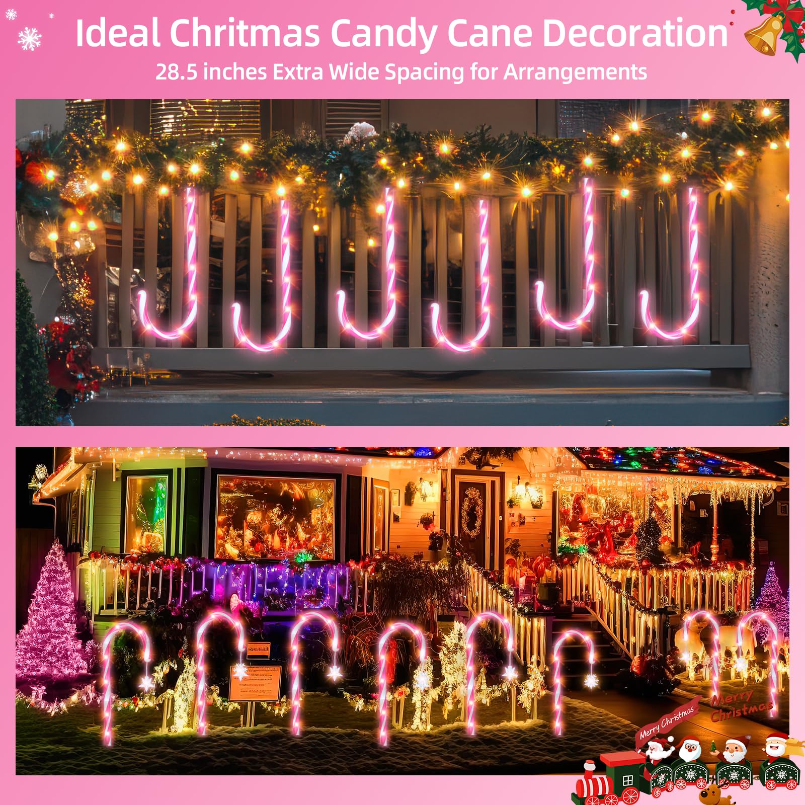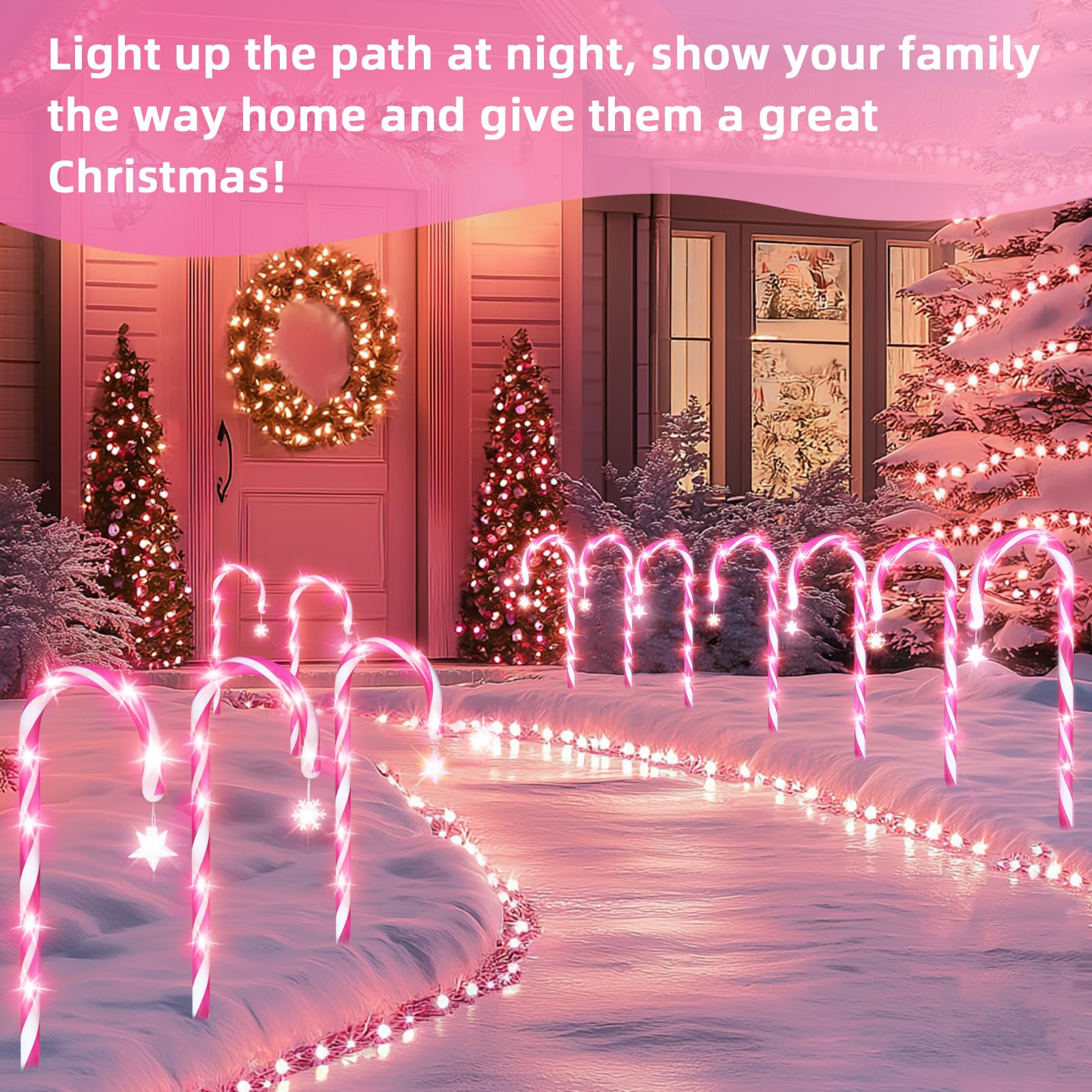 12 Pack Pink Christmas Candy Cane Lights: 21 inch 8 Lighting Modes Lawn Stakes Pathway Light Outdoor - 28 inch Extra Large Pitch, Waterproof for Walkway Markers Yard Xmas Decorations (Pink & White)