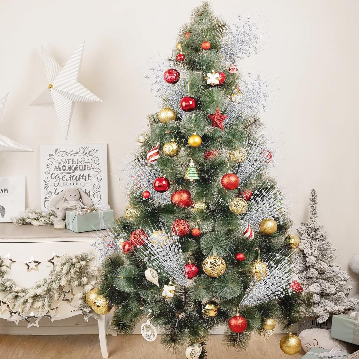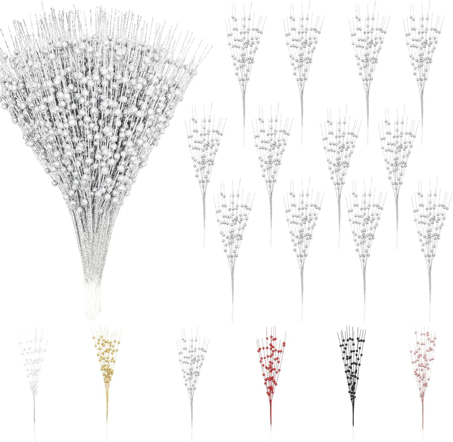 12 Pack Silver Christmas Tree Decorations, 16" Glitter Berry Stems Ornaments, Christmas Picks Sticks for Christmas Tree Topper Filler Vase DIY Home Decor
