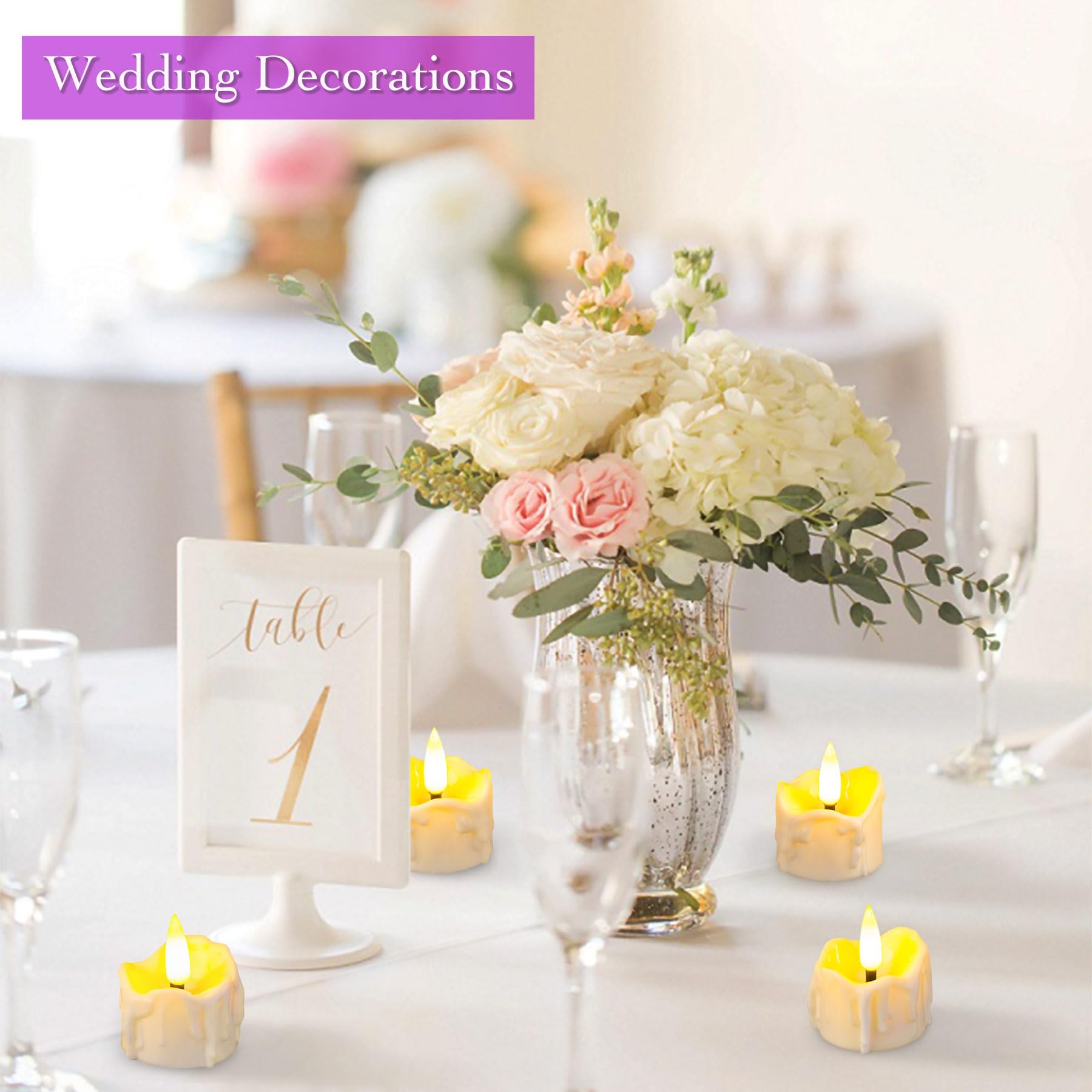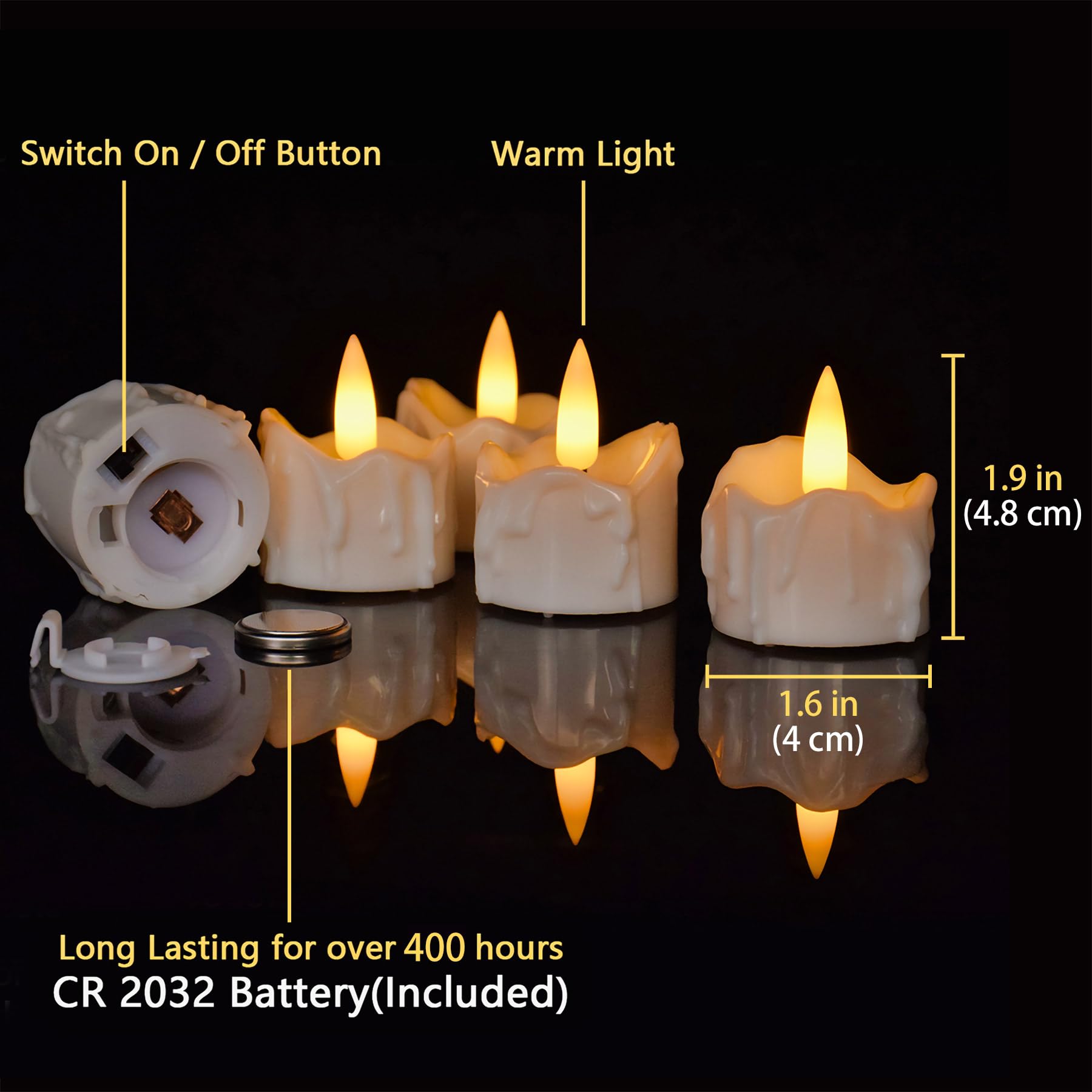 【Lifelike 3d wick flickering tea lights】With realistic 3d black wick flicker flame and simulated dripping wax modeling design, the 12 pack artificial plastic prelit LED timer tealight looks like real candles. Not only is it great for home decor in the yard, and patio, but also anniversary parties, bridal showers, and marriage proposal decorations. 【Convenient automatic timing function】These timed flameless tealight battery operated is very convenient. Easily flip the switch to “ON”, and the electric candle tea lights with timer will light on for 6 hours, then light off for 18 hours automatically, repeating the cycle every 24 hours. It saves you the trouble of turning it on and off every day and saves energy.