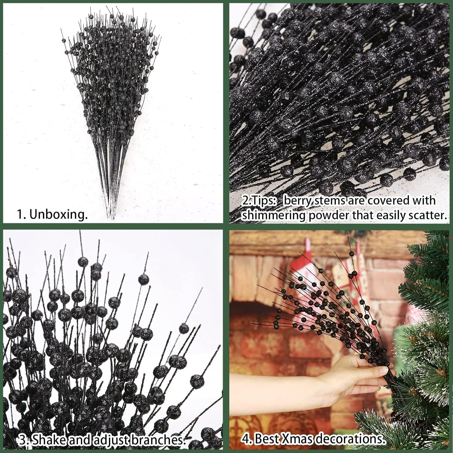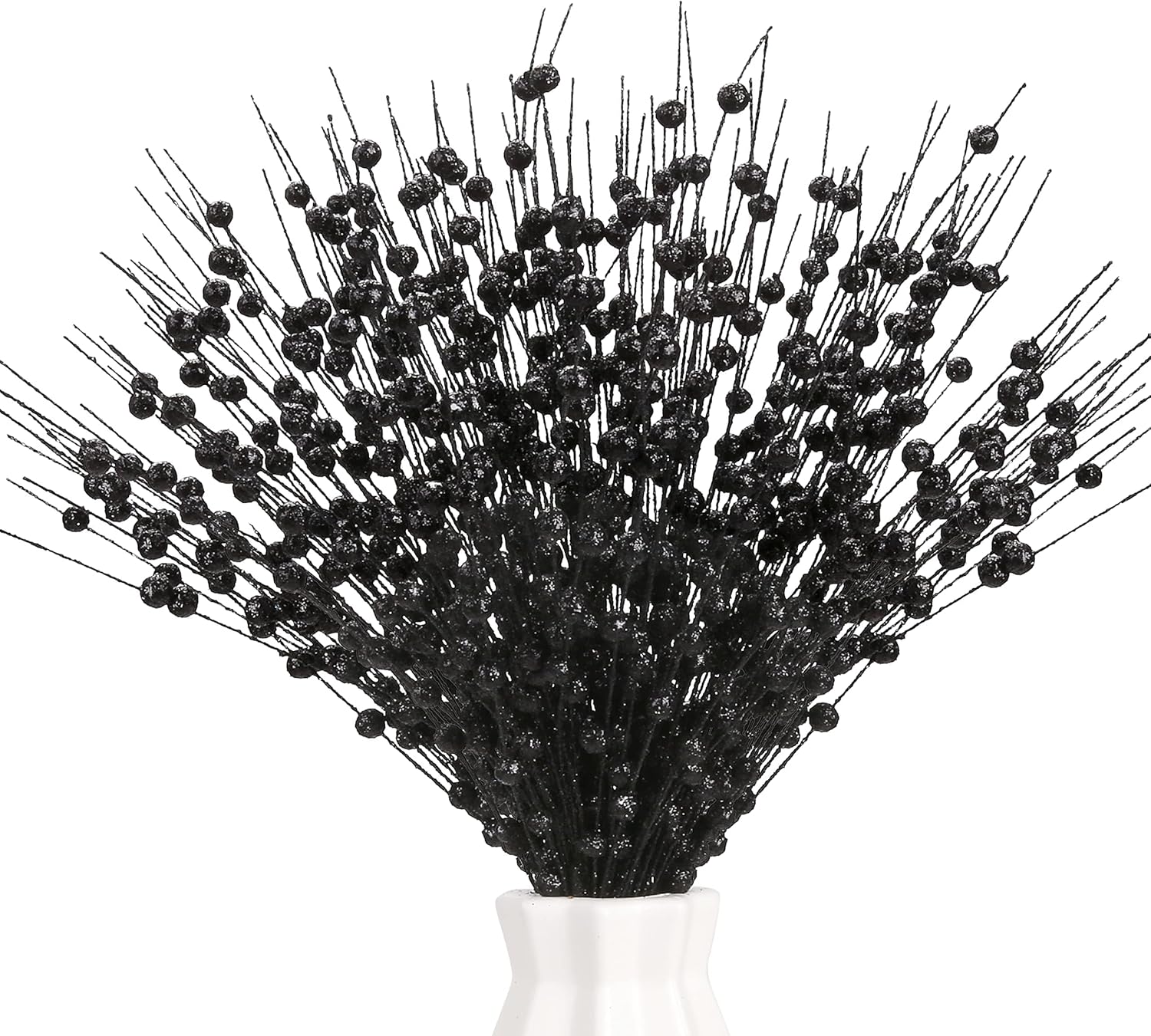 12 PCS Artificial Glitter Berry, Black Christmas Glitter Picks Artificial Berries Stems Ornaments Fake Xmas Stem Decorative Sticks for Vases Tall DIY Wreath Home Decor Halloween Decoration (15.8’’)