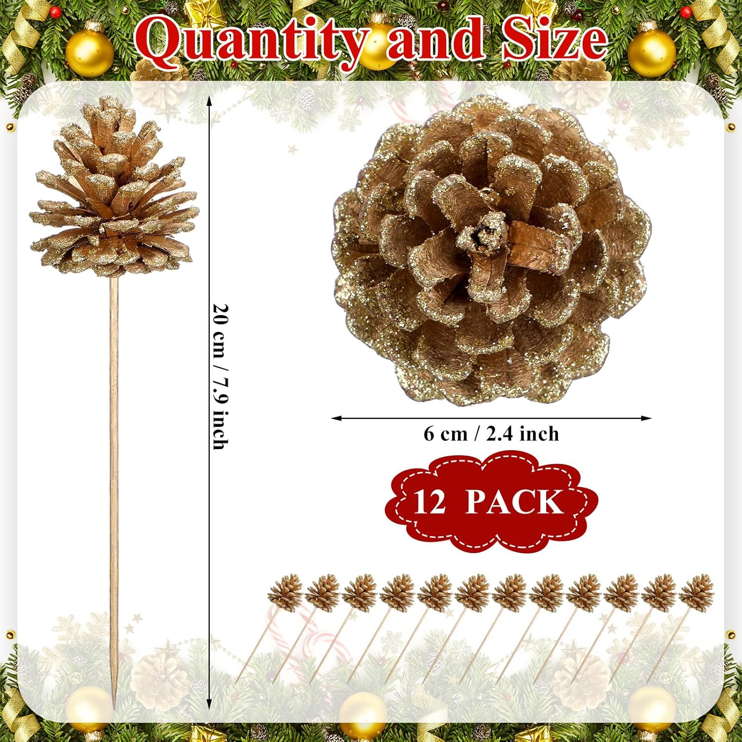 12 Pcs Christmas Pine Cones Picks Gold Glitter 2.4 x 3.15 Inches Pinecone with Wired Pick Artificial Christmas Tree Decorations Ornaments Holiday Centerpiece for Craft Garland Wreath DIY