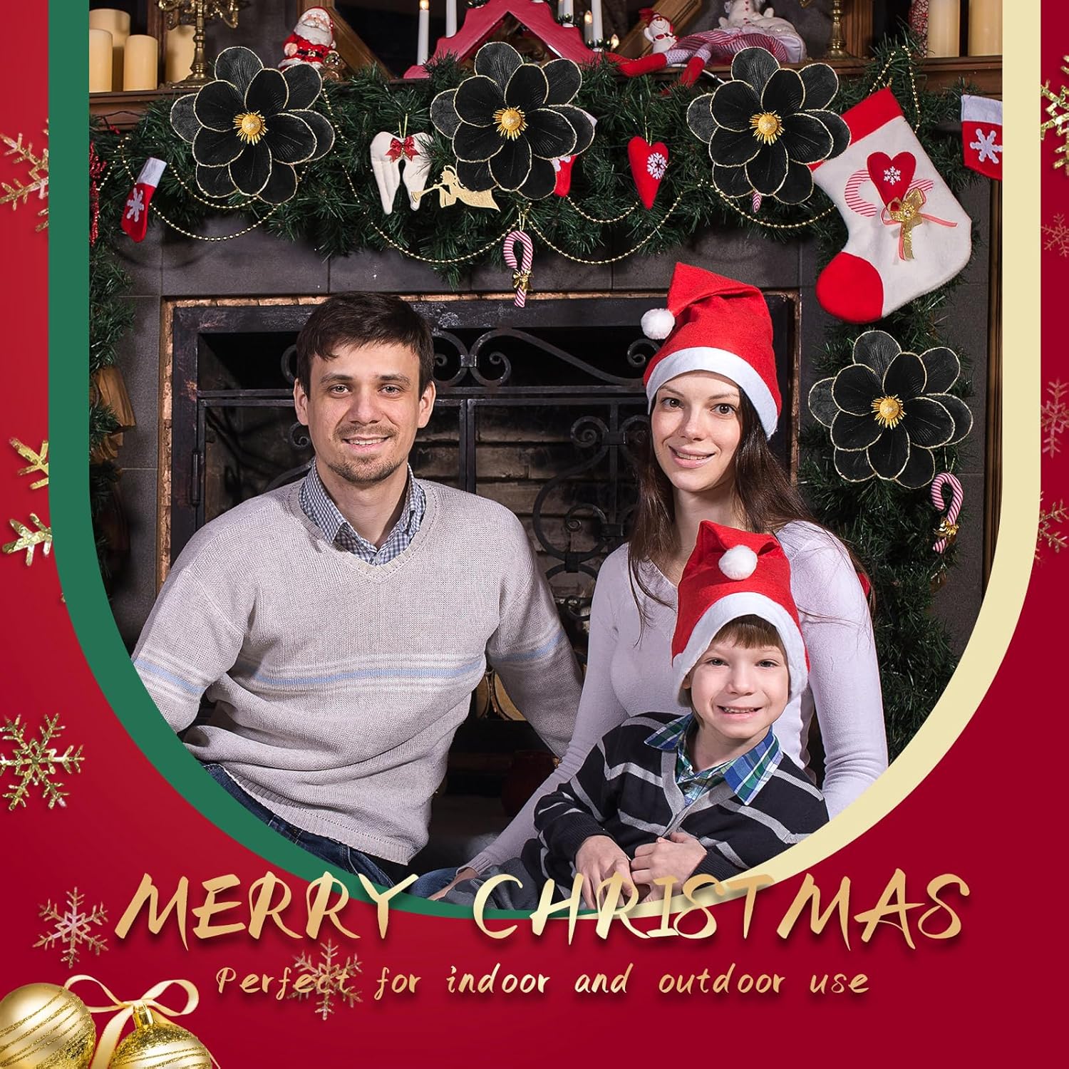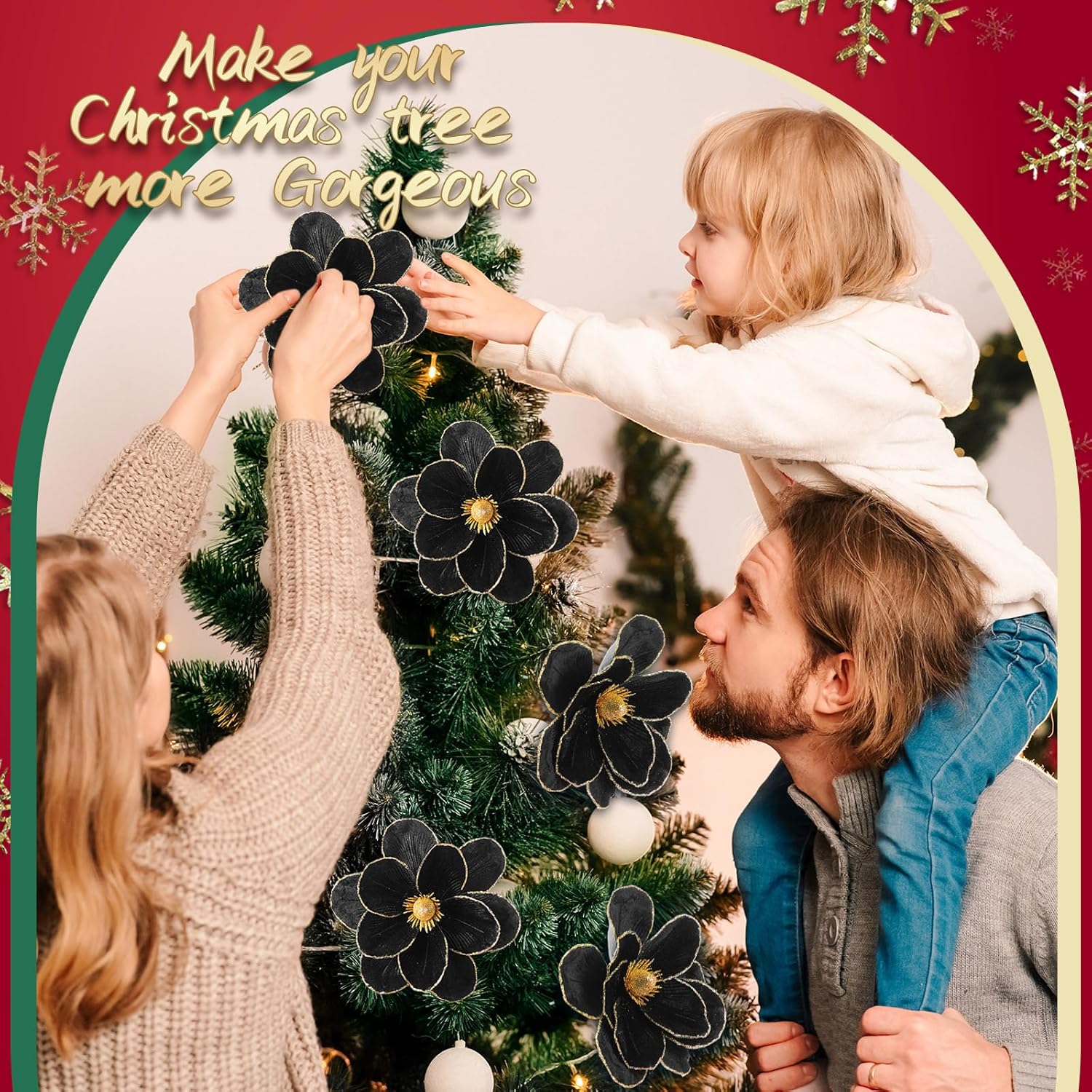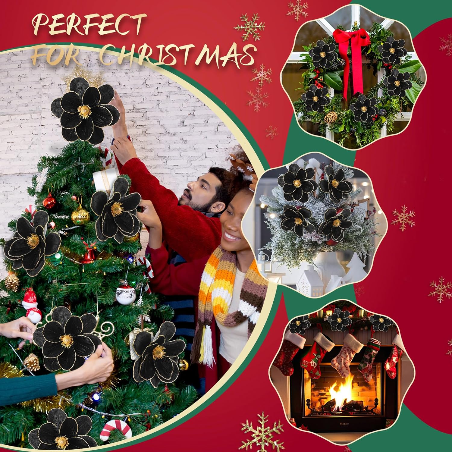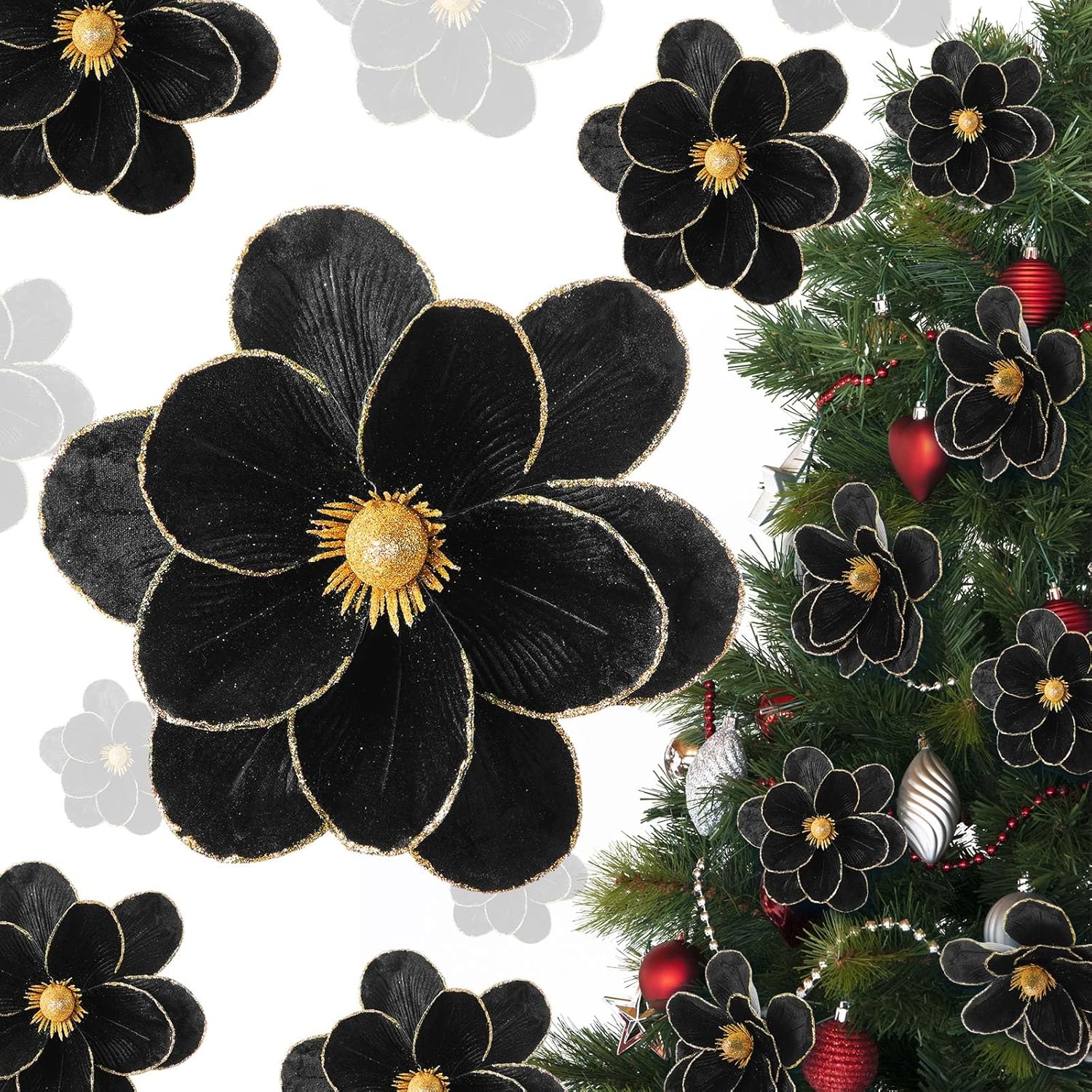 12 Pcs Christmas Velvet Poinsettia Burgundy Magnolia Flowers Ornaments Glitter Large Heads Artificial Magnolia Flowers for Christmas Tree Decorations Wedding Decor Supplies (Black and Gold)