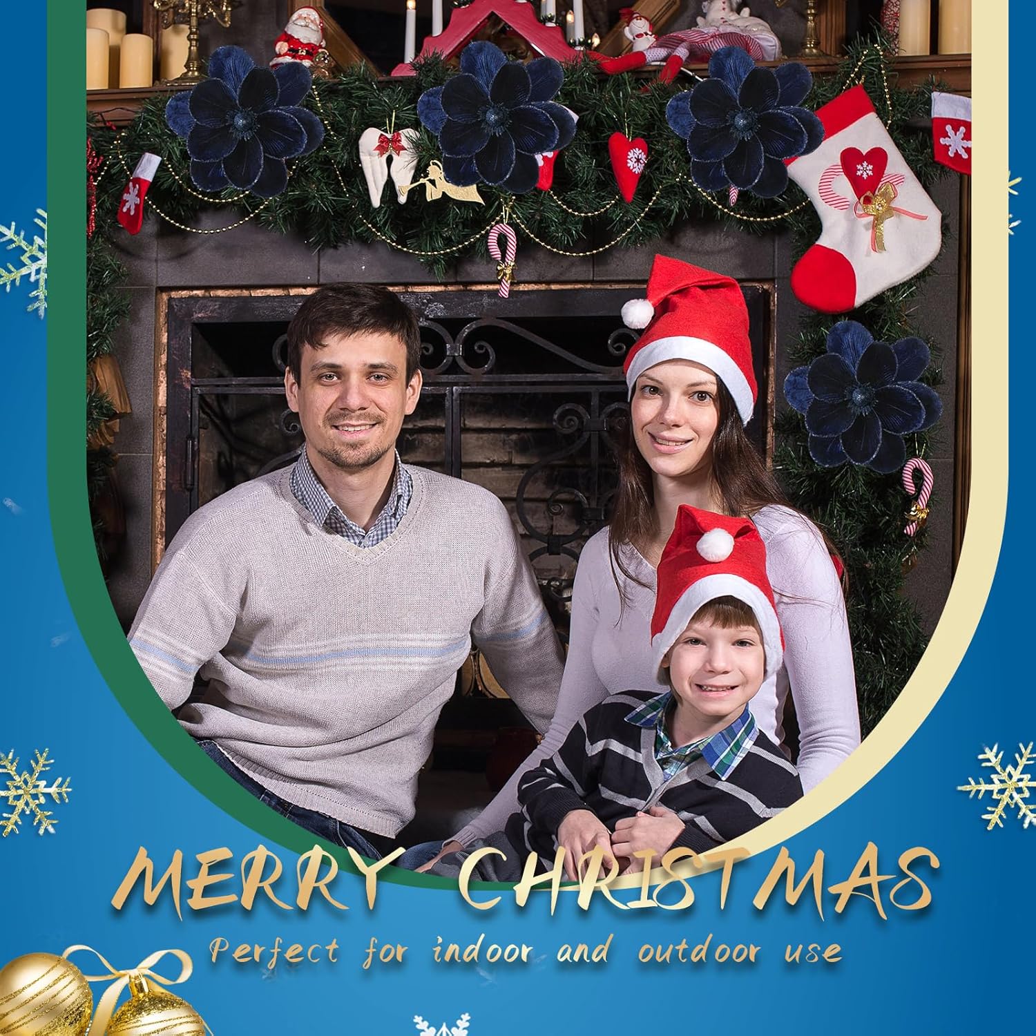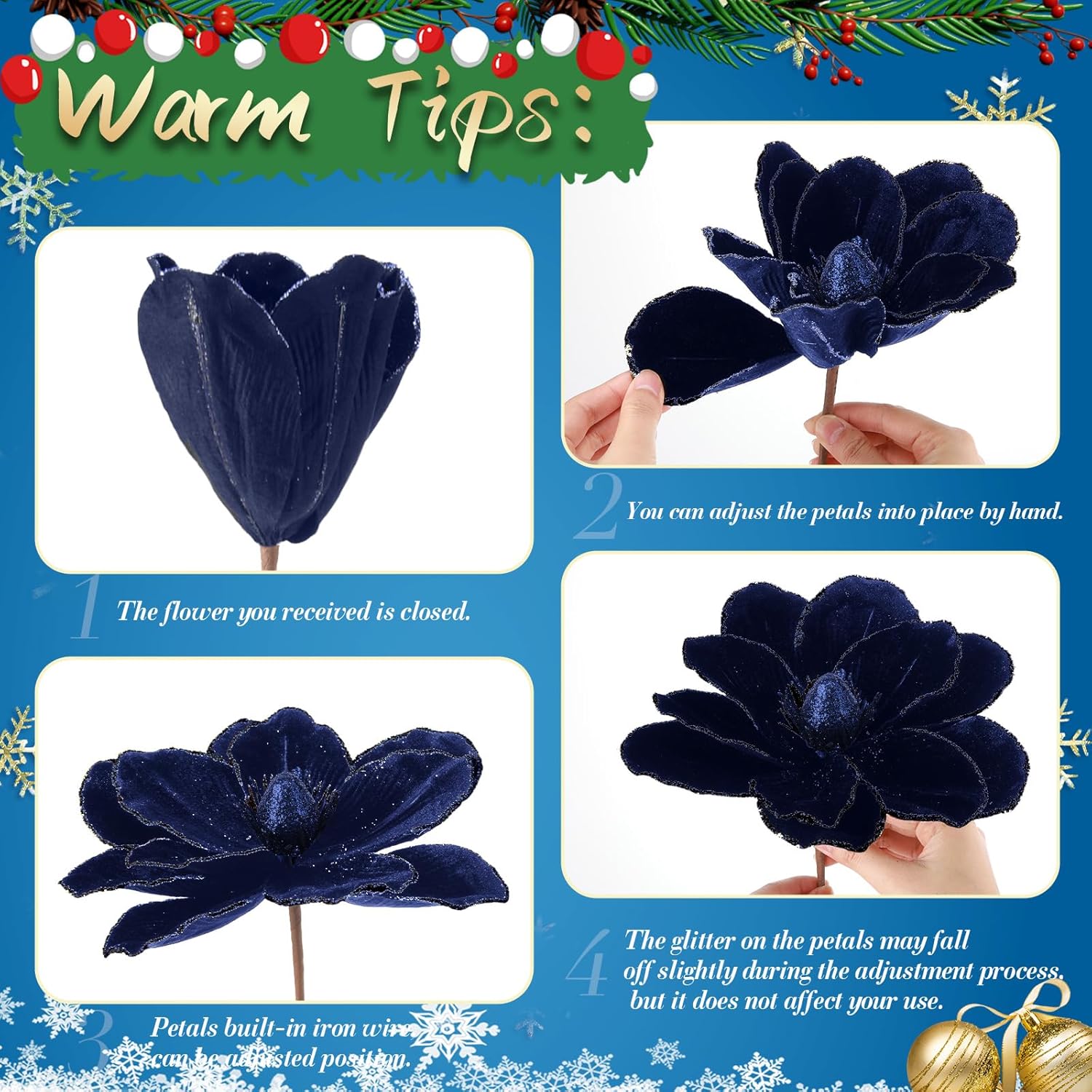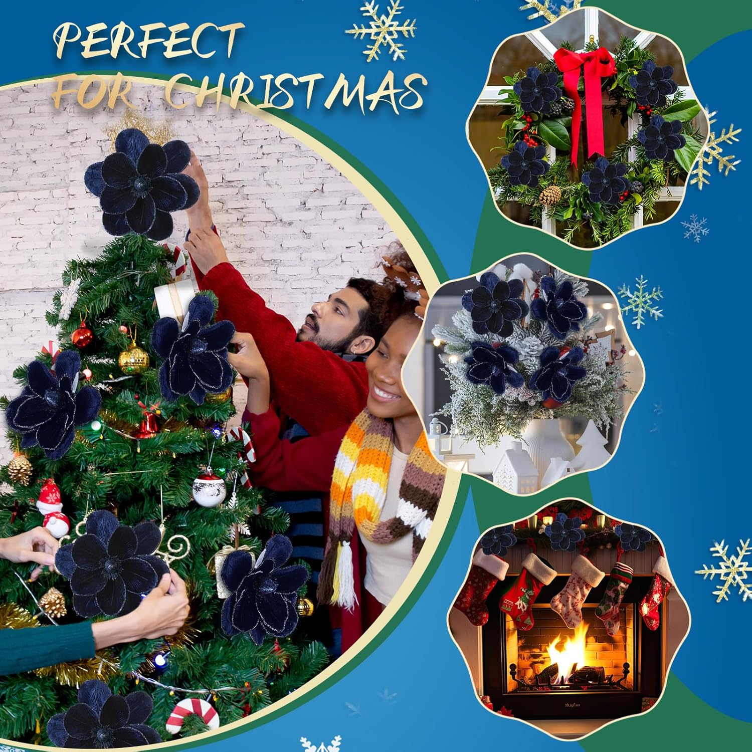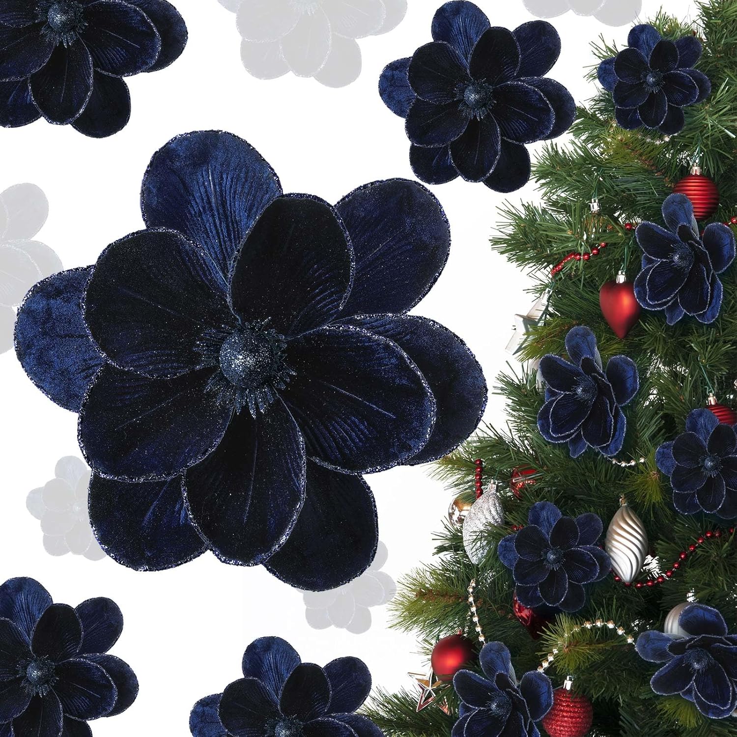 12 Pcs Christmas Velvet Poinsettia Burgundy Magnolia Flowers Ornaments Glitter Large Heads Artificial Magnolia Flowers for Christmas Tree Decorations Wedding Decor Supplies (Dark Blue)