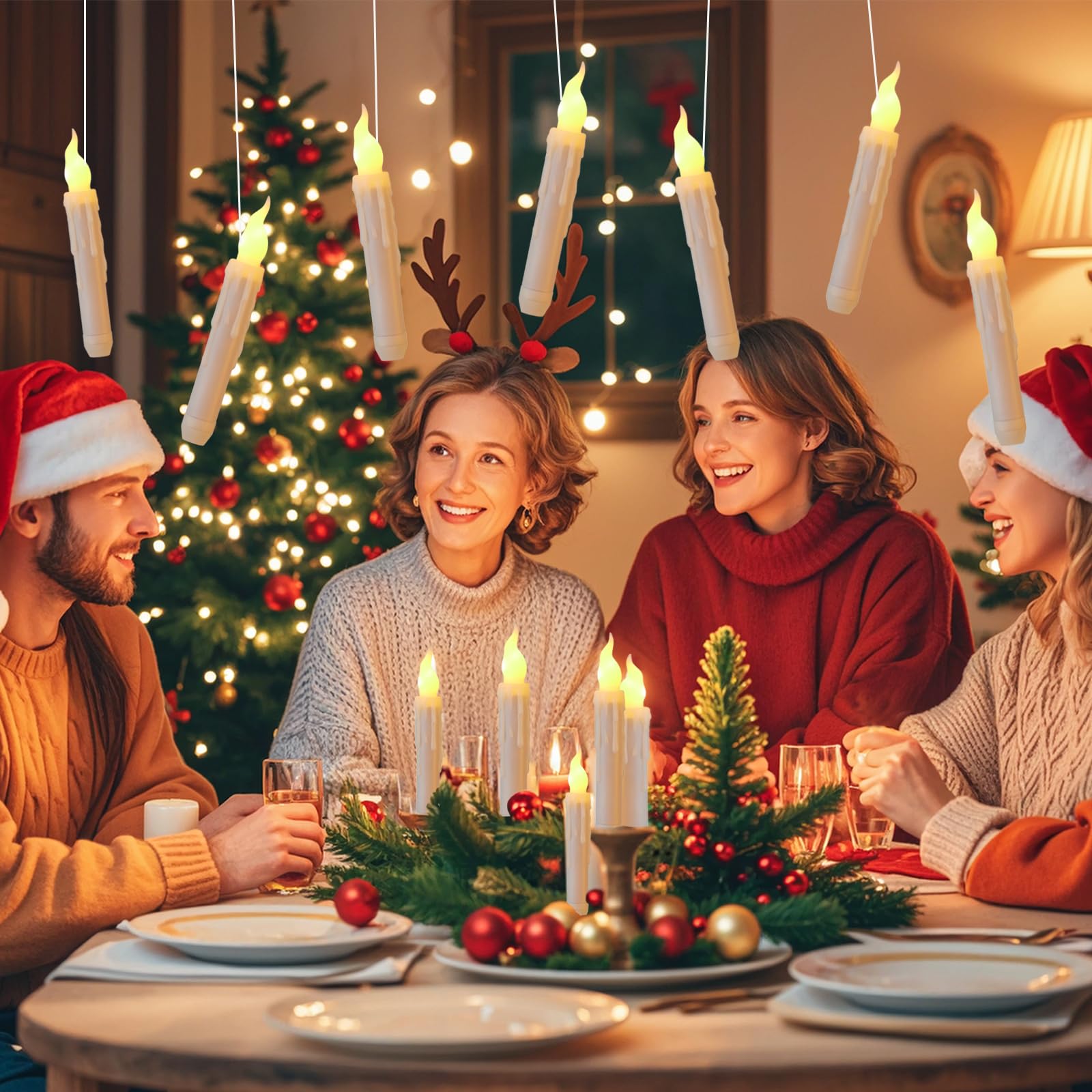 【Specifications】Package Includes: 12 flameless taper candles, 12 hooks, 12 thumbtacks, 1 remote control, 98FT fishing line. Each candle requires 2 x AA batteries (Not included). 【Muti-purpose】These realistic battery operated taper candles ideal for dinner table, church, birthday, wedding, fireplace, Christmas, Halloween decoration. The most amazing thing is that you can hang them on the ceiling with fishing lines to make the floating candles for party, classroom, bedroom decorations.