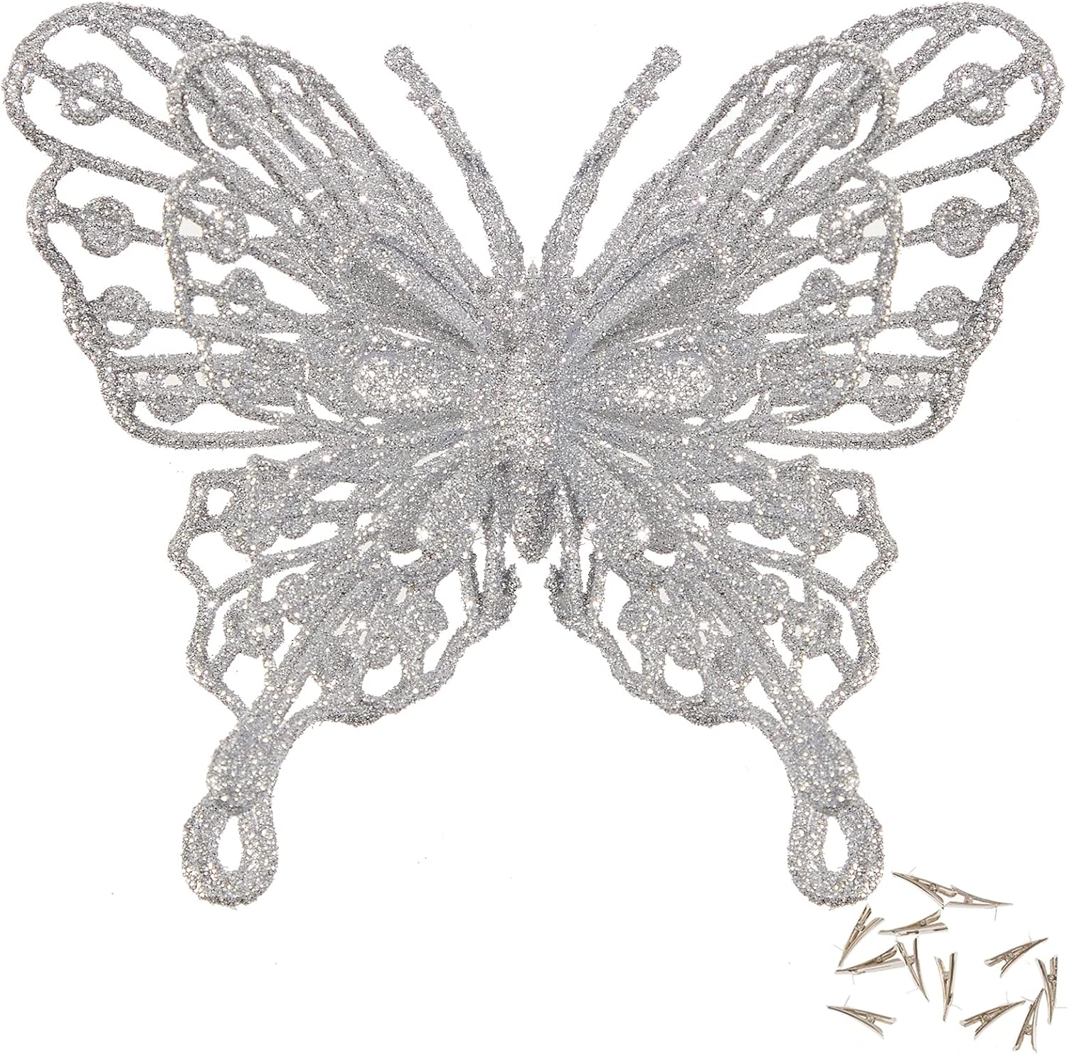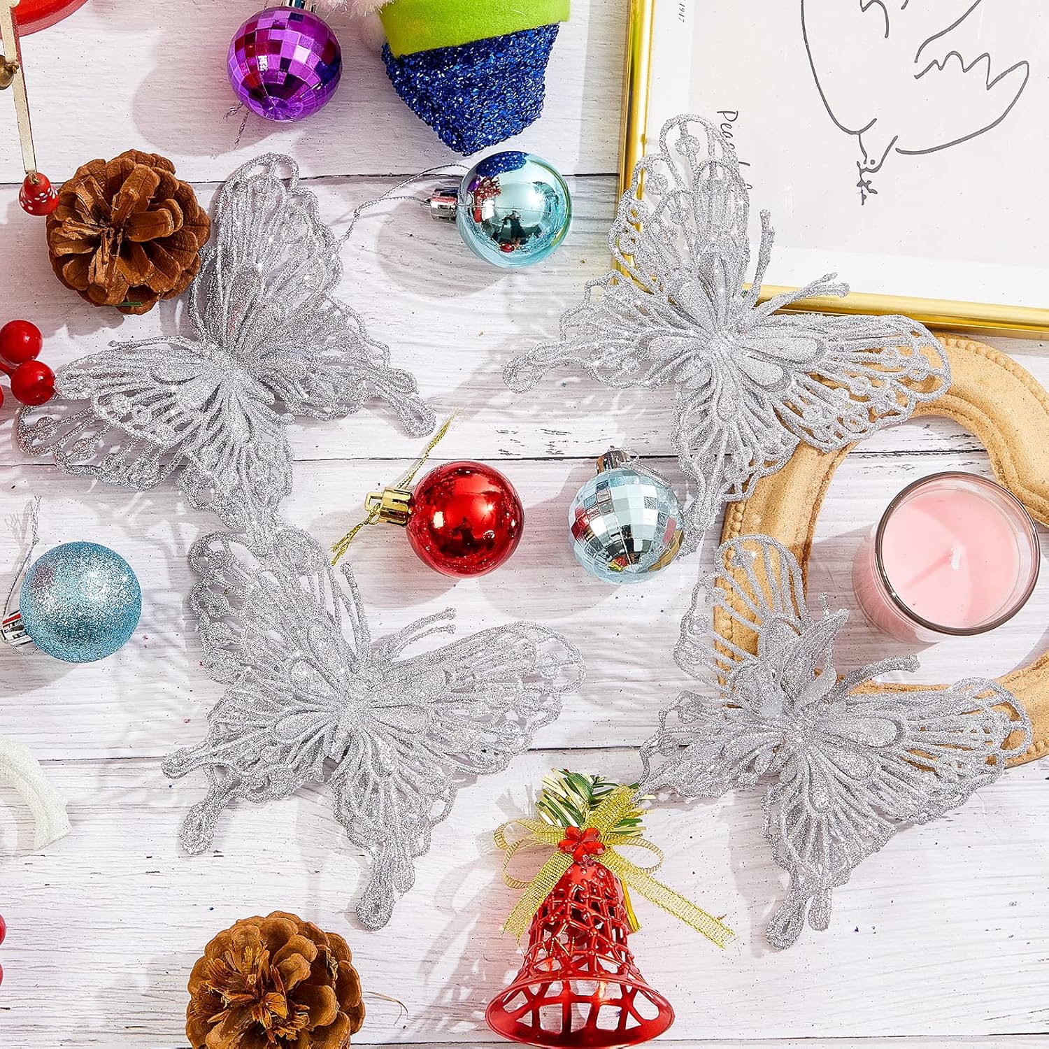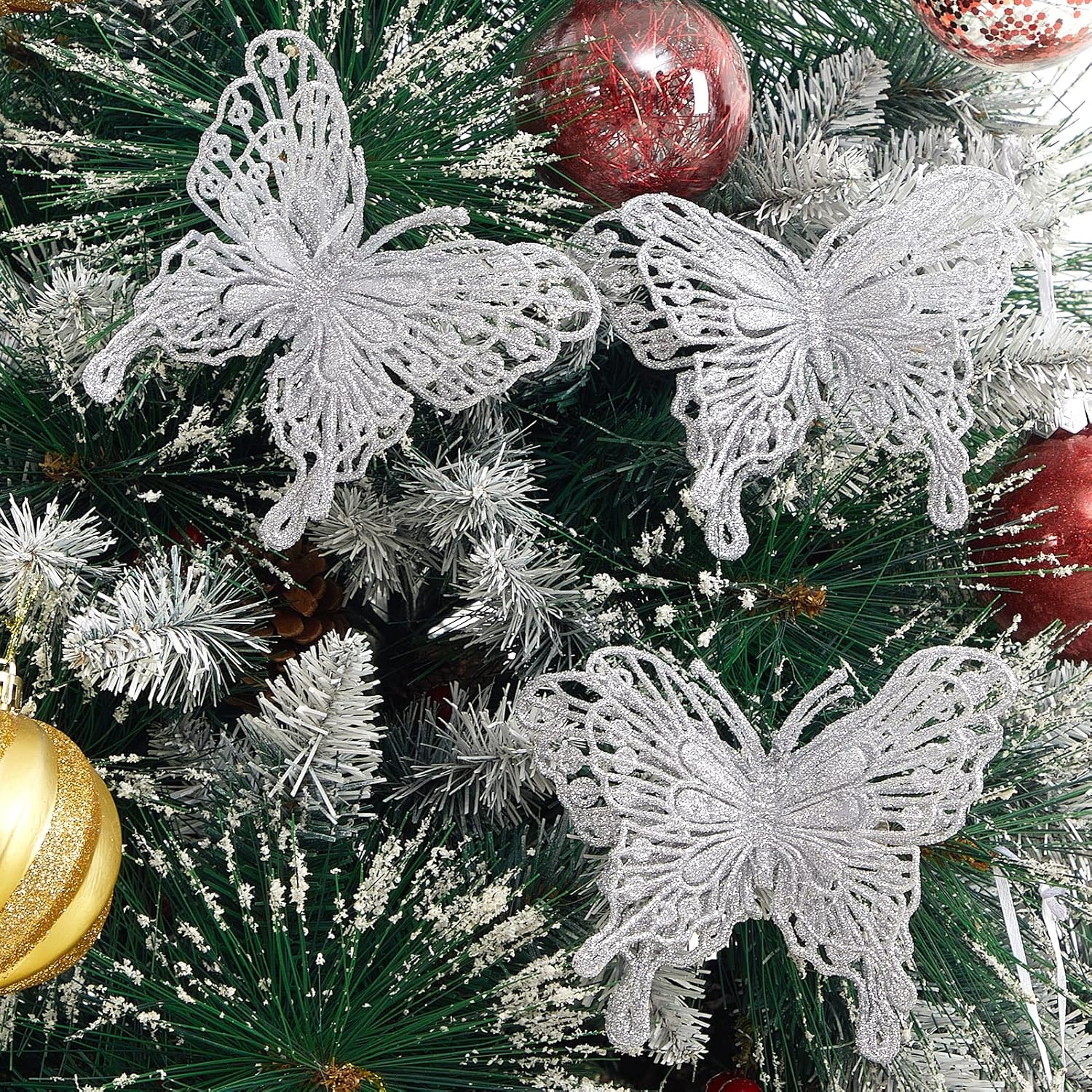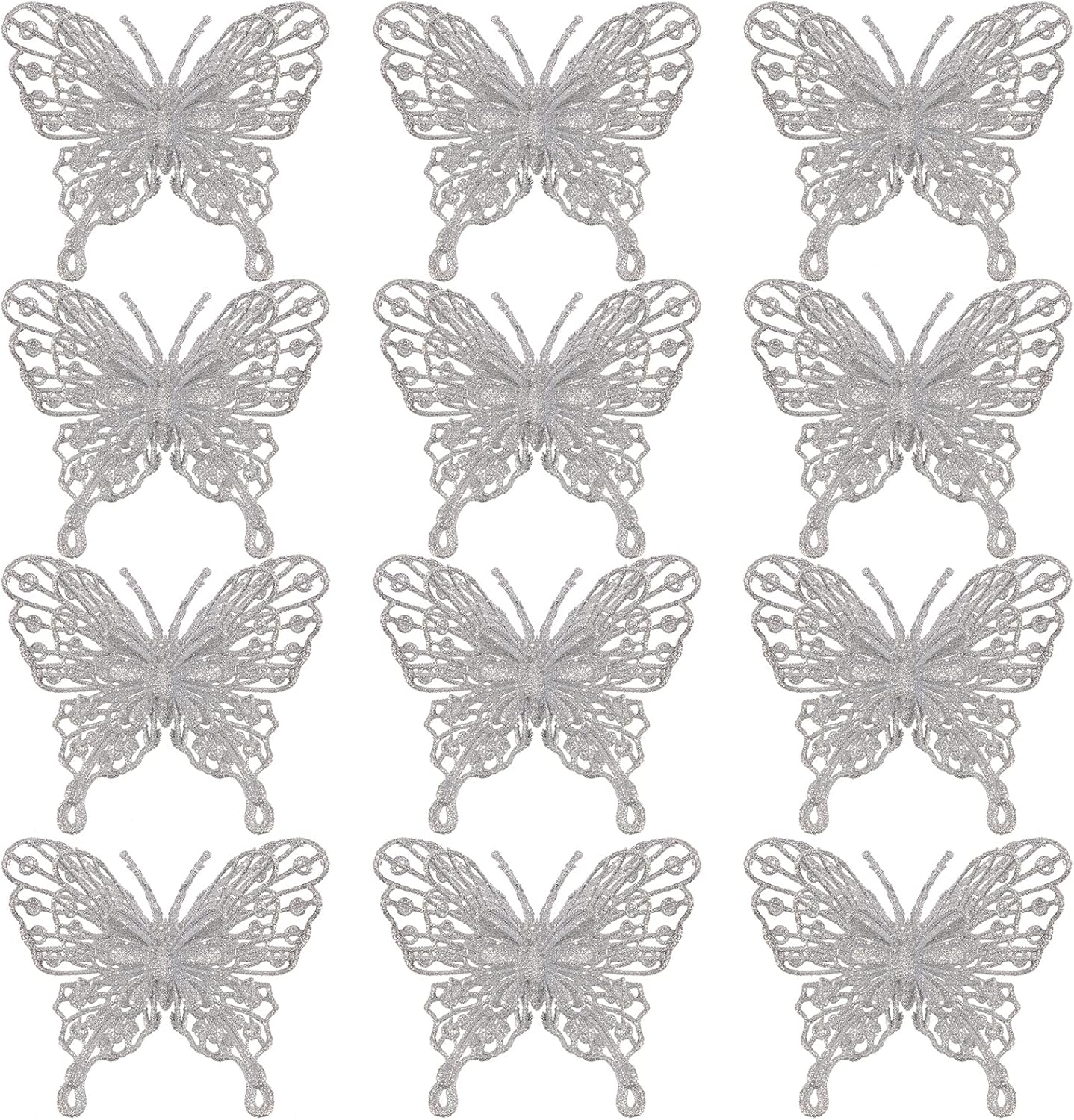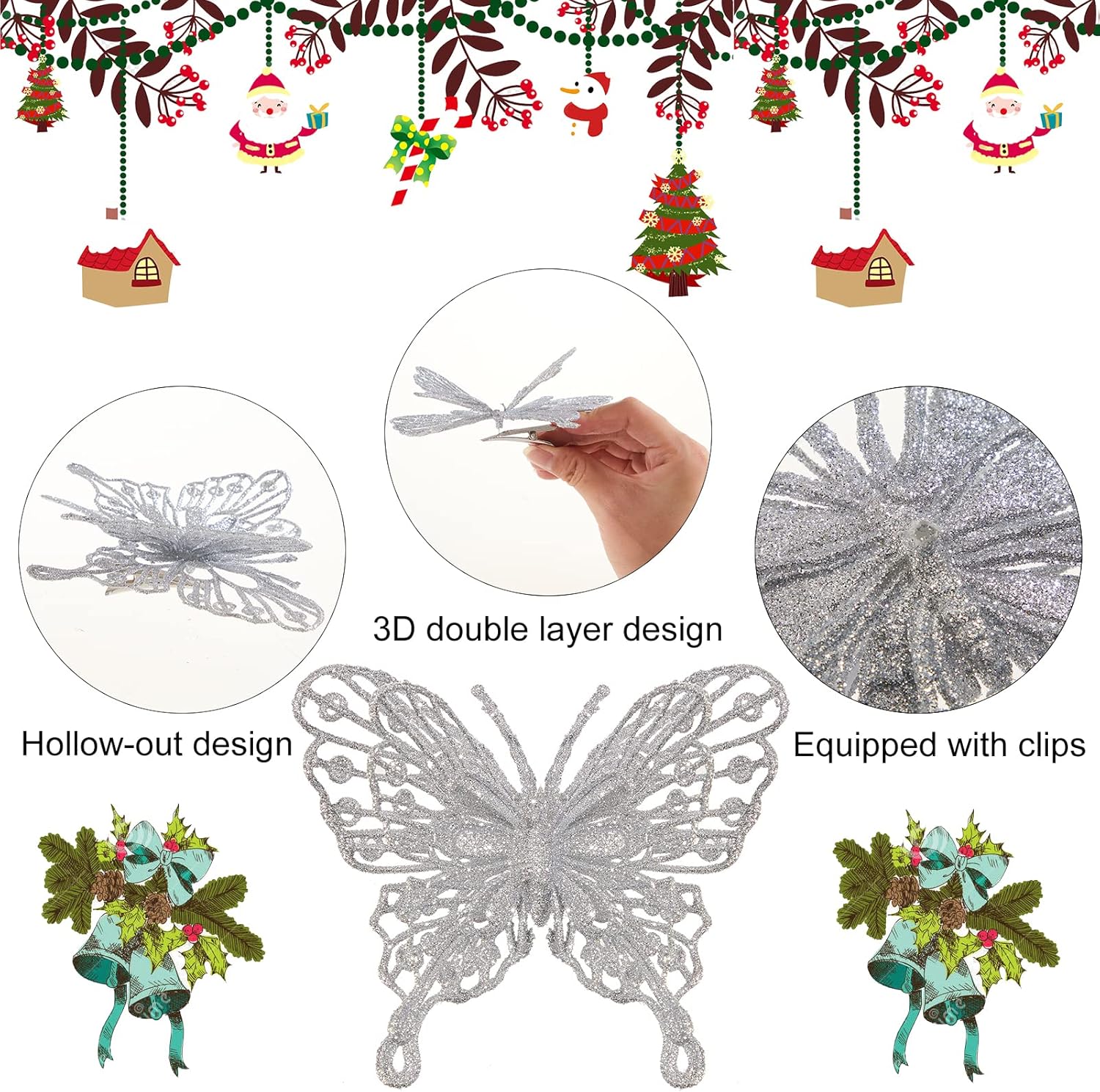 12 PCS Glitter Butterfly Christmas Tree Ornaments, Hollow-Out Butterfly Christmas Decoration with Clips, Craft Xmas Ornaments, Christmas Tree, Wreath, Garland, Home Decorations, Silver