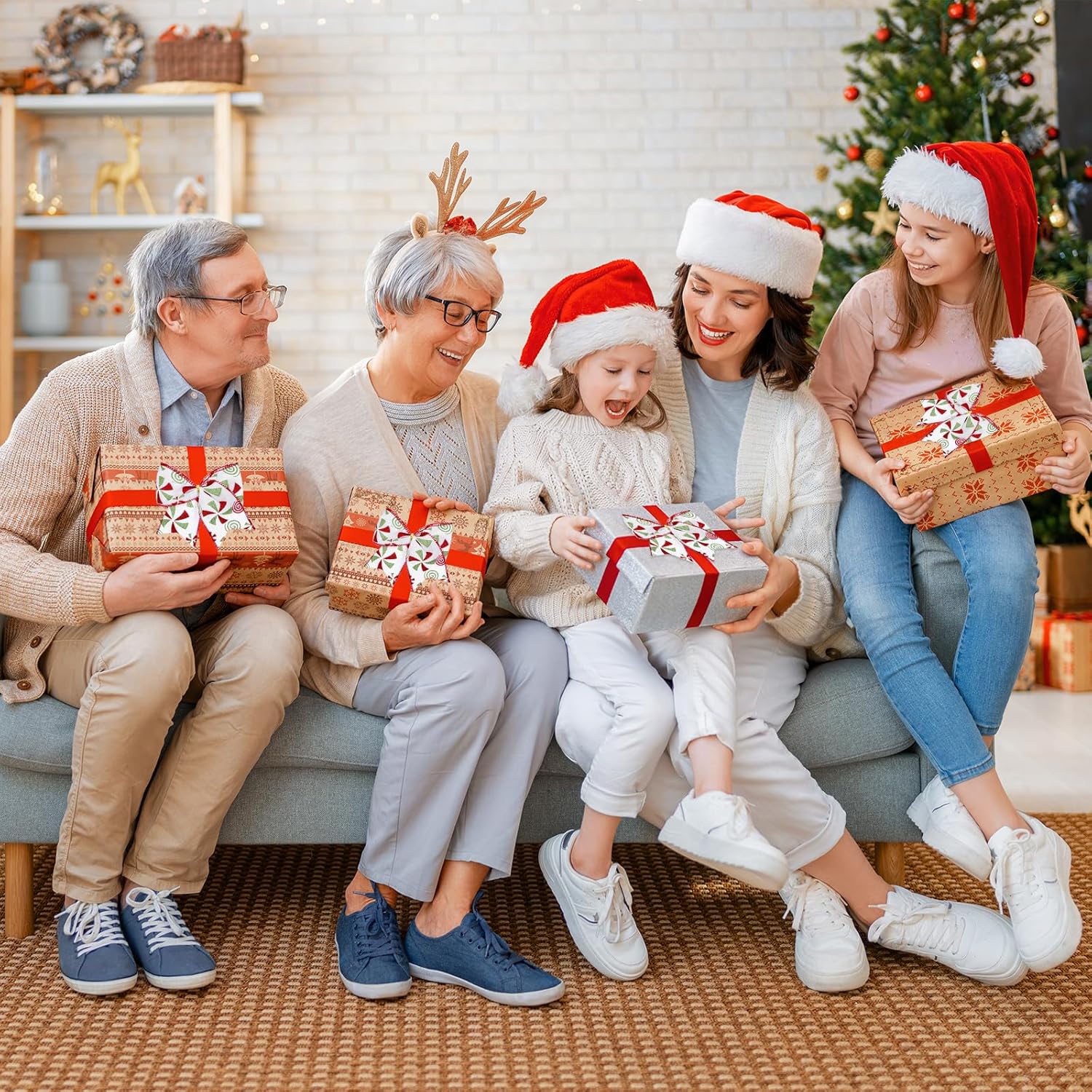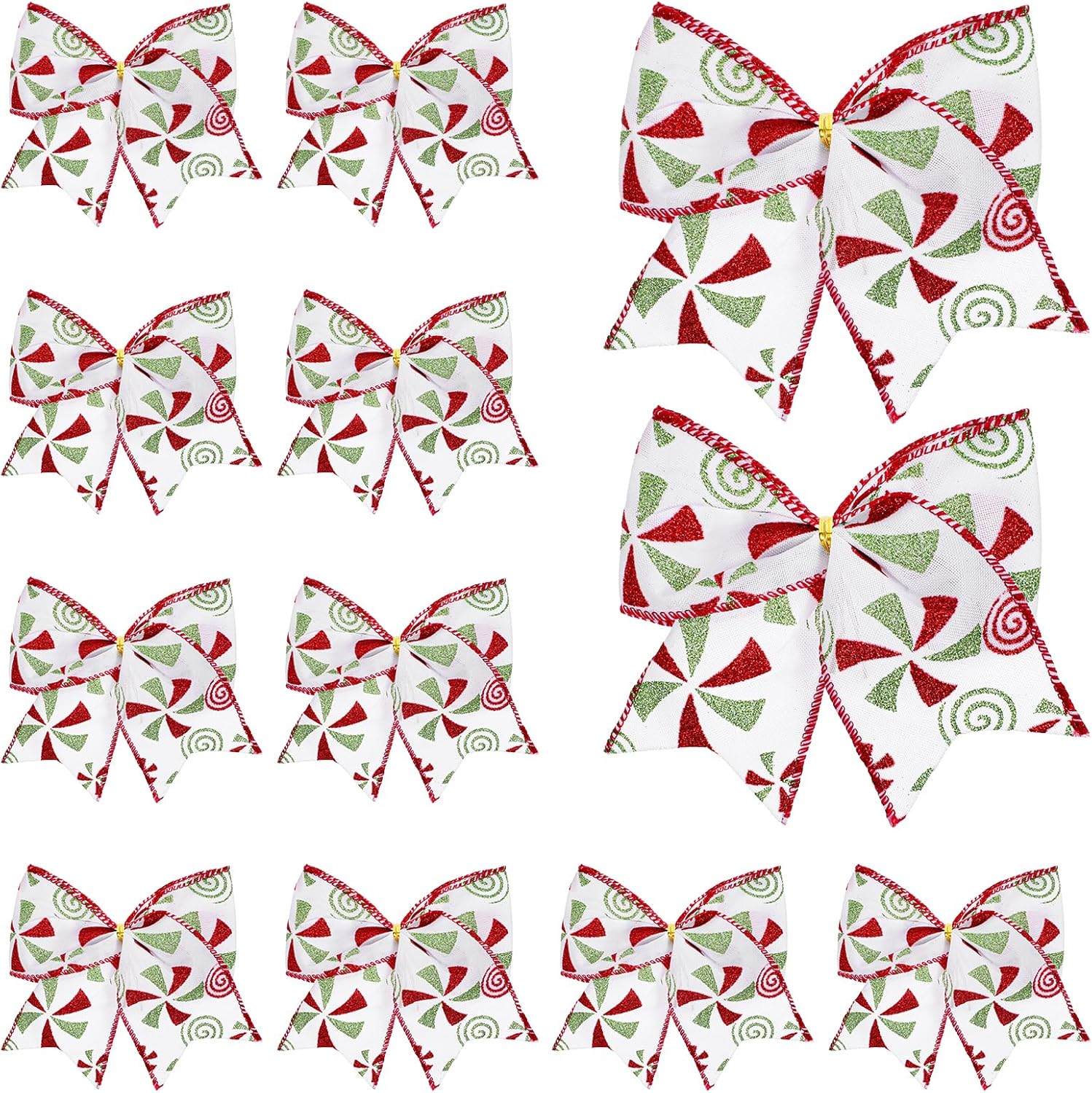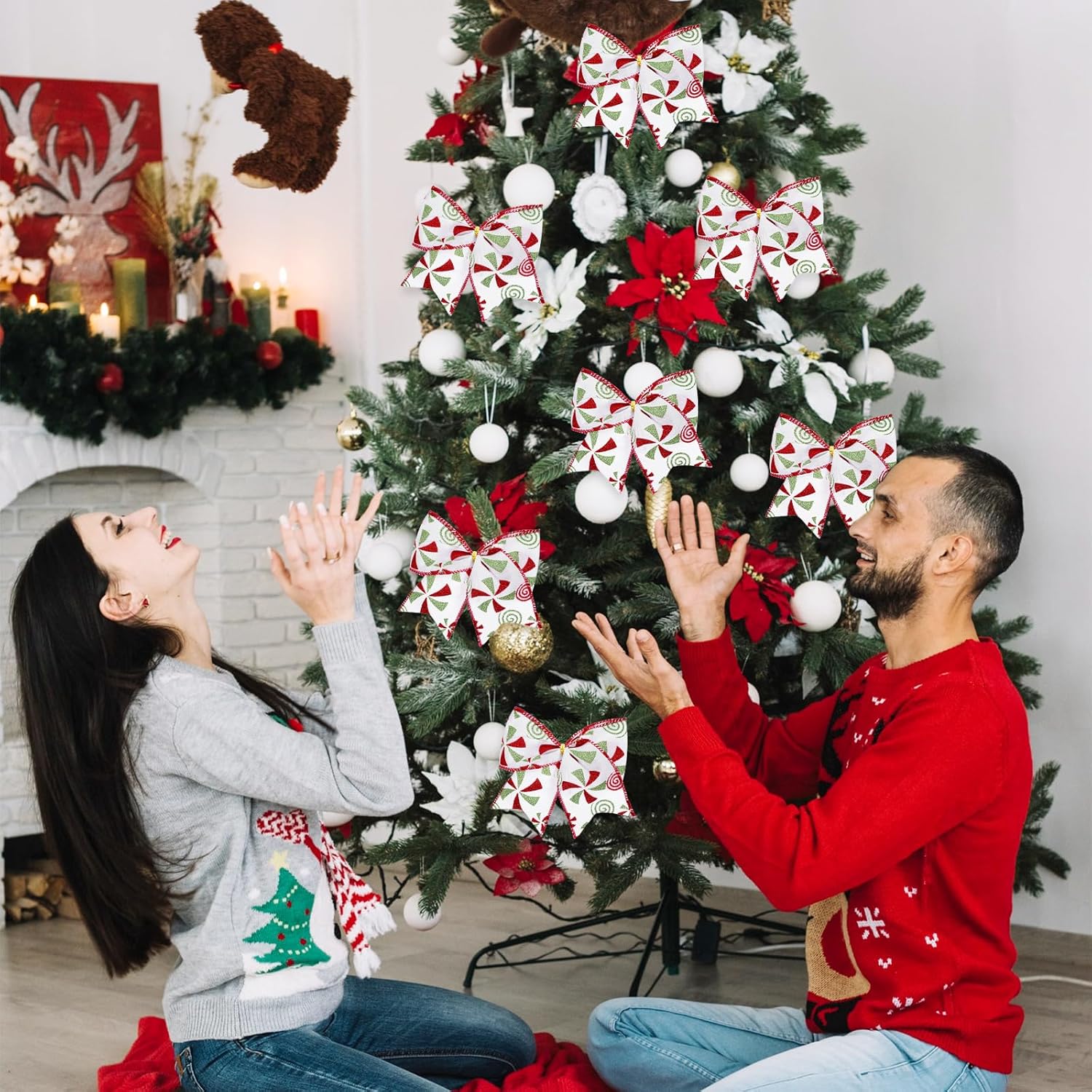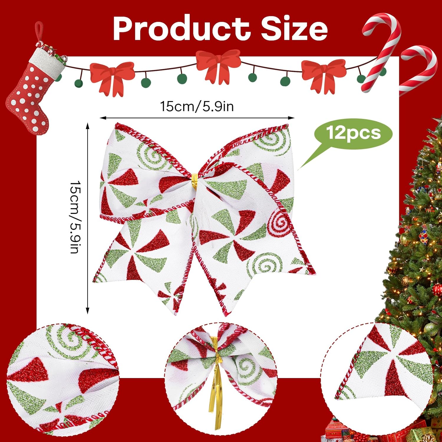 12 Pcs Red Green Christmas Bows, 5.9“ Christmas Tree Candy Wreaths Bows, Xmas Elf Tree Dot Bows Peppermint Garland Ribbon Ornaments Santa Decorations for Home Party Crafts Wrap(White)