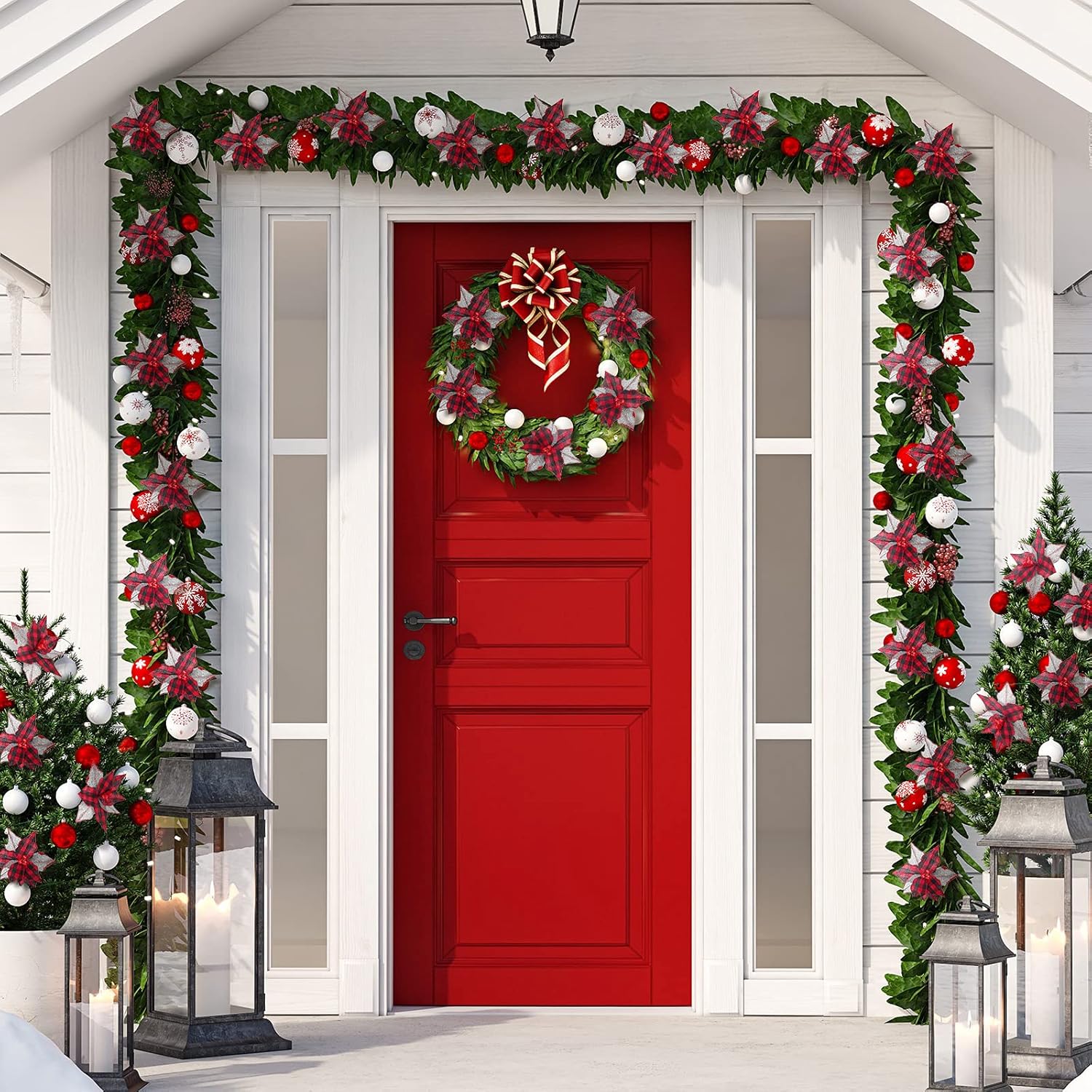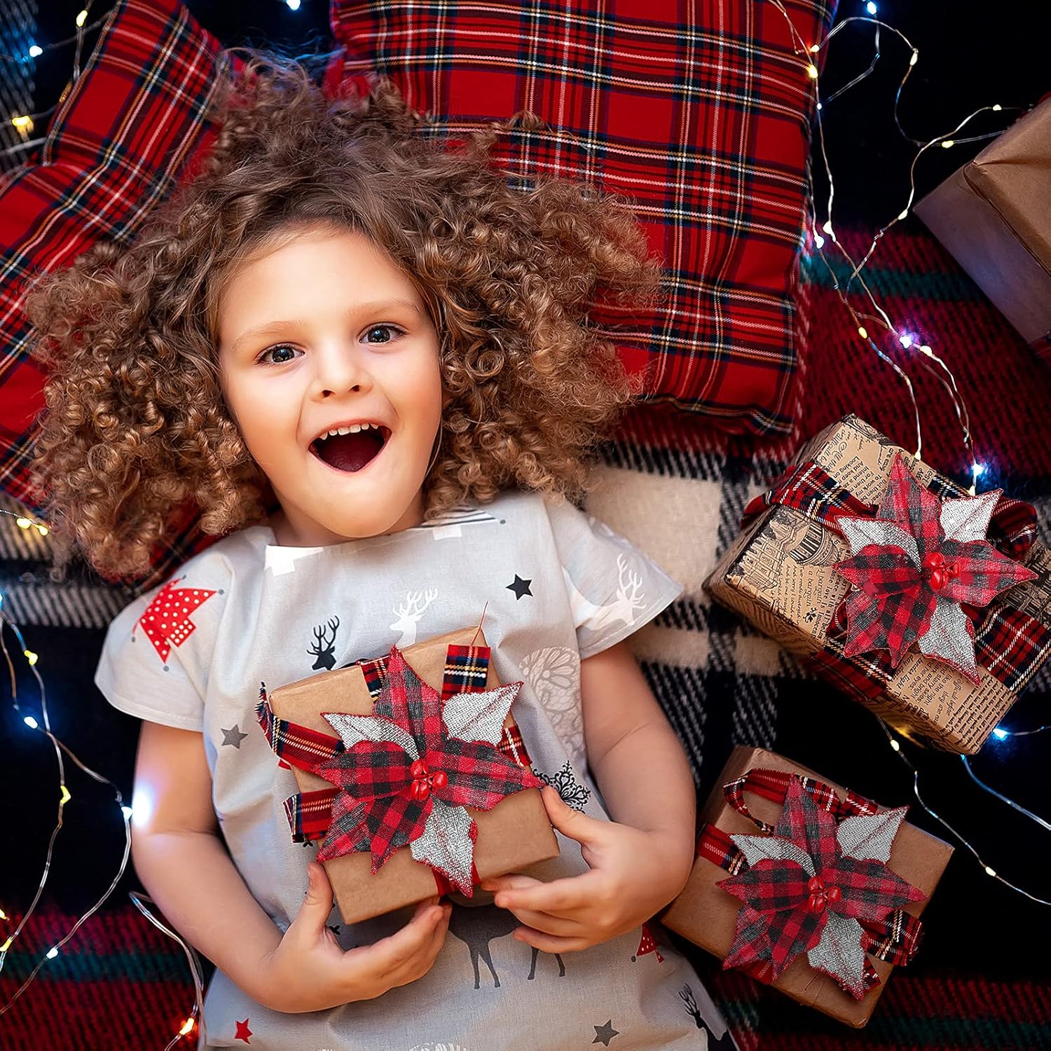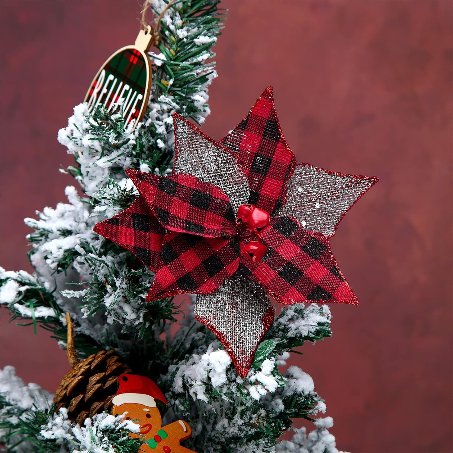 12 Pieces Christmas Buffalo Plaid Poinsettias 6.7 Inches Artificial Christmas Tree Ornaments Checked Xmas Flower with Bells for Rustic Christmas Tree Wreath Garland (Red Black)