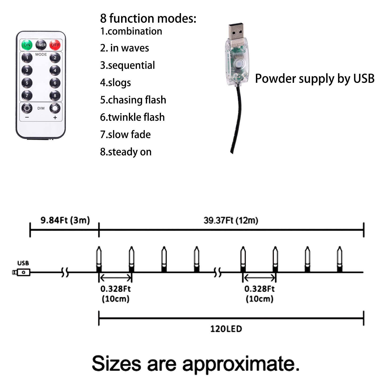 8 Lighting Modes for Your Choice - 120 LED lights, you can ly change 8 lighting modes in your hand through the included remote control: Combination,in waves, sequential, slogs, chasing flash, twinkle flash,slow fade,steady on. Convenient USB Power Supply - The power plug is a USB port for convenient use, you can connect it to a computer, mobile power supply, or other devices with a USB port for charging. Please note that this product does not include a charger.