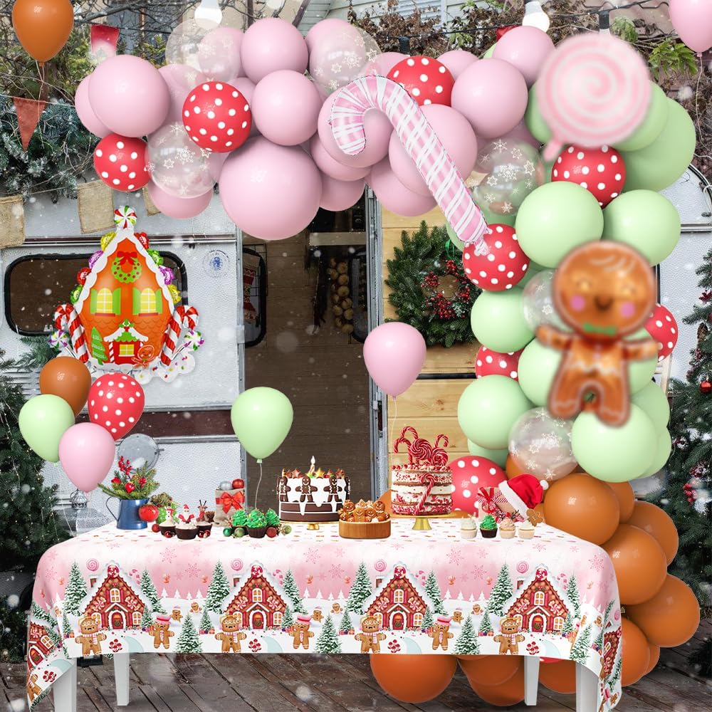 120PCS Christmas Balloon Garland Arch Kit Decorations Pink Green Gingerbread Christmas Balloon Garland with Tablecloth Candyland Candy Cane Christmas Xmas Cookie Holiday Party Decorations