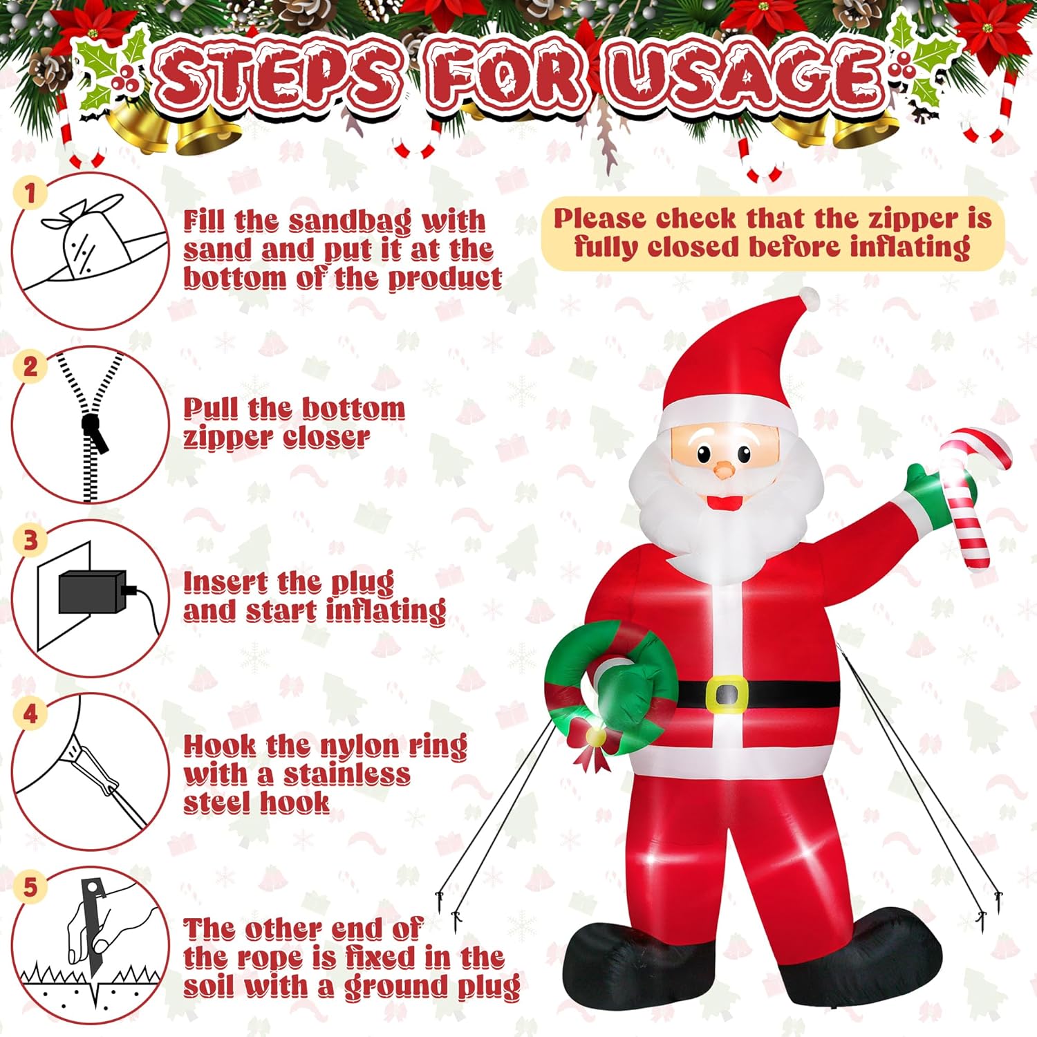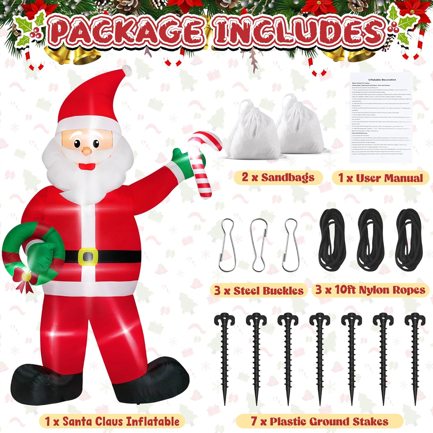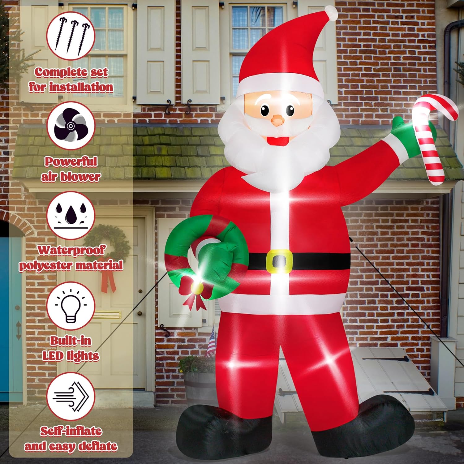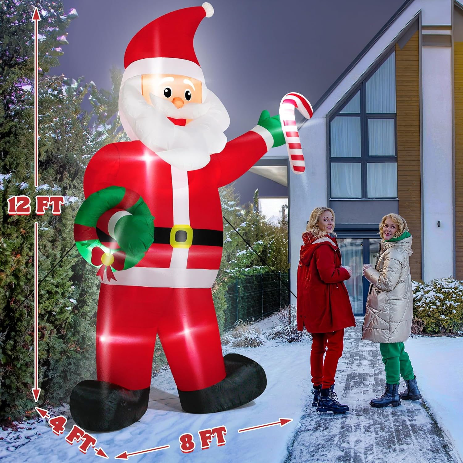 12FT Christmas Inflatables, Giant Inflatable Santa Claus Holding Candy Cane, LED Lighted Blow Up Christmas Santa Claus, Inflatable Santa Claus Outdoor Decorations for Party Holiday Lawn Yard