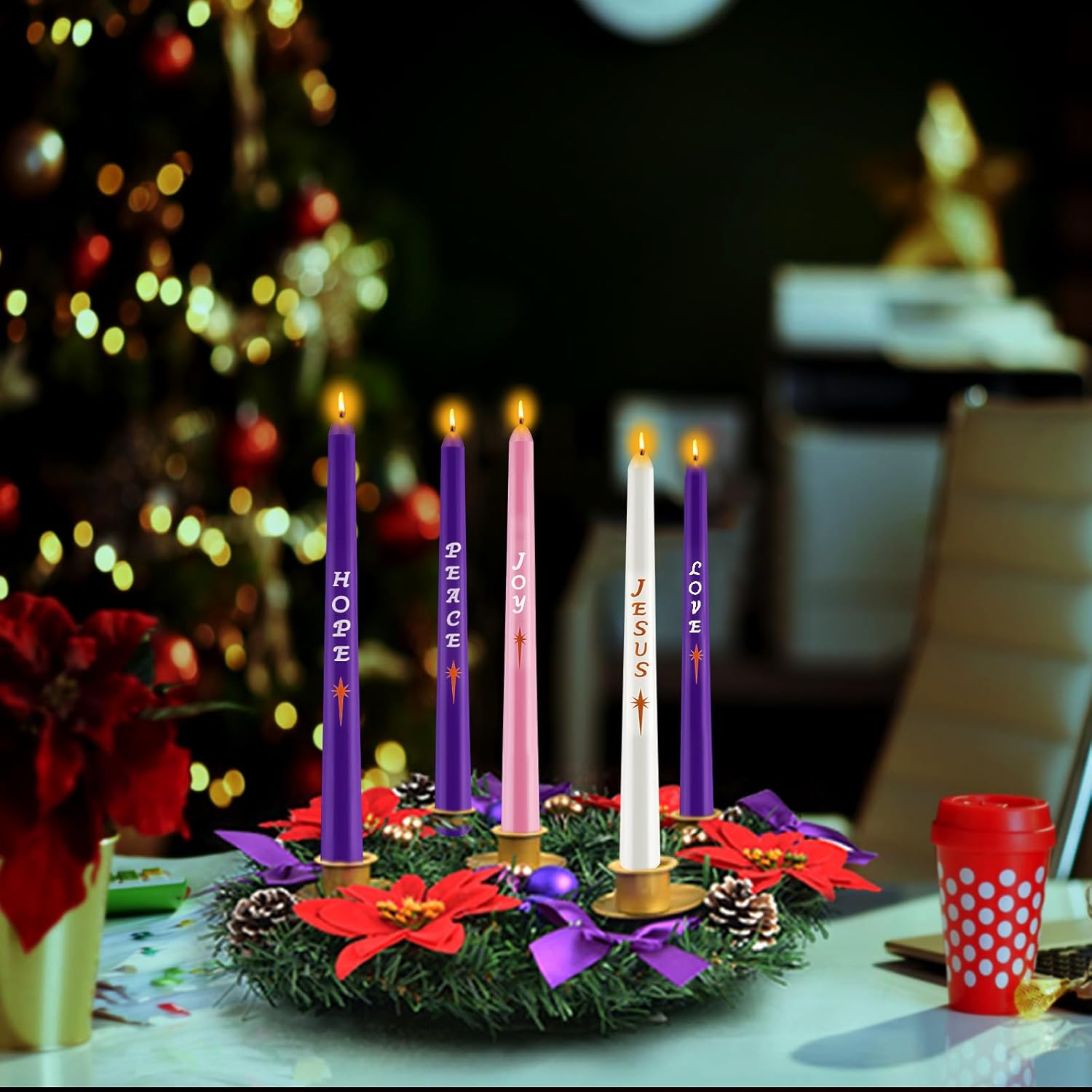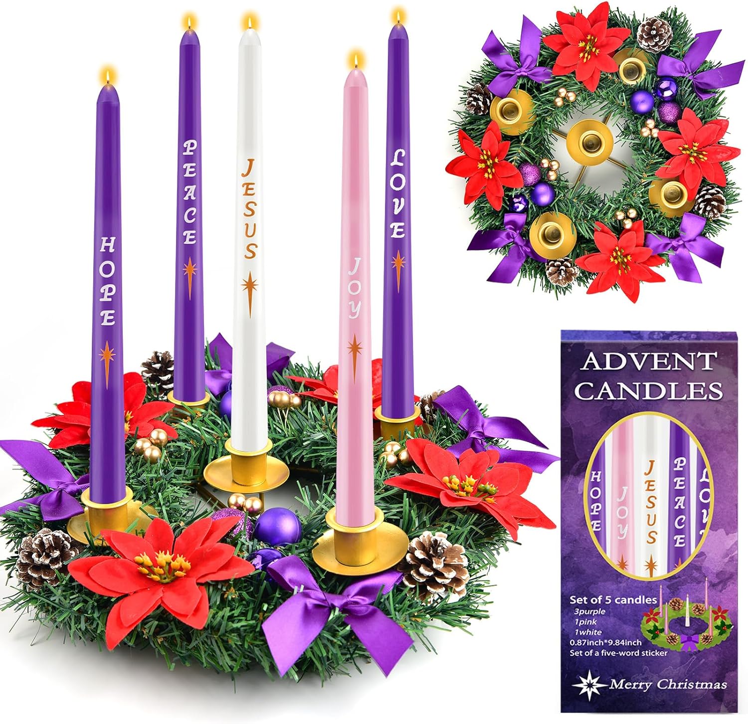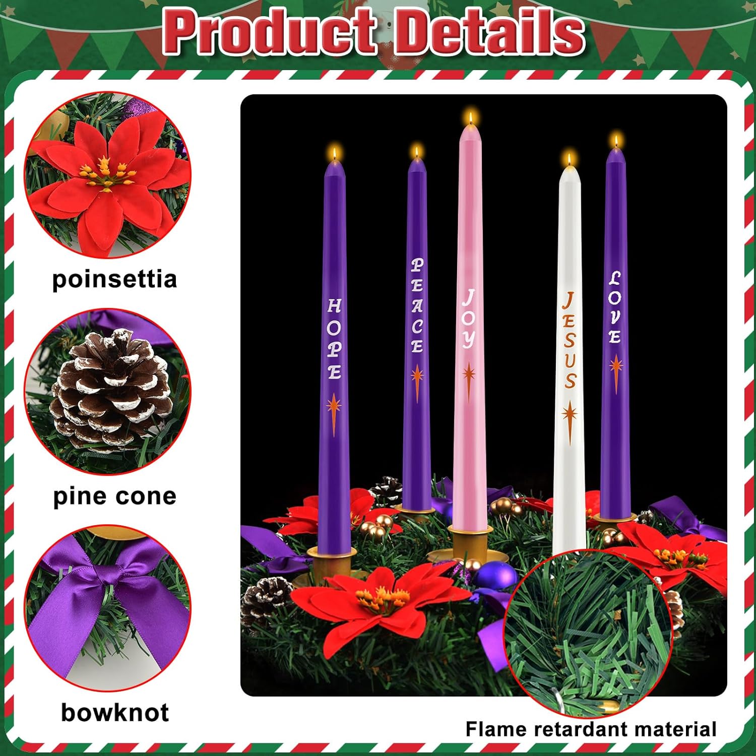 12in Christmas Advent Wreath 5 Candle Holder with Candles, Metal Cups for Taper Candles Advent Wreath and Candles Set Safety Fire Retardant Centerpiece Decorations for Table Indoor Home Church