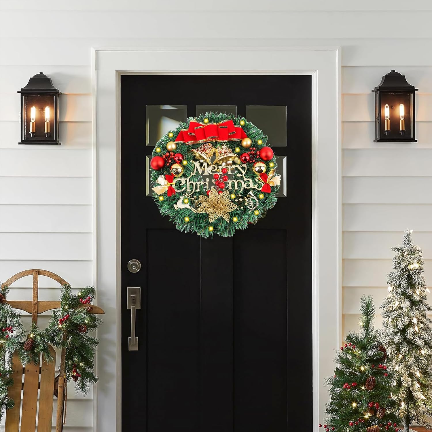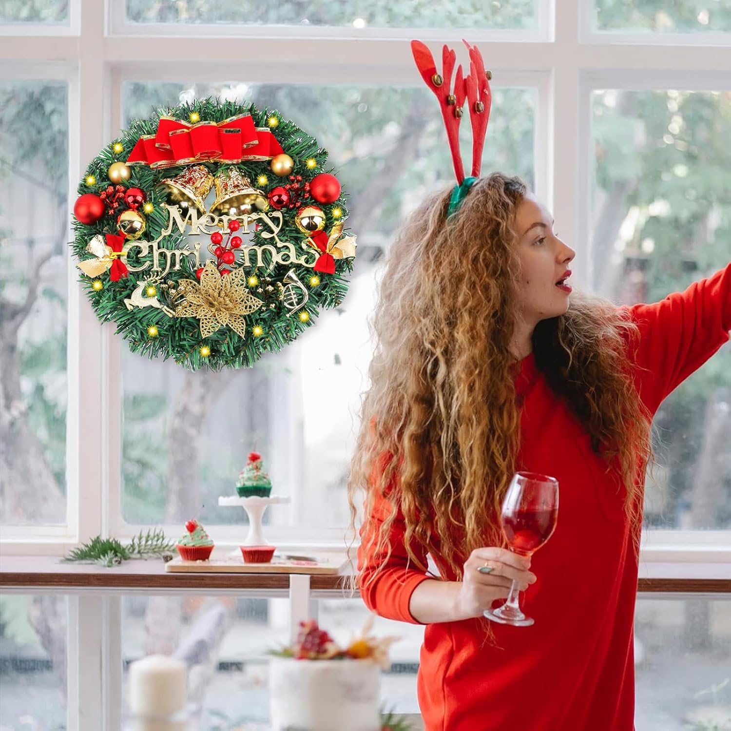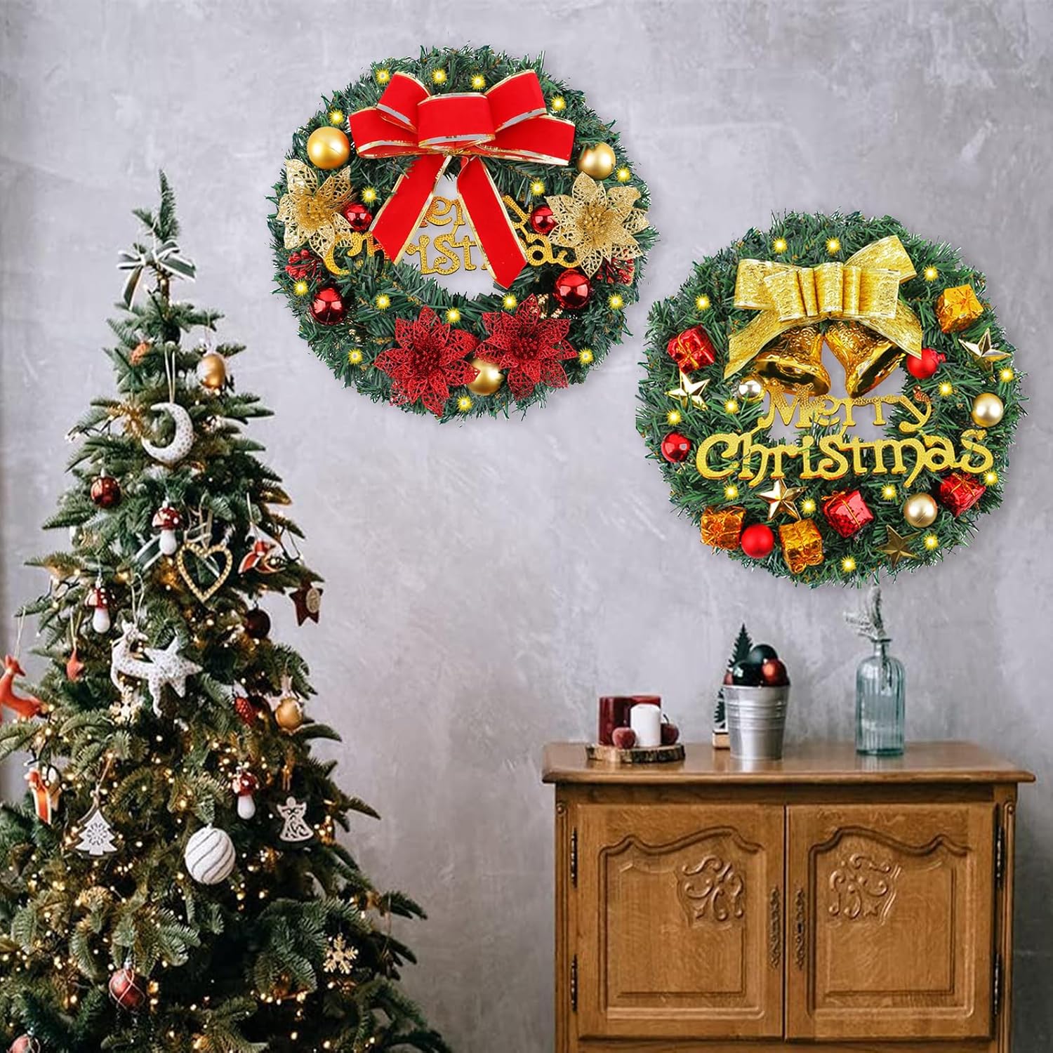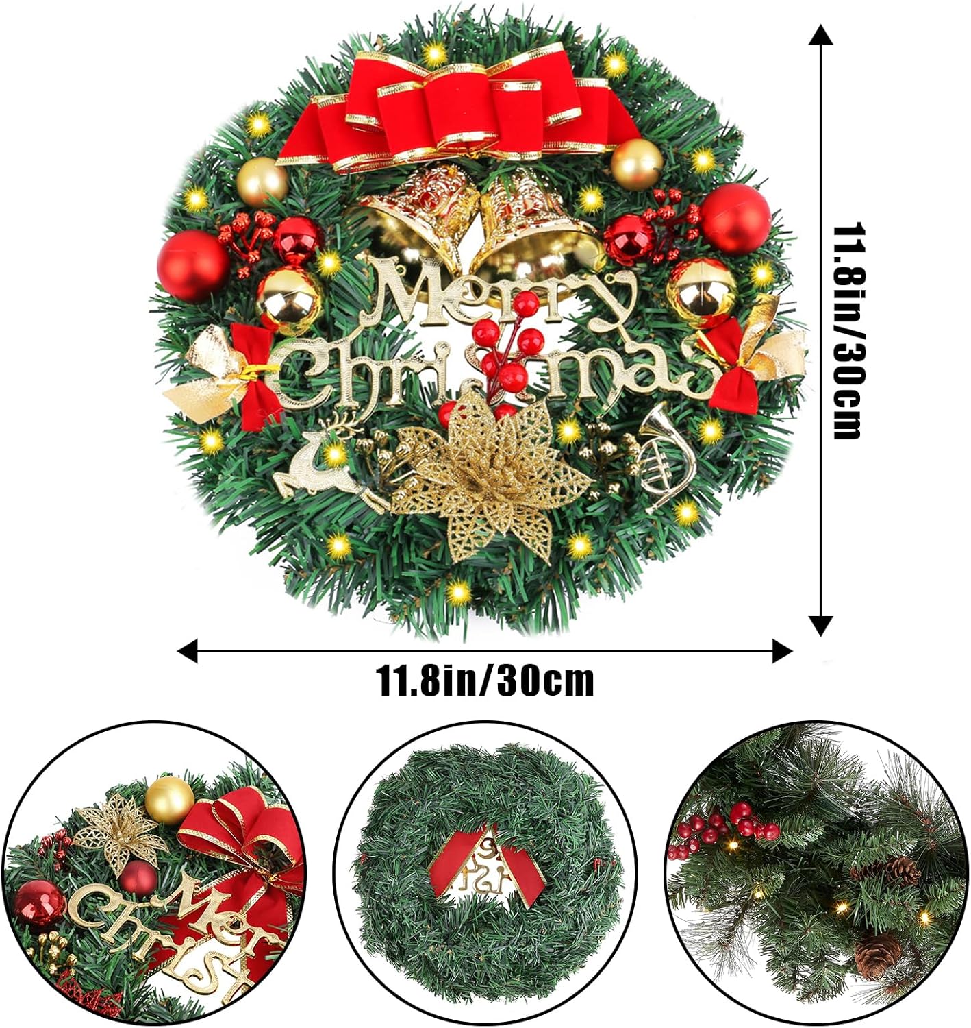 12inch Christmas Wreath with LED Light String, Luminous Wall Mount Door Wreath, Celebrating Holiday Merry Christmas Decoration for Outdoor Indoor Party Table Room