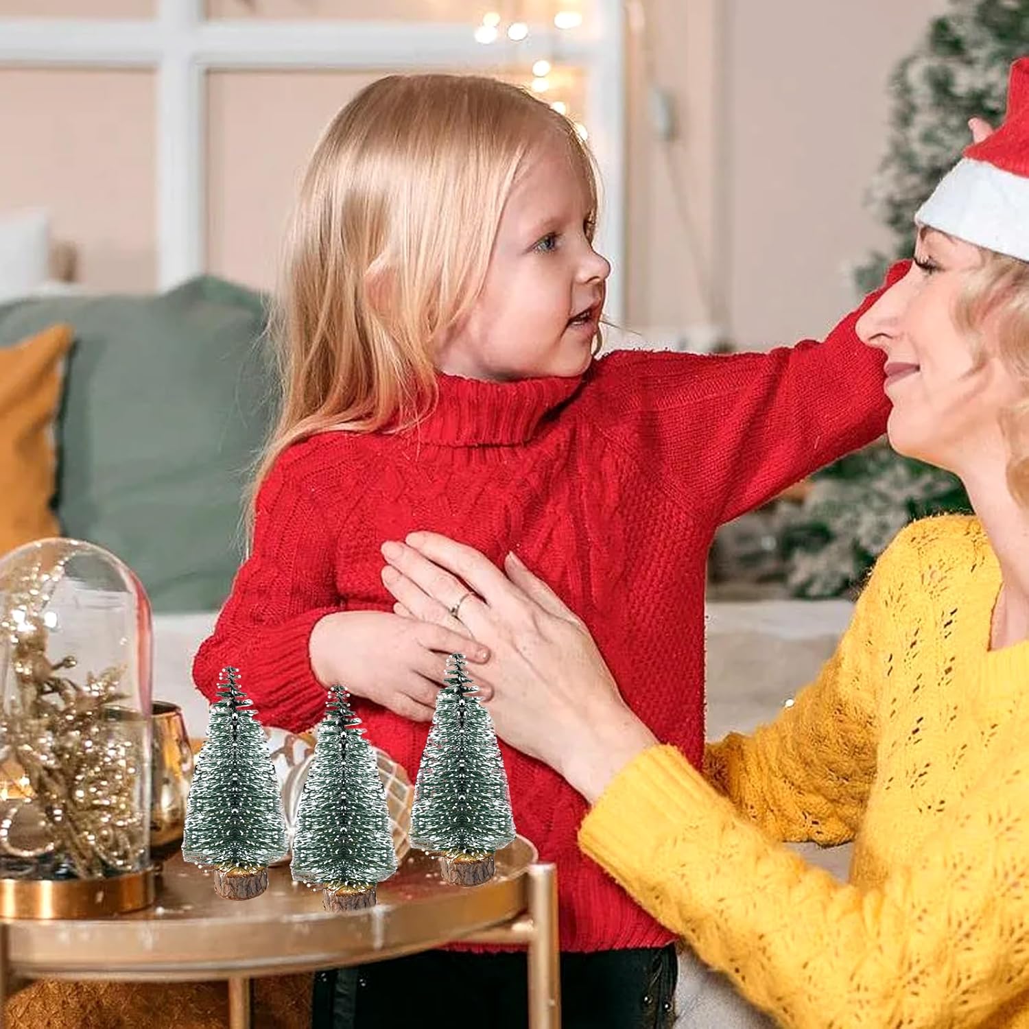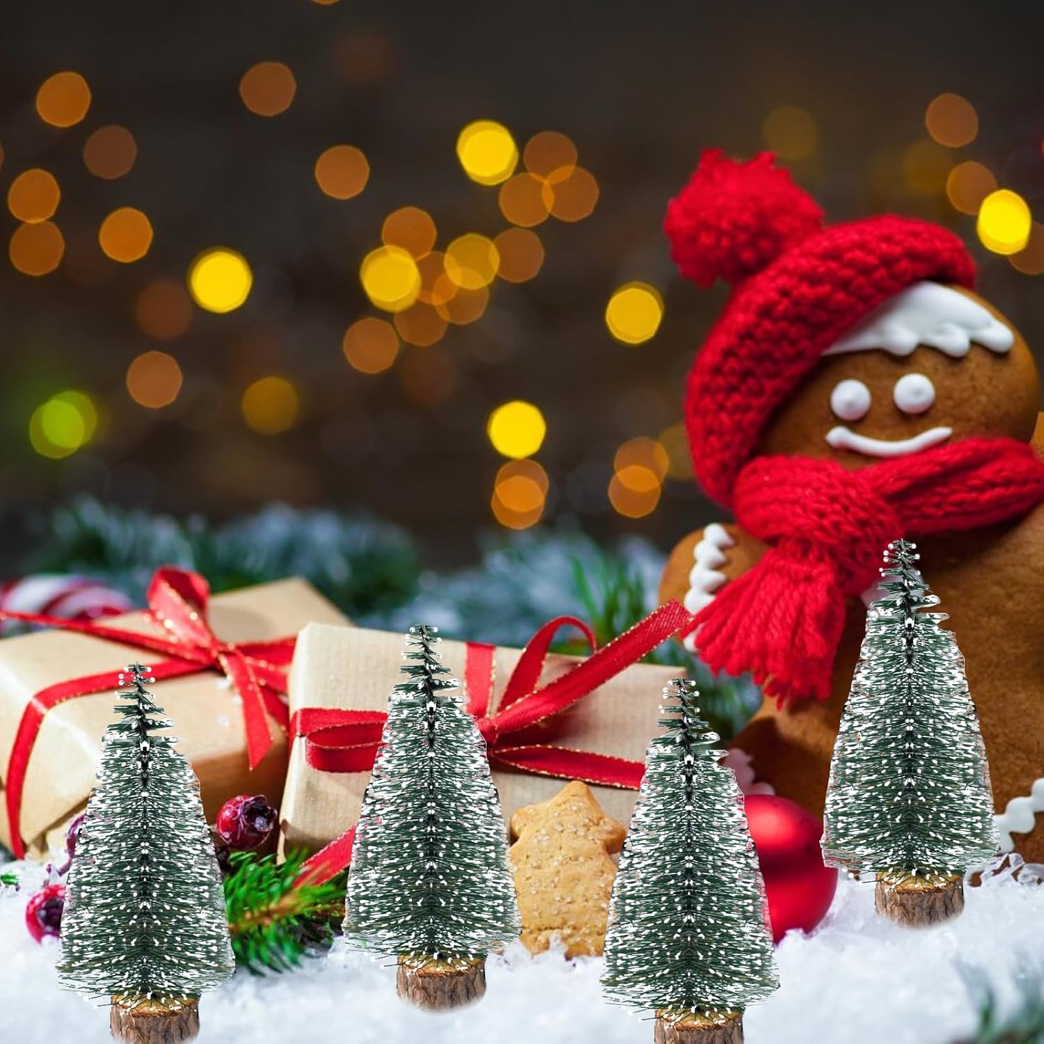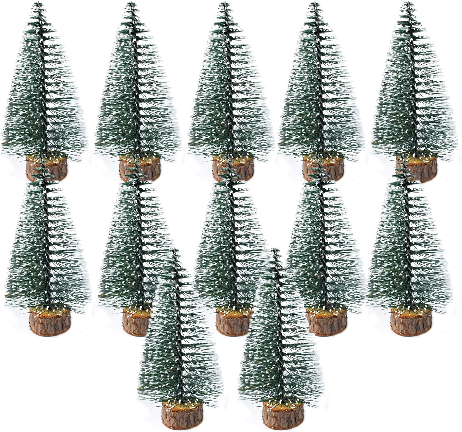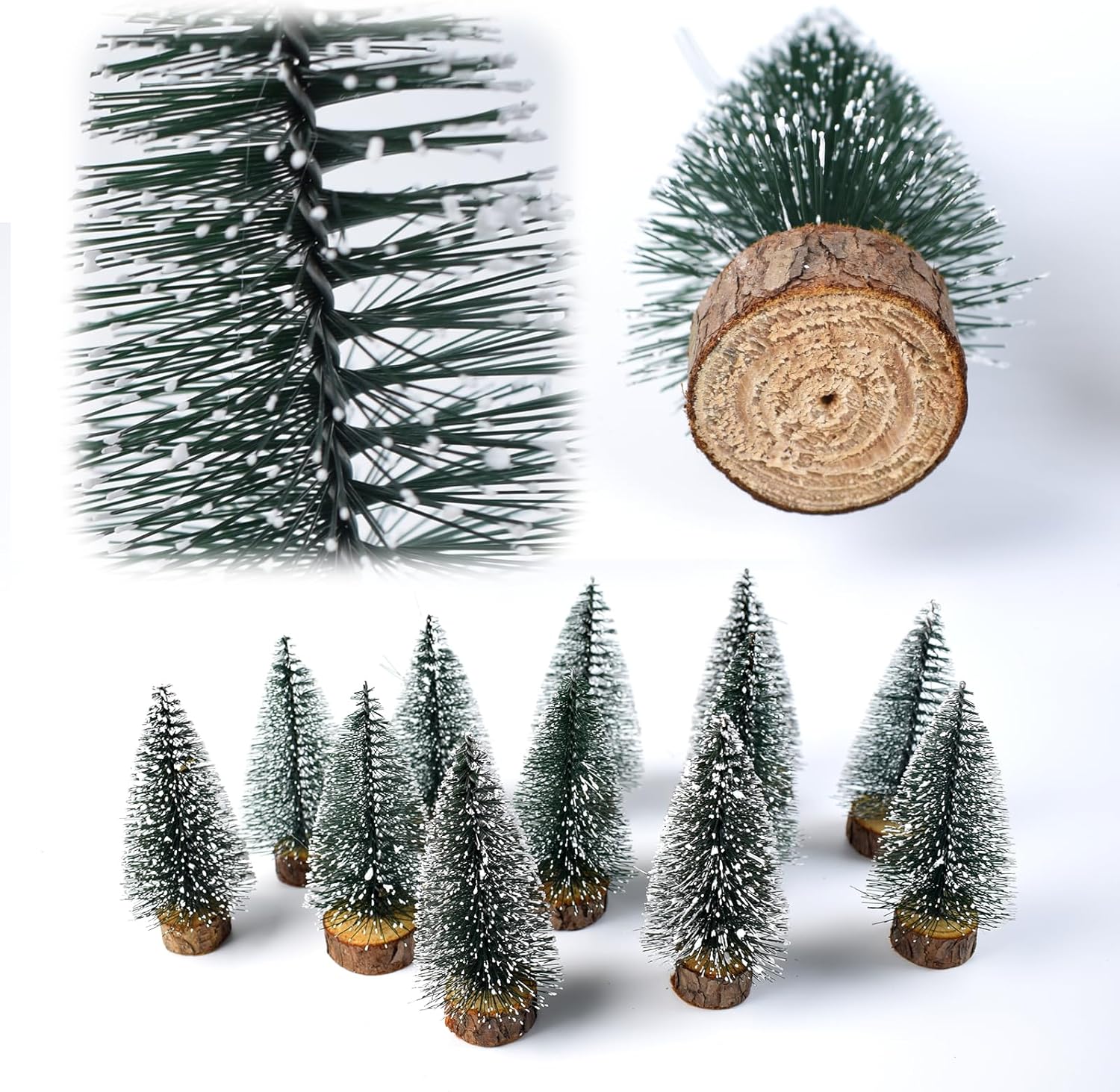 12pcs 4inch Mini Christmas Tree Bottle Brush Chrismas Village Trees Miniature Chrismas Tree Decoration-Plastic Christmas Trees with Wooden Base