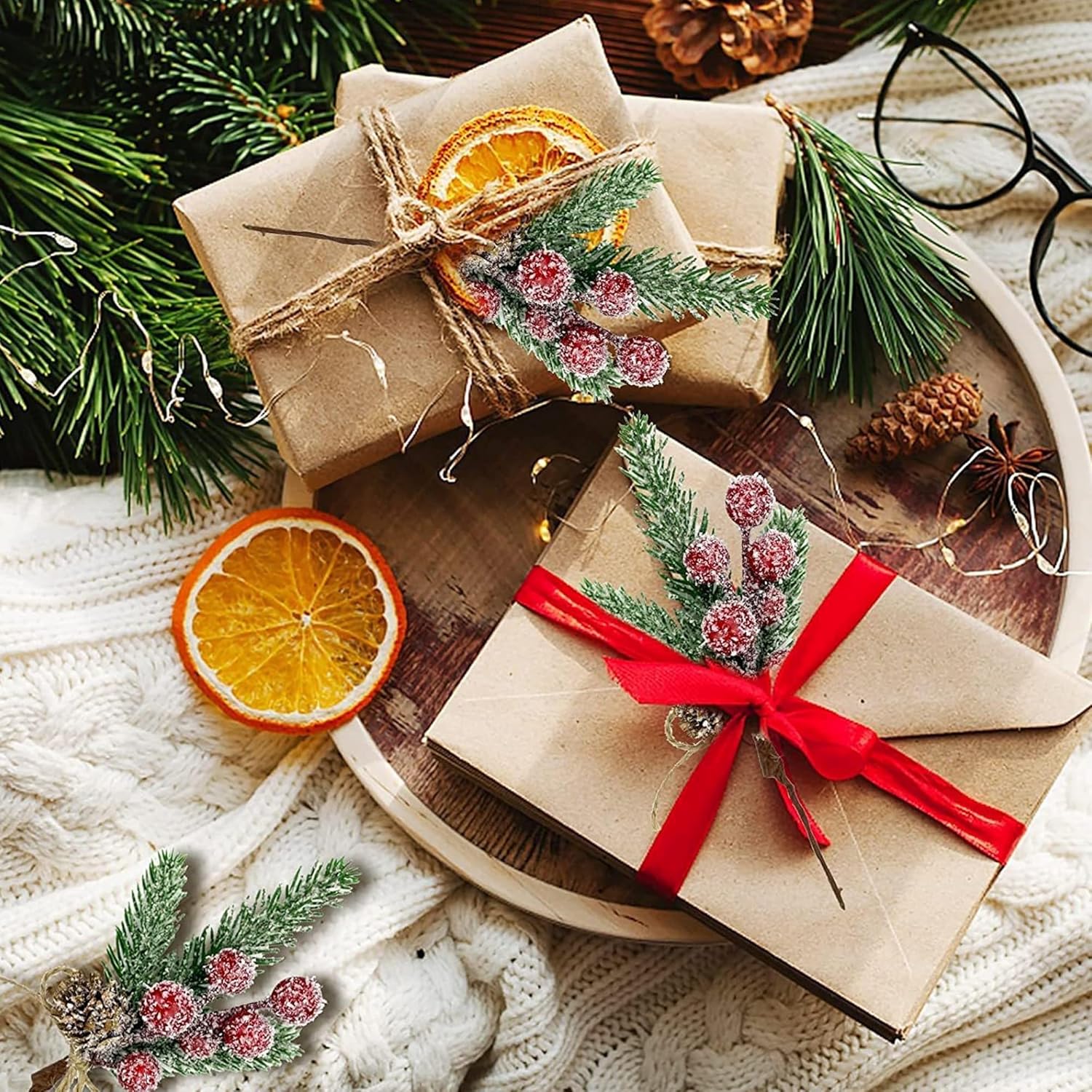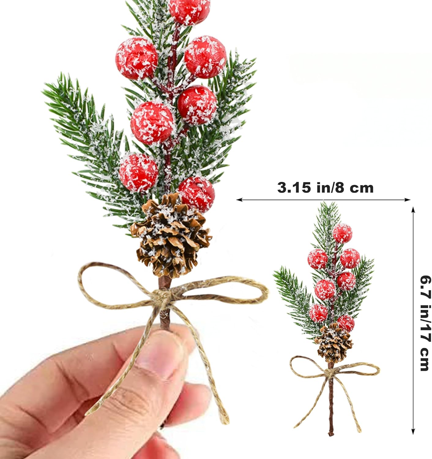 12PCS Christmas Berries Pine Cones Artificial Tree Picks Christmas Decorations with Snow Covered Evergreen Pine Branches for Holiday Family Gathering Craft Wrap Decor