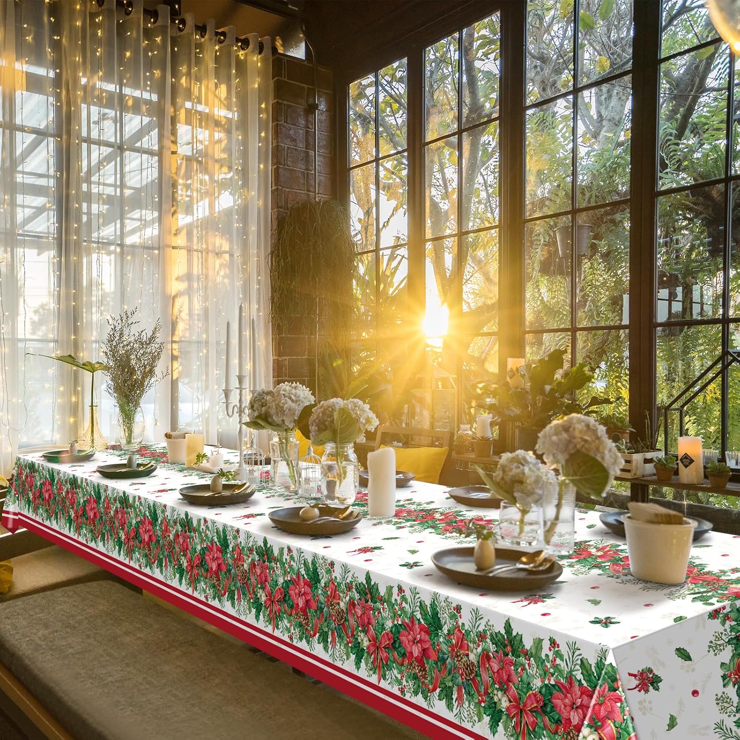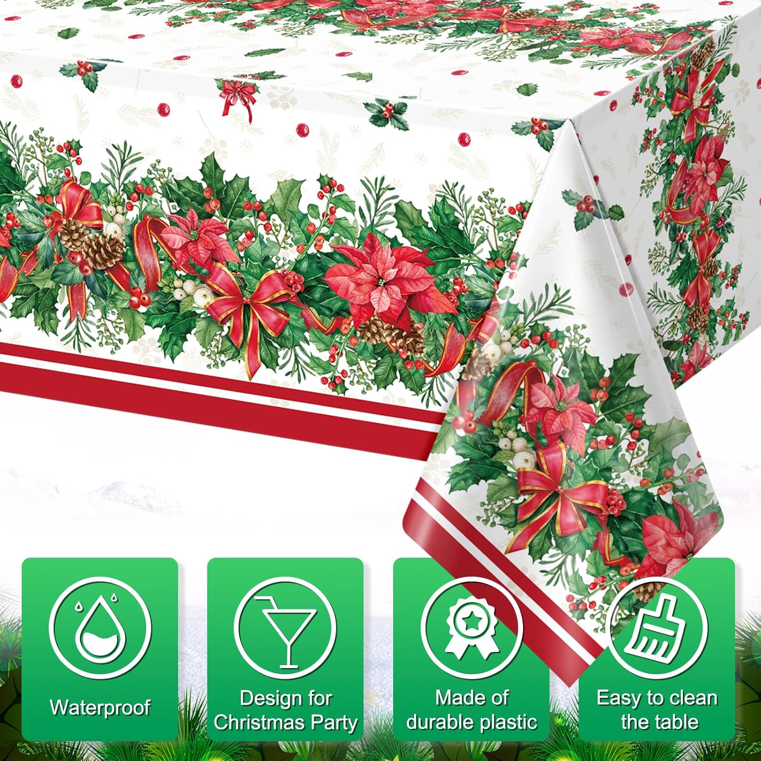 Package Includes: you will get 12 pieces of rectangle Christmas tablecloths,which printed with 3 natural and beautiful holly and poinsettia garlands on white backdrop,ideal for decorating your Christmas party,bring you a enjoyable experience.Sufficient quantity can well meet your large party decoration use and replacement needs.Quality Material: each Christmas holly berry table covers measures approx 137 x 274 cm/ 54 x 108 inches,which fits for most rectangle 8-10 seats tables,they are made of quality and thick plastic material, printed with clear pattern, reliable and won't tear easily, lightweight and portable, waterproof and stain resistant, so you can use them with confidence.