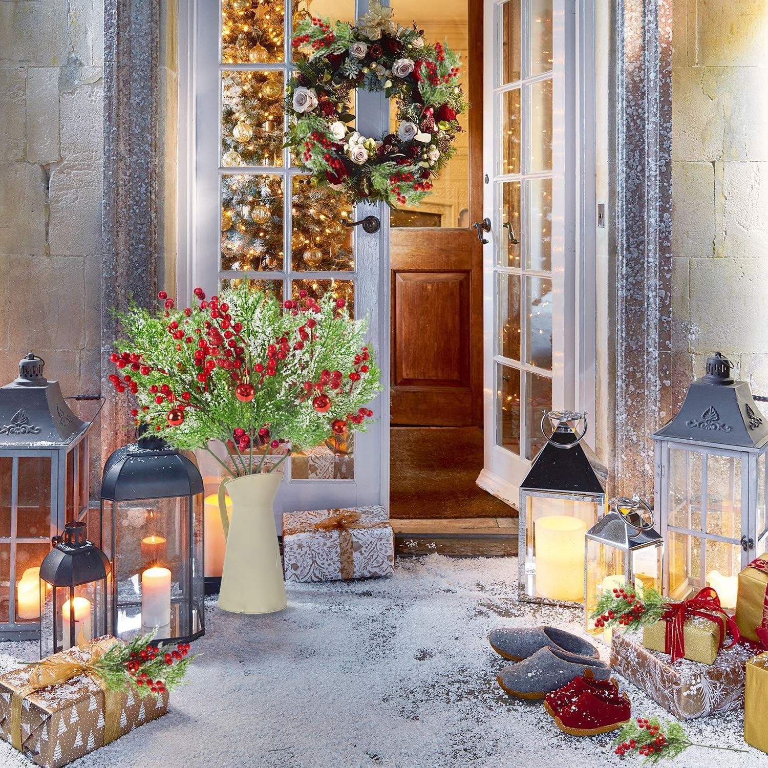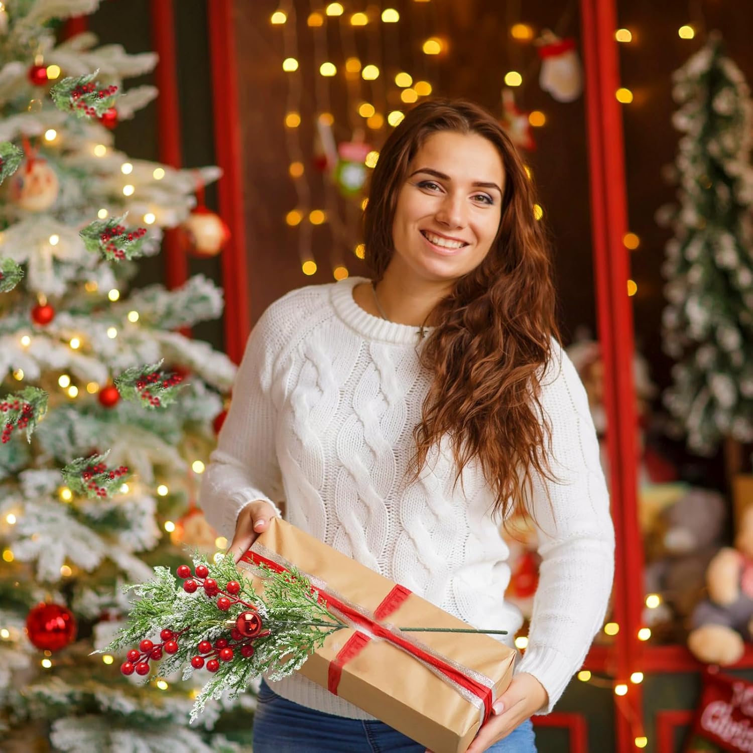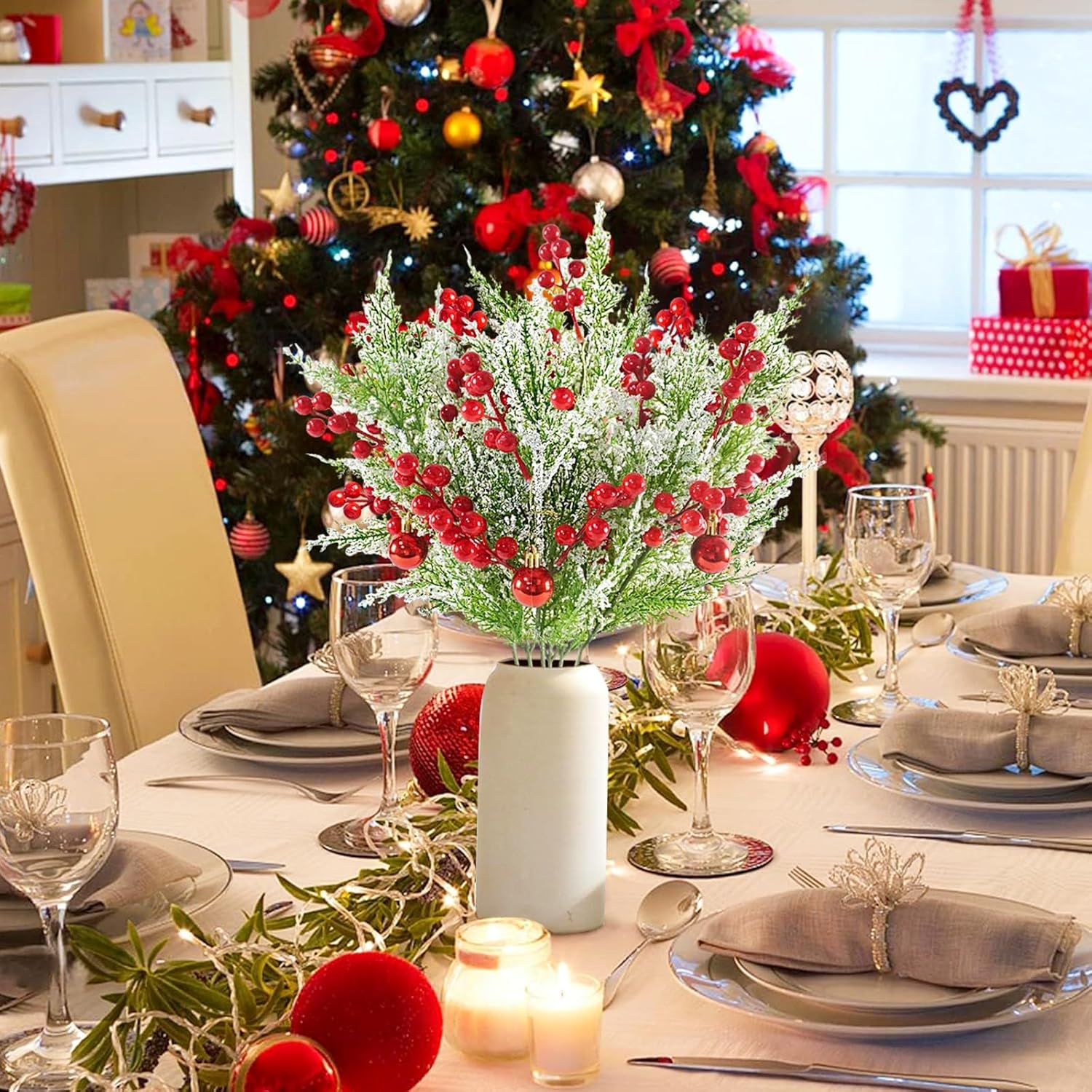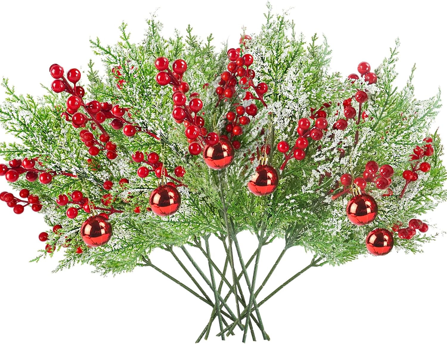 12pcs Snowy Artificial Cedar Picks, 19.5" Frosted Faux Cedar Spray Branches with Berries & Ring Bell Plastic Christmas Cypress Greenery Pine Stems for DIY Garland Christmas Tree Holiday Decor