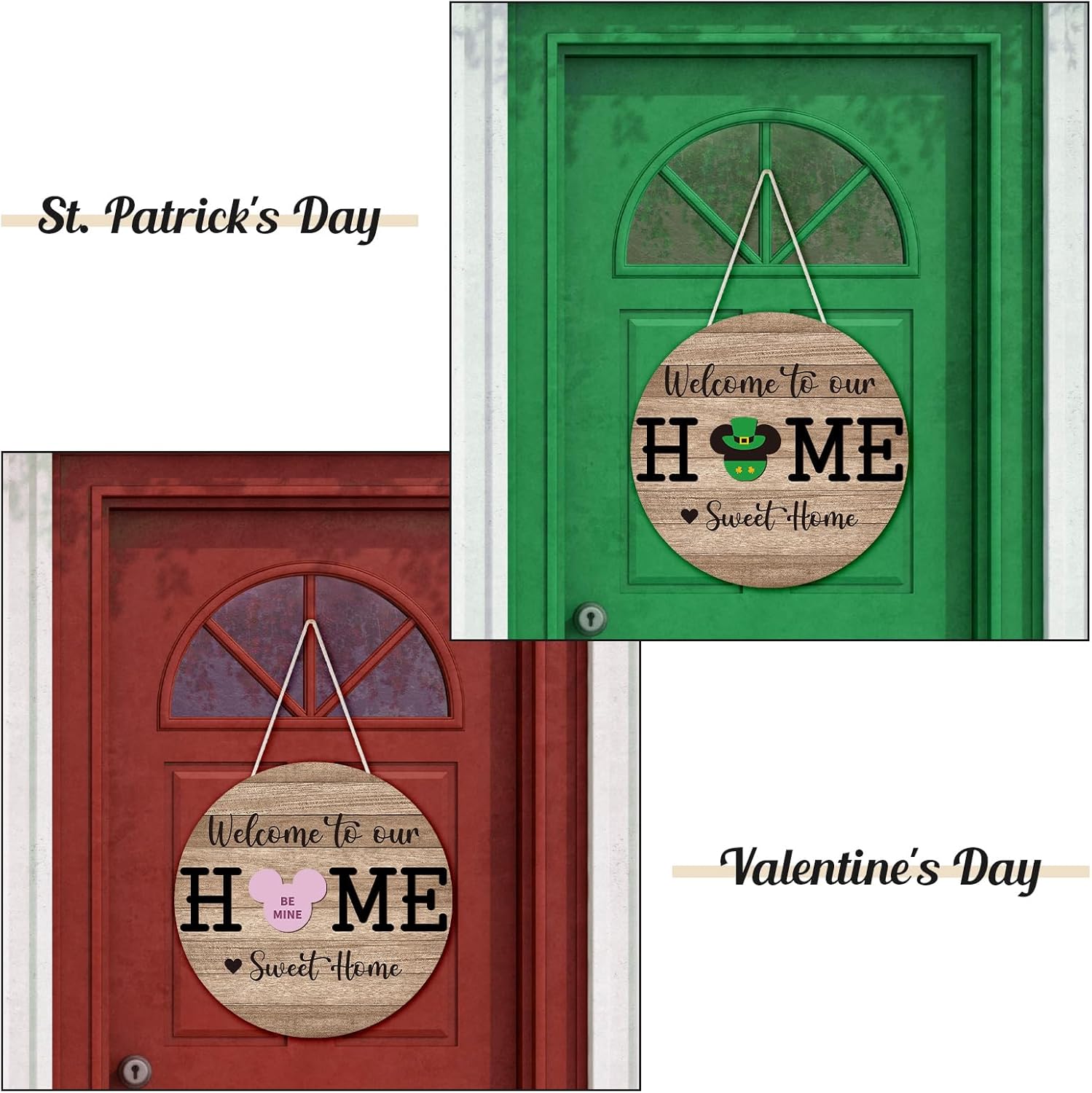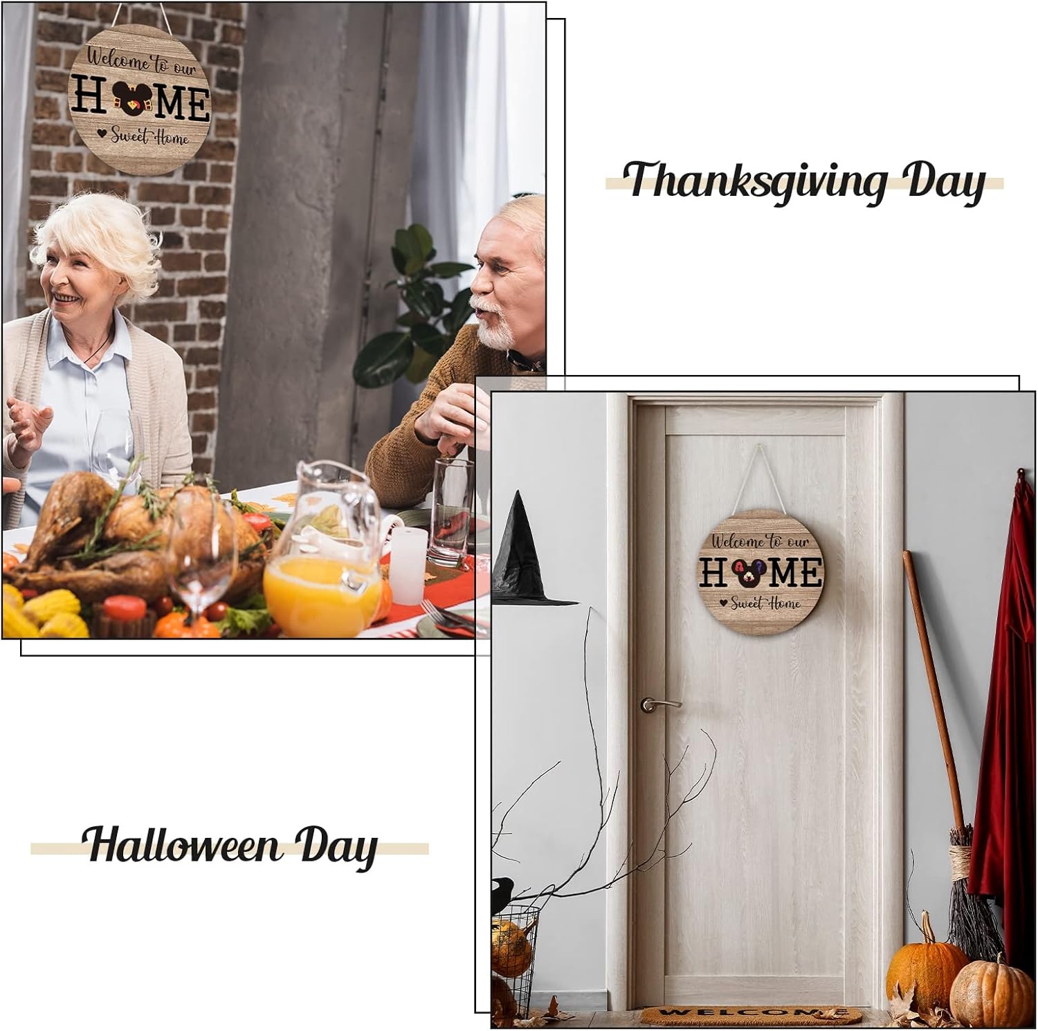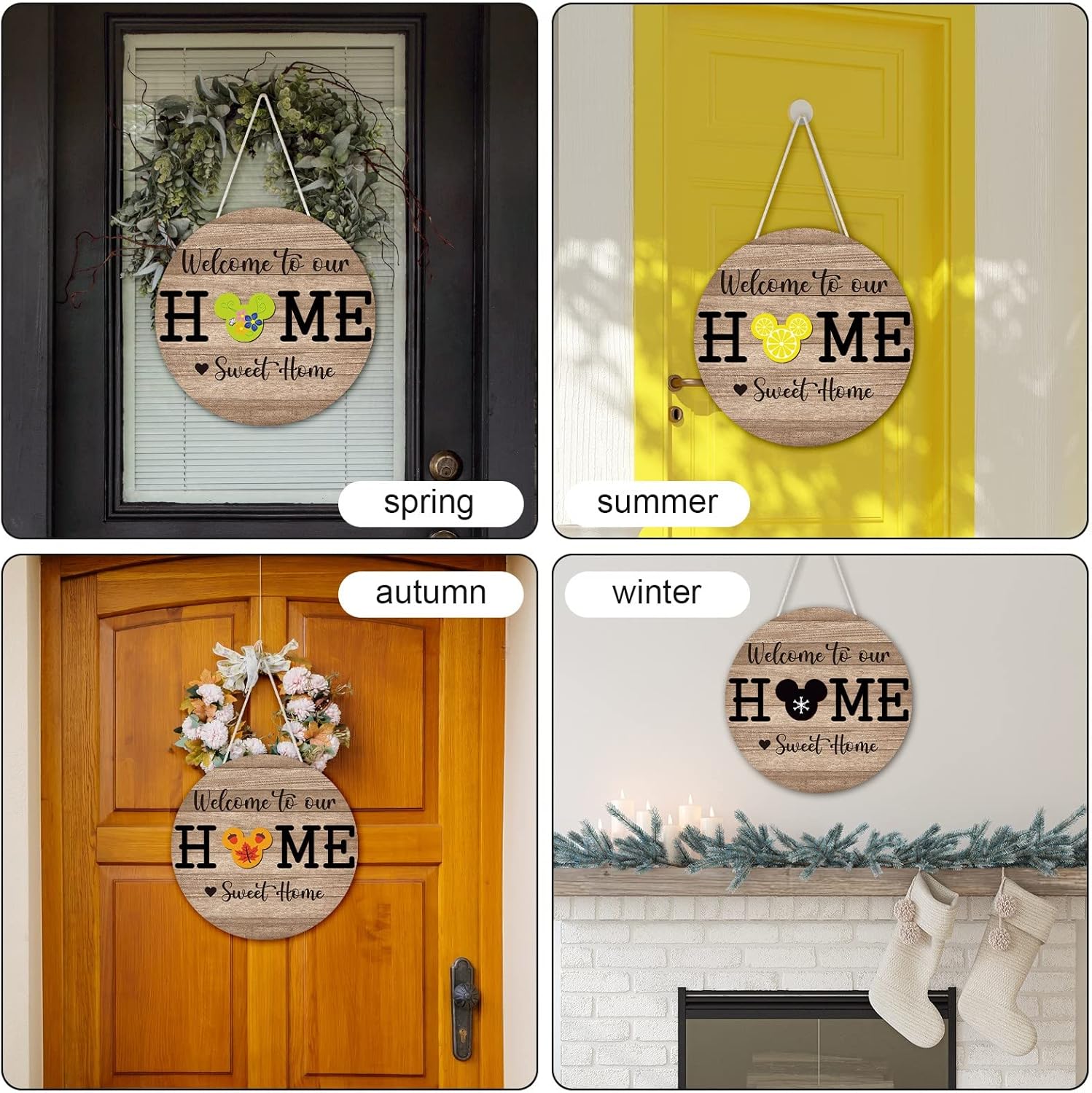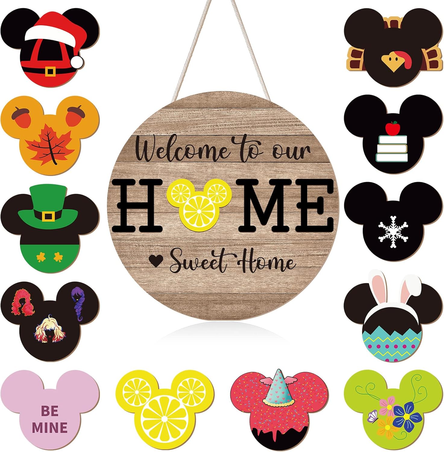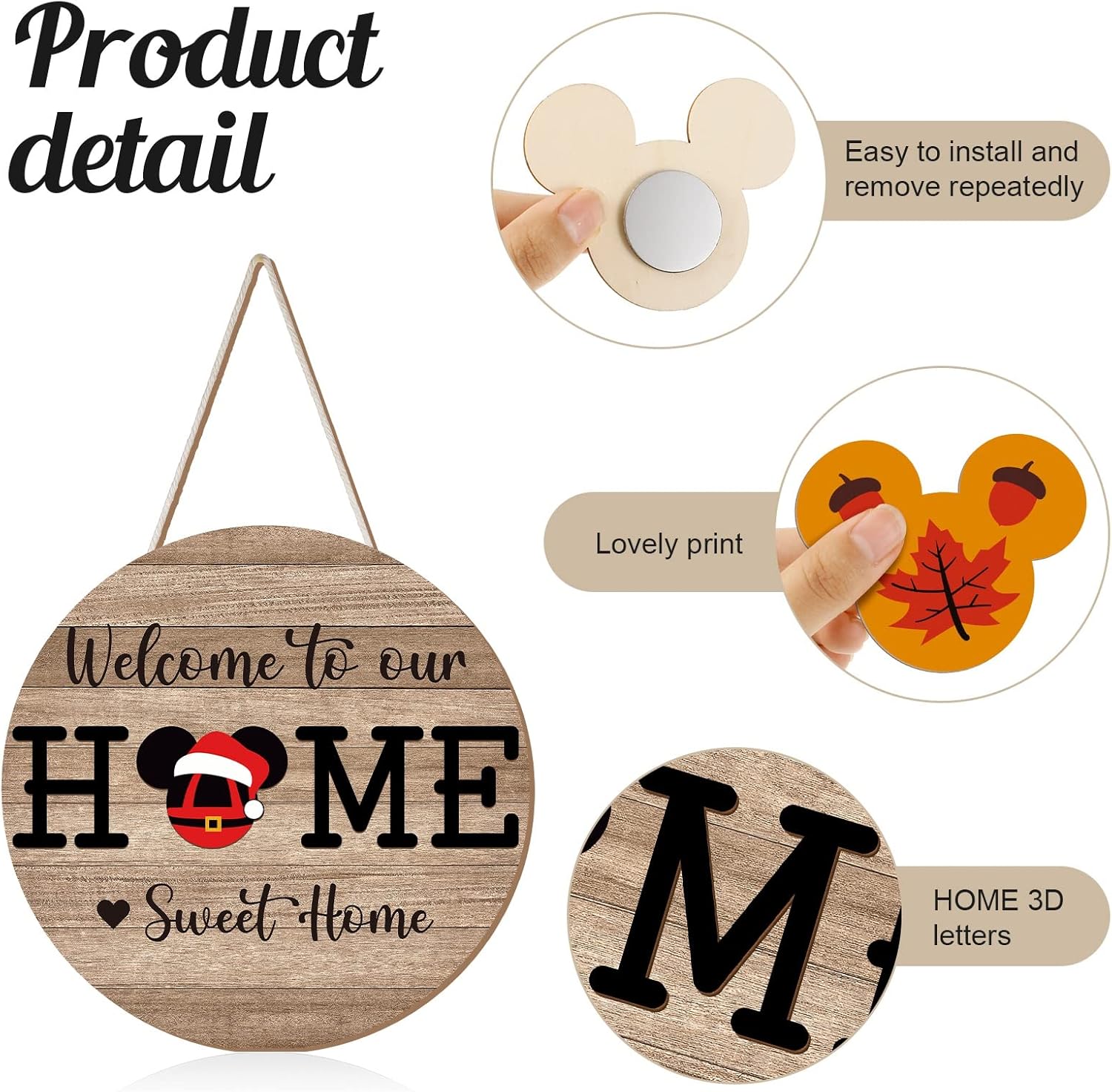 Products include: you will receive seasonal door sign set, including 1 wooden door sign printed with Welcome to our home and 12 interchangeable seasonal signs, the home is designed in a cute mouse style with festive elements of spring, summer, autumn and winterPractical size: Halloween mouse welcome door sign home decoration size is about 30x30 cm/11.8x11.8 inch, replaceable piece height is 8cm/3.14inch, practical large size door sign suitable for hanging decoration in front door, porch, back door, bedroom, fireplace wall, etc