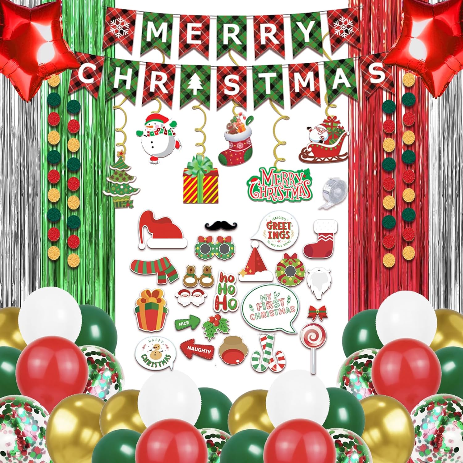 131 Pcs Christmas Decorations Indoor, Christmas Party Supplies - "MERRY CHRISTMAS" Banner, Photo Prop, Balloon Party Kit, Hanging Swirl, Fringe Curtain