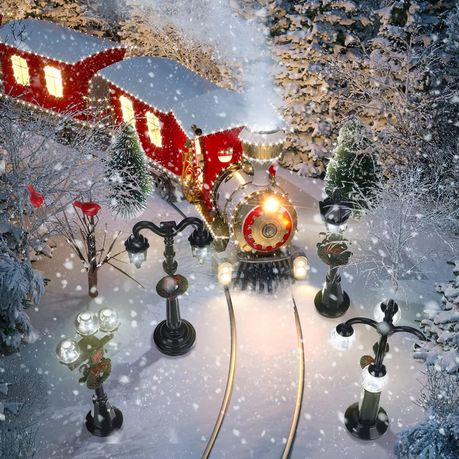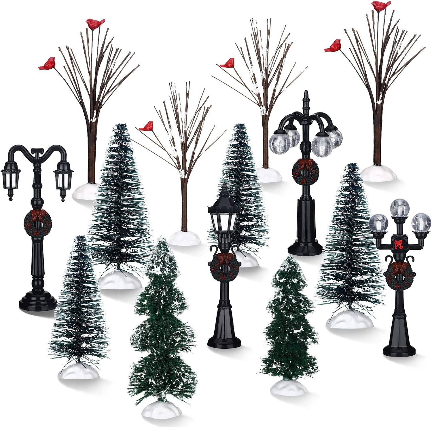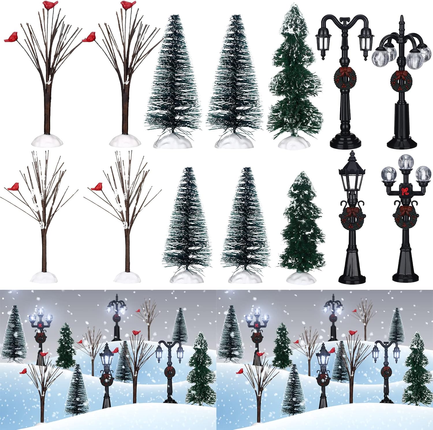 14 Pcs Christmas Accessories Village Figurine Miniature Pine Trees Snow Artificial Christmas Trees Bare Branch Trees Street Lights Lamps for Xmas DIY Crafts Winter Room Landscape (Fresh Style)