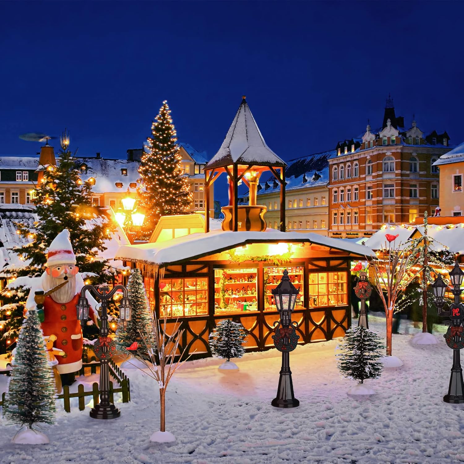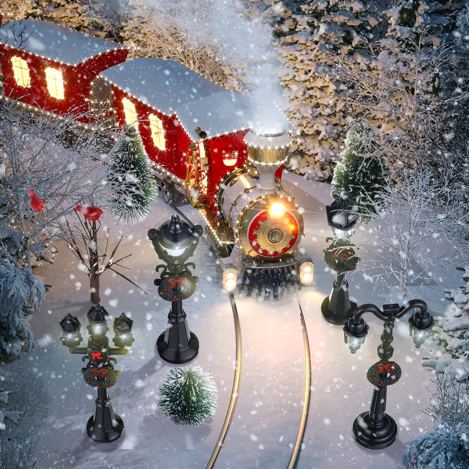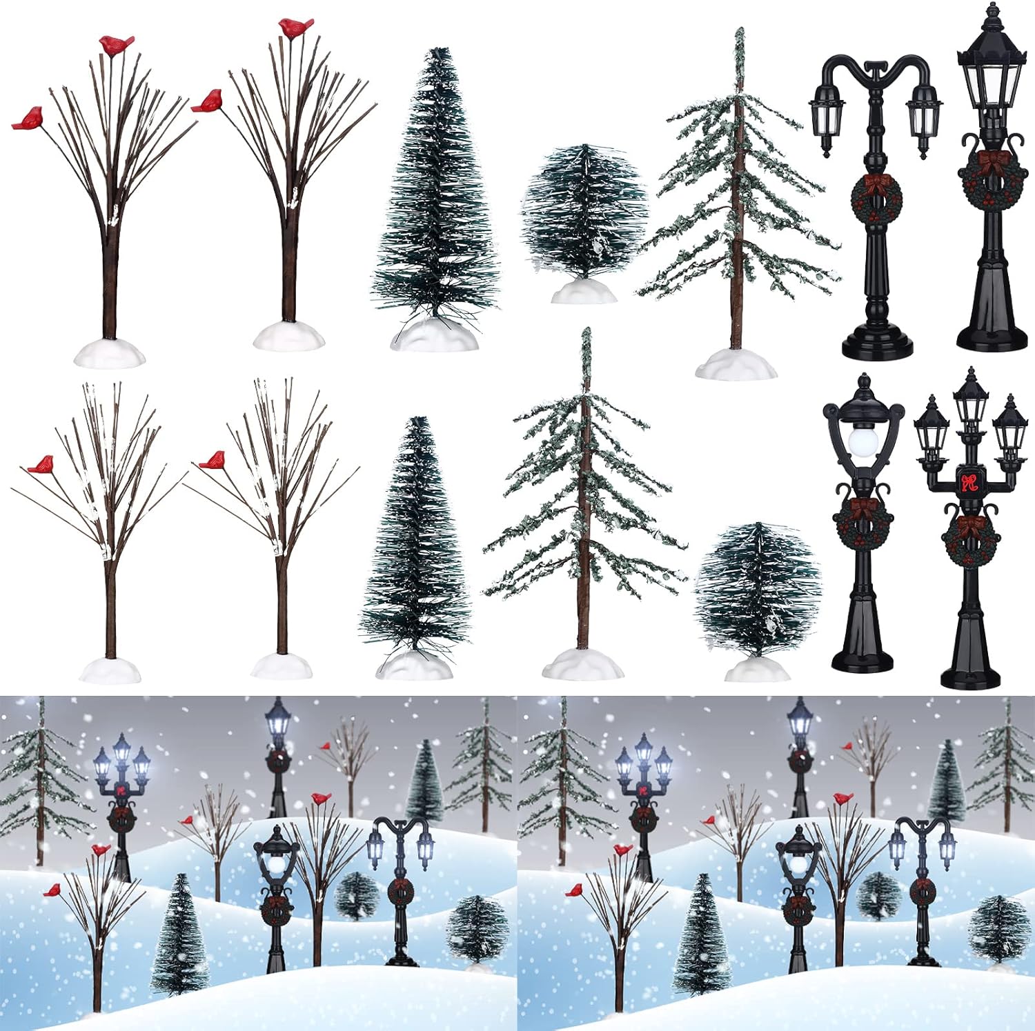14 Pcs Christmas Accessories Village Figurine Miniature Pine Trees Snow Artificial Christmas Trees Bare Branch Trees Street Lights Lamps for Xmas DIY Crafts Winter Room Landscape (Vivid Style)