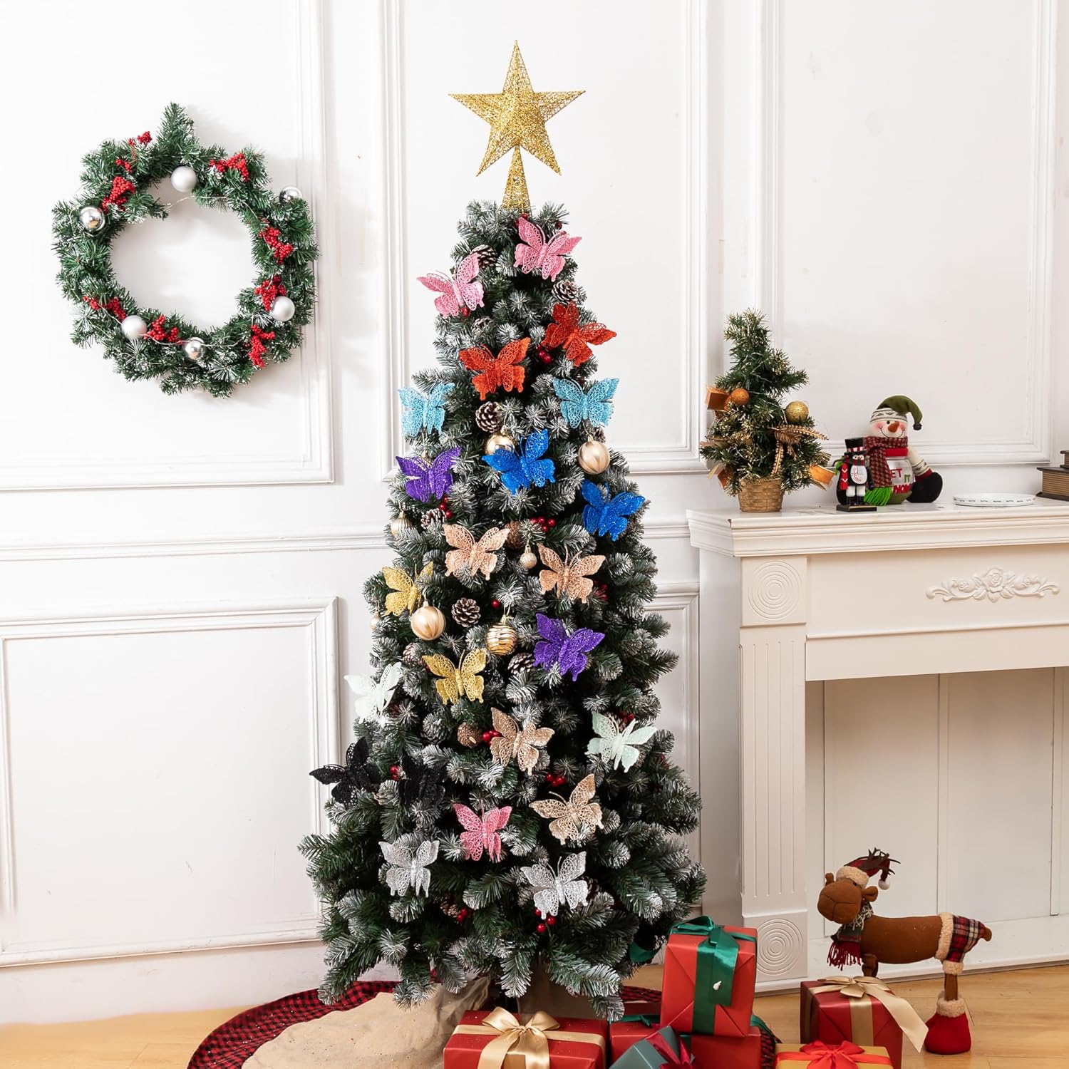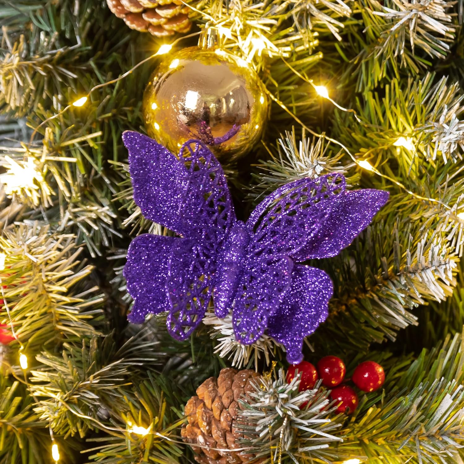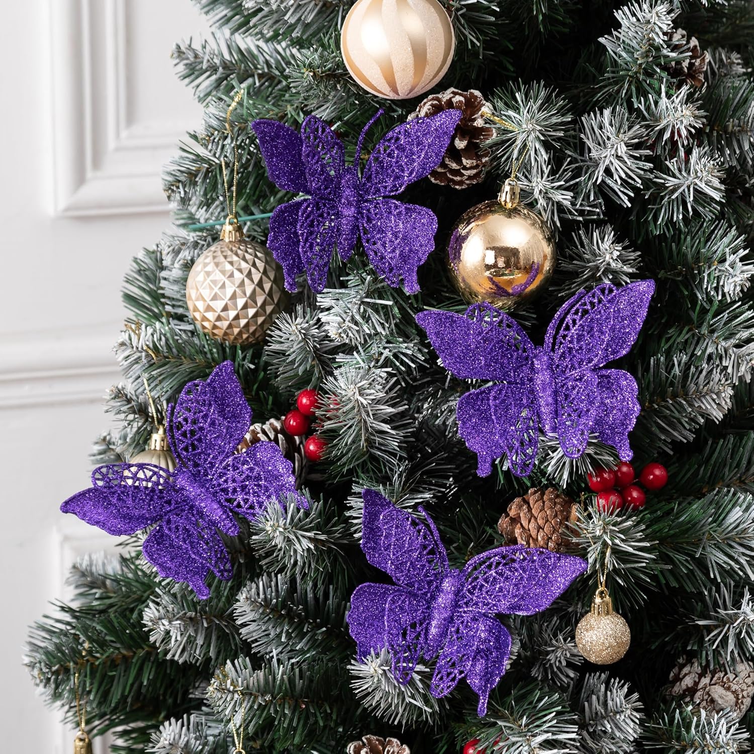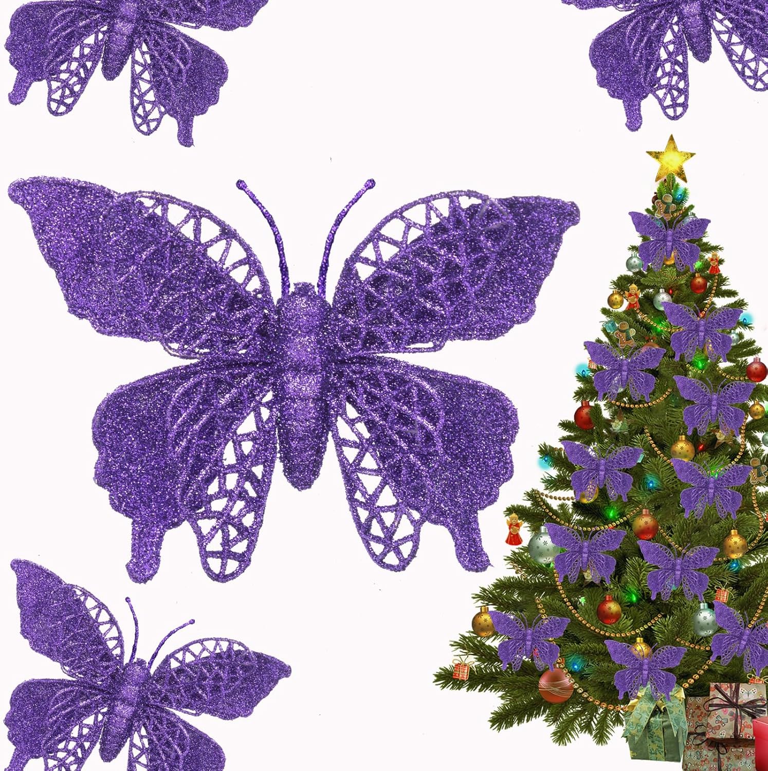 15 PCS Glitter Christmas Tree Butterfly Ornaments, Hollow Butterfly Christmas Decorations with Clips, Artificial Butterfly Ornaments Decoration for Christmas Tree, DIY Xmas Wreath Decor - Dark Purple